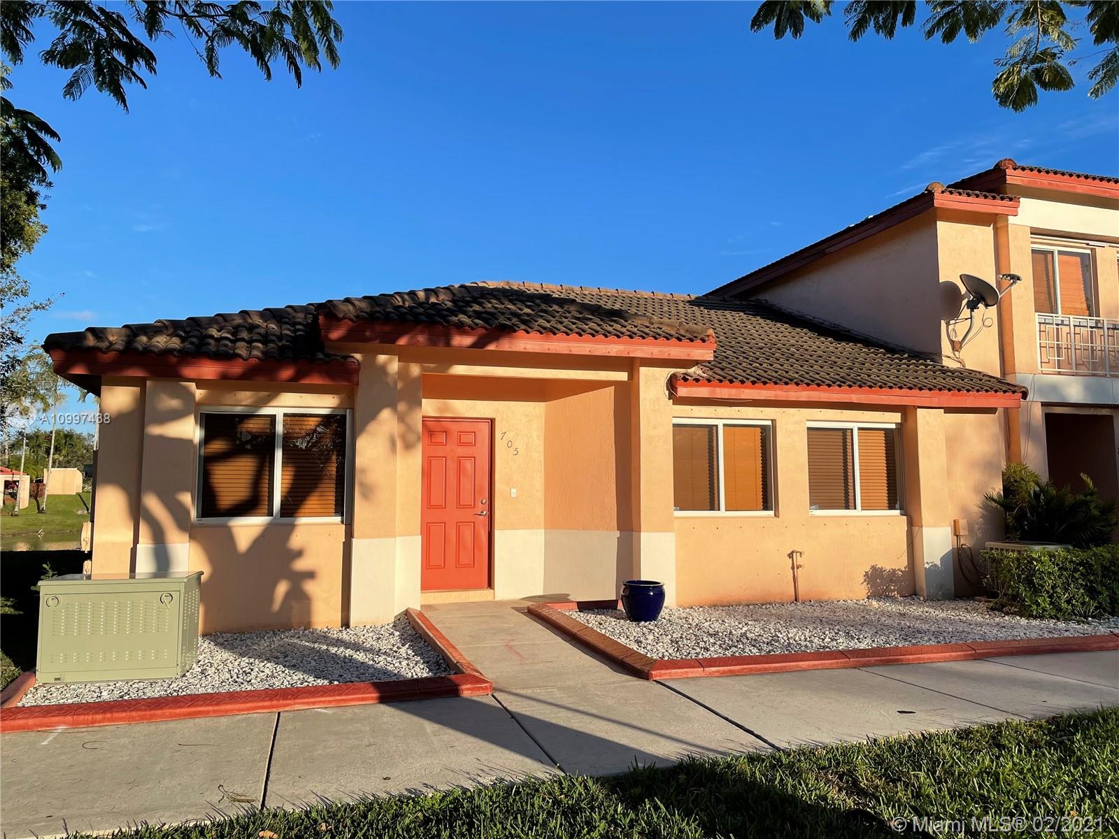 Lovely 1 story corner 3/2 Villa in Malibu Bay. Master bedroom overlooks the lake through large screen patio. Tile in main areas and laminate on bedrooms. Unit has brand new water heater, A/C and most appliances. Cable and internet included in the monthly association. Spacious open Kitchen. 2 assigned parking spaces up front plus plenty of guest parking. Gated Community offers 24 hr patrol, pool, tennis court, fitness center and kid’s playground.