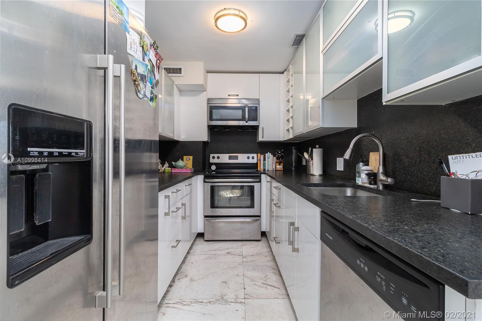 Bright and fresh 1 bedroom apartment in cool and newly condo converted Morris Lapidus building in Belle Isle. Renovated with sleek carrara marble floors throughout with semi-open kitchen. Spacious bathroom with opening to admire the views with natural light. Enjoy spectacular sunrises and soothing park and bay views. Condo has an spectacular pool on the bay with an enormous deck to appreciate unobstructed sunsets all year long. Fantastic location in the Venetian Causeway right across the Standard Hotel, walking distance to Lincoln Road and trendy Sunset Harbor area. Easy to show!