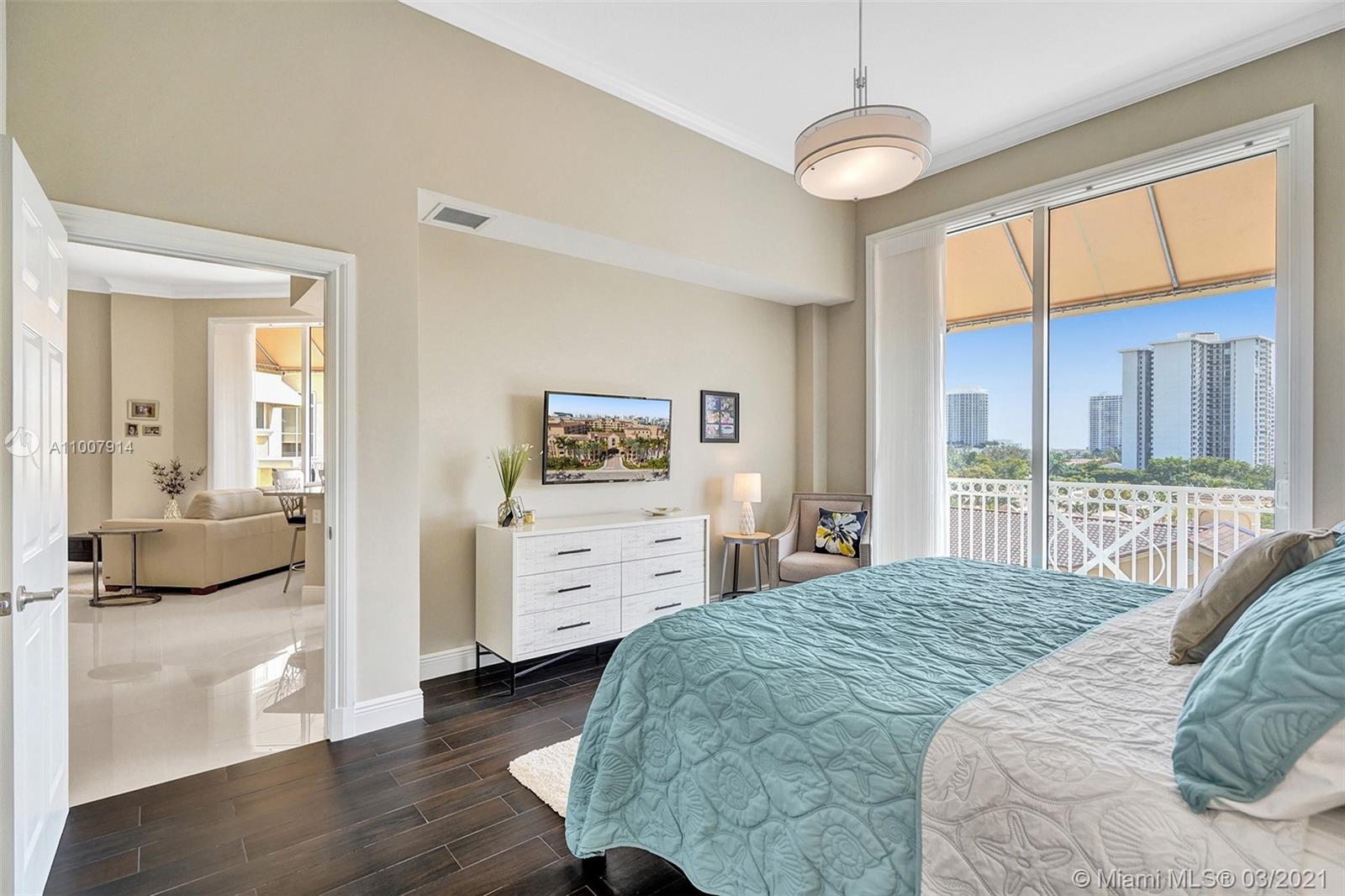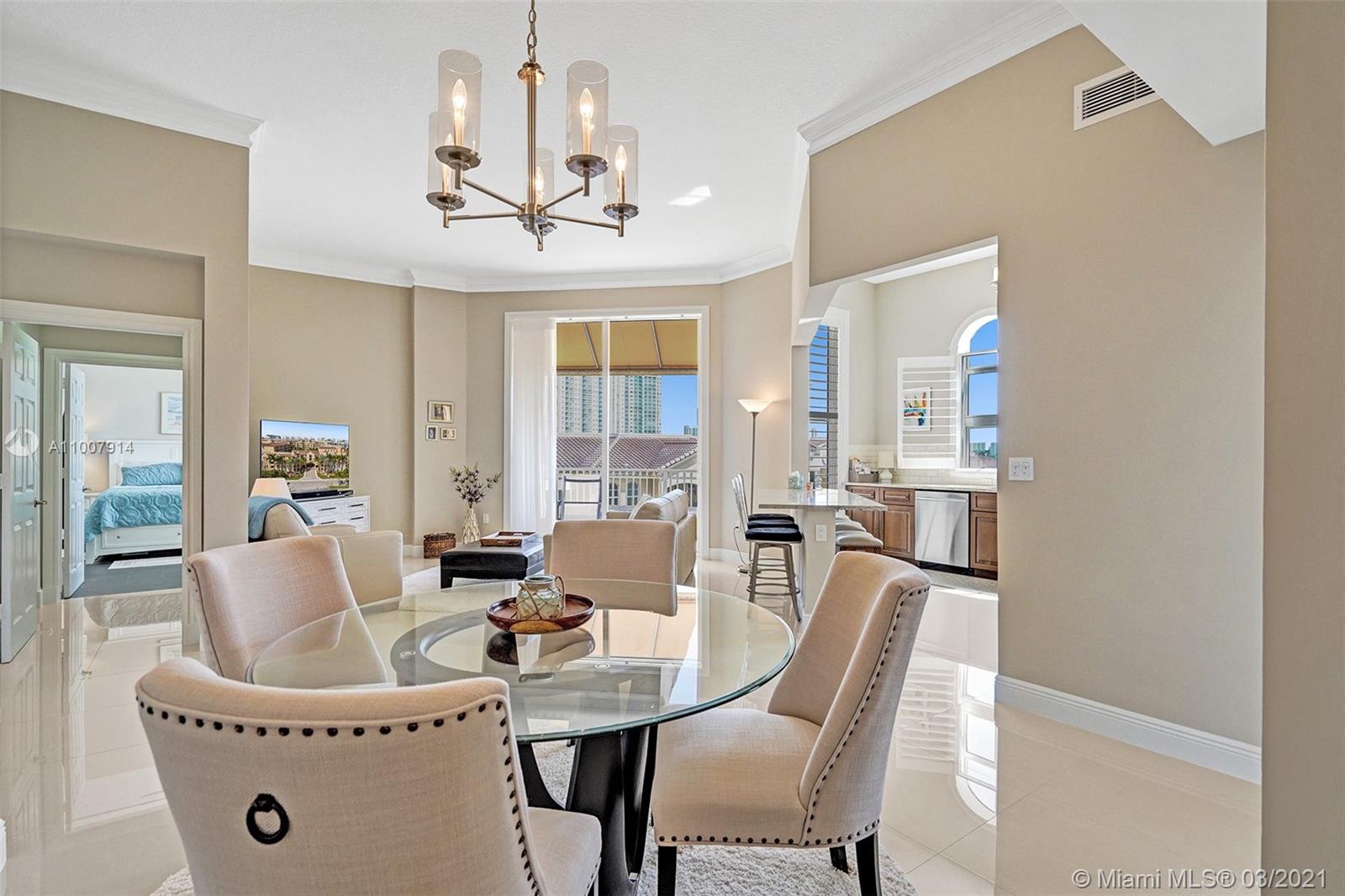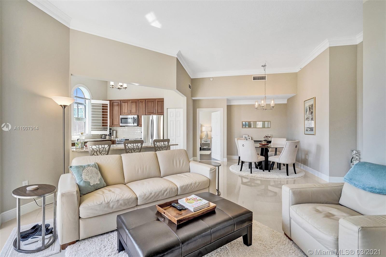 Imagine waking up to the feeling of vacation mode. This home gives you that feeling. Enjoy this top floor newly renovated luxurious condo with 12 foot ceilings. Sit on your balcony while enjoying your morning coffee and take in the breathtaking pool and city views. Get your steps in walking waterside along the newly renovated dock or stay in the AC and start your day in the gym overlooking the water. This is the home that all your friends and family will want to come to enjoy the dinner parties, birthdays or for the big game. Move in ready, all this high-end furniture stays! Just a short walk to Aventura Mall, Publix and restaurants. Brightline station at Aventura Mall is expected to be done by Fall 2021 to make travel even easier. Contact listing agent for private showings.