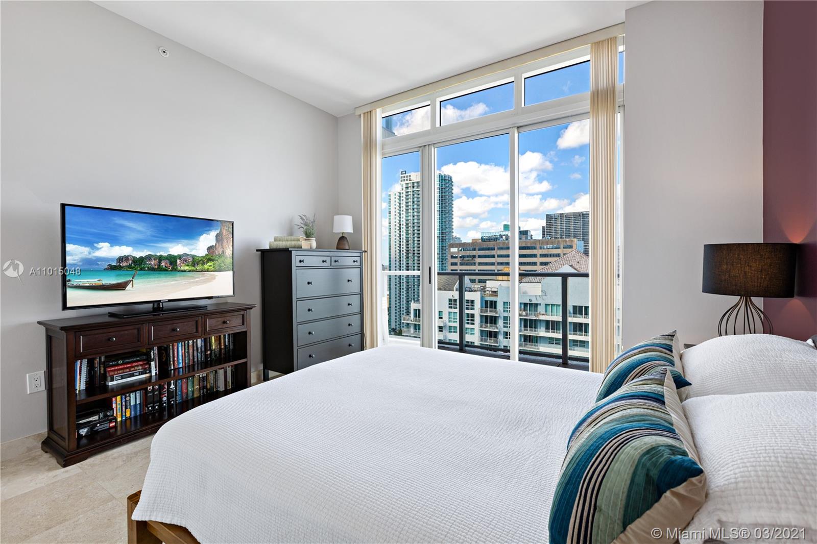 Gorgeous 1BR 1BTH penthouse level unit with 10ft high ceilings. Amazing water views of the ocean and Biscayne Bay. 730 living area sq ft. Full kitchen remodel (2017) including new cabinets, quartz countertops/backsplash, stainless steel Kenmore appliances (fridge, stove/oven, dishwasher, microwave) as well as GE stacked washer/dryer. 18” marble tiles throughout. Custom cabinetry in bedroom/front hall closet. Includes TWO (2) parking spaces (1 assigned, 2nd is valet at no charge). Excellent amenities including fitness center with water views, pool/Jacuzzi hot tub, tennis/racquetball courts, club room, on-site convenience store and restaurant. Additionally, valet/concierge services are offered. Recent building improvements include glass railings on the balconies, lobby and hallway updates.