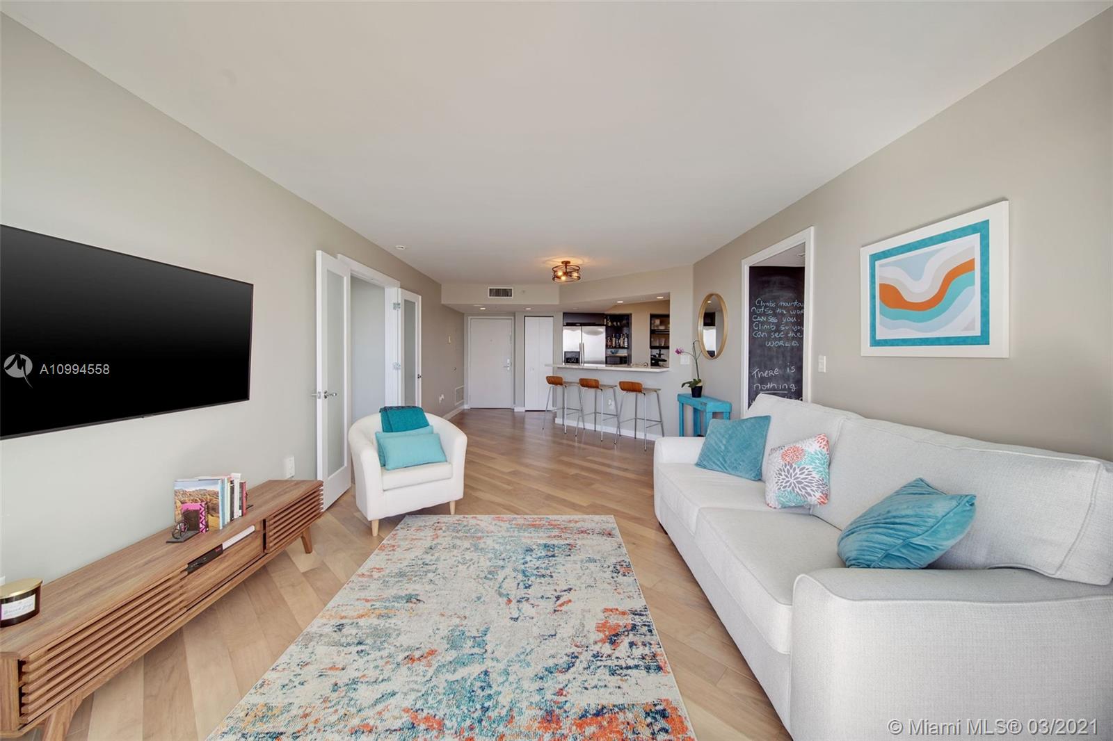 Light filled 2 bedroom /2 bathroom home in the lovely Sunset Harbour area! This beautiful unit is cradled in light that shows off it's beautiful wooden floors, modern kitchen and spacious layout. Unit 2103 has a magnificent view of both the city and the bay from all rooms in the home. The master bedroom is spoiled in luxury with a walk-in-closet and the bathroom including both shower & tub. It's kitchen is spacious and modern with a hint of practicality!
