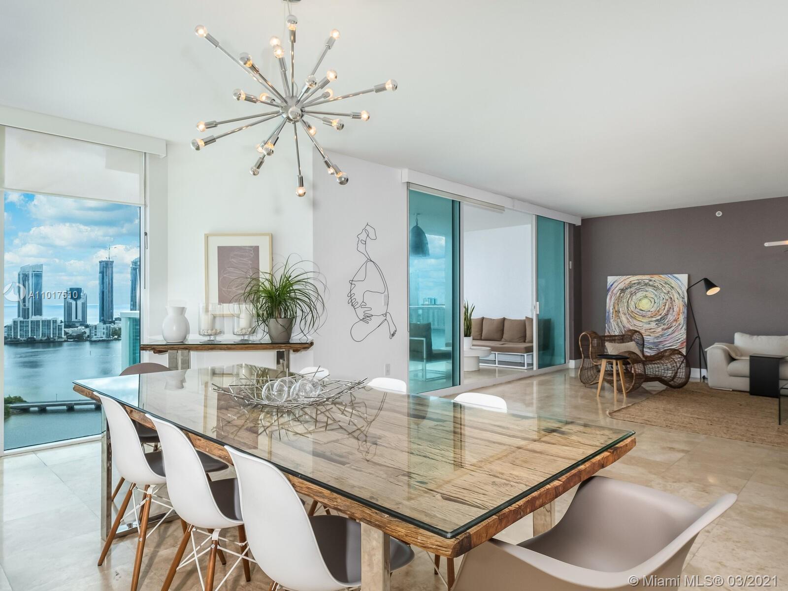 Enjoy this spacious and beautifully renovated 3Bed/3.5Bath+Den flow-through residence in luxury Peninsula One. A private elevator takes you to the 25th floor where you are greeted by walls of glass leading to an expansive balcony with unobstructed bay, Intracoastal and direct ocean views. Special features: marble and porcelain floors, open bright kitchen with s/s appliances, formal living and dining, media/den, powder room and separate laundry w/maids quarters. Master bedroom has a sitting area, his/hers custom built closets, access to a balcony with gorgeous sunset views. Mesmerizing vistas from every corner of the home. 5 star amenities: 2 pools, 2 gyms, hot tub, sauna, spa, BBQ, tennis courts & playground. 1 parking space+valet. Storage. Best location in the City of Excellence, Aventura