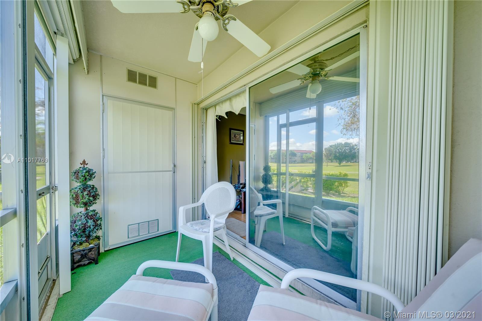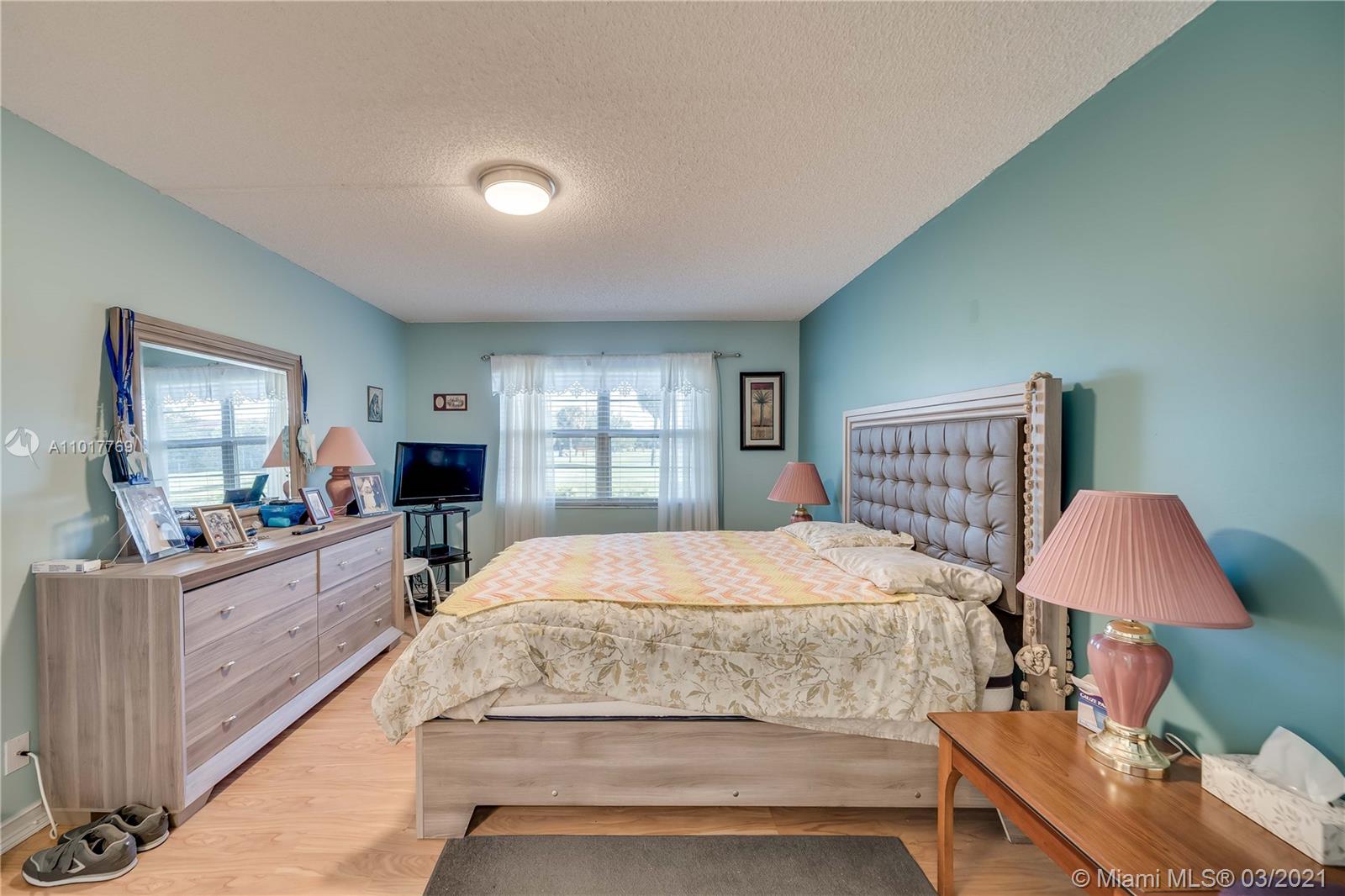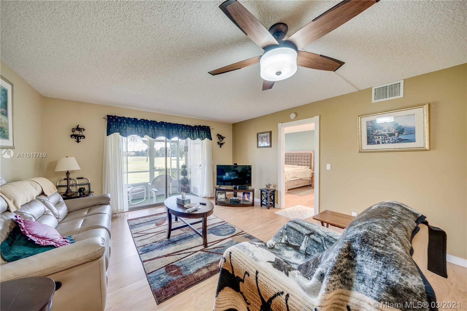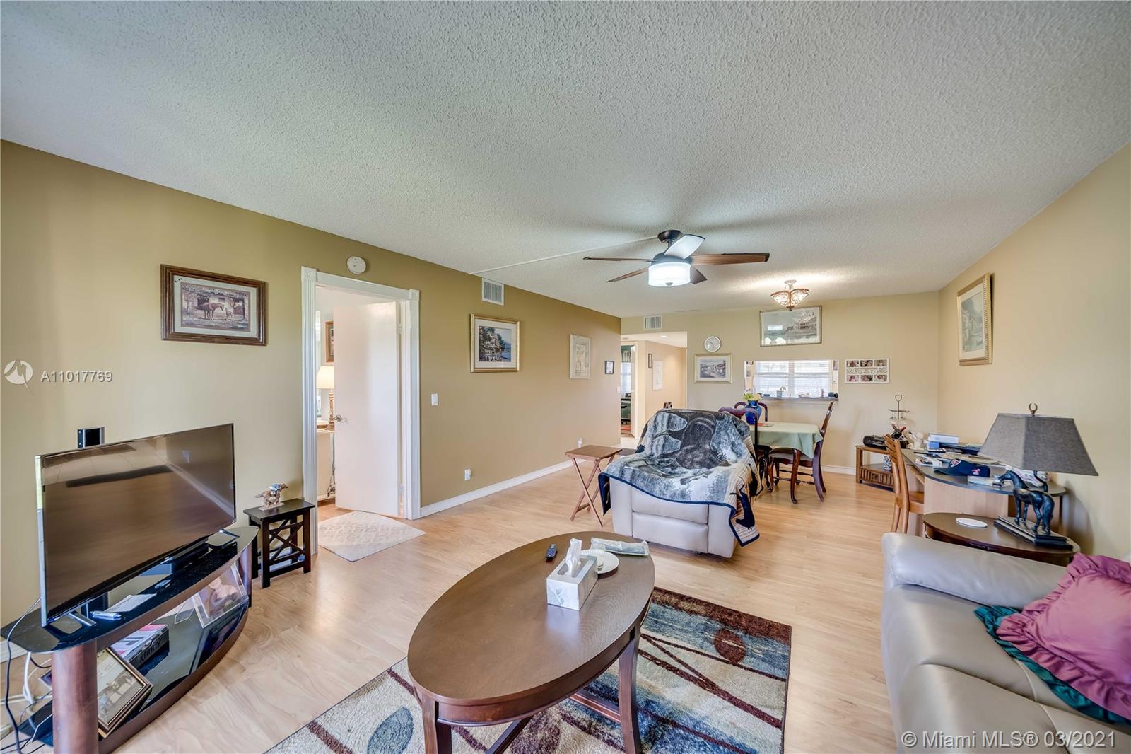 Wow! Don't miss the chance. To live in this maintained in pristine condition 2 bed 2 bath ground floor. Beautiful kitchen with contemporary designed upgrades. Exquisite designed solid wood cabinets that has granite countertop. Great layout with a dine-in kitchen, spacious master bedroom that has a walk-in closet. Laminate wood floors throughout the condo except in the kitchen and foyer. Upgraded master bathroom. Northern exposure view from the patio. Which looks onto the manicured golf course landscape with a scenic nature view from the patio - great to sit out when you just want to relax and watch the golfers. The unit is equipped with a washer and dryer inside. Accordion hurricane shutters and tankless water heater. The satellite pool is directly across from the building.
