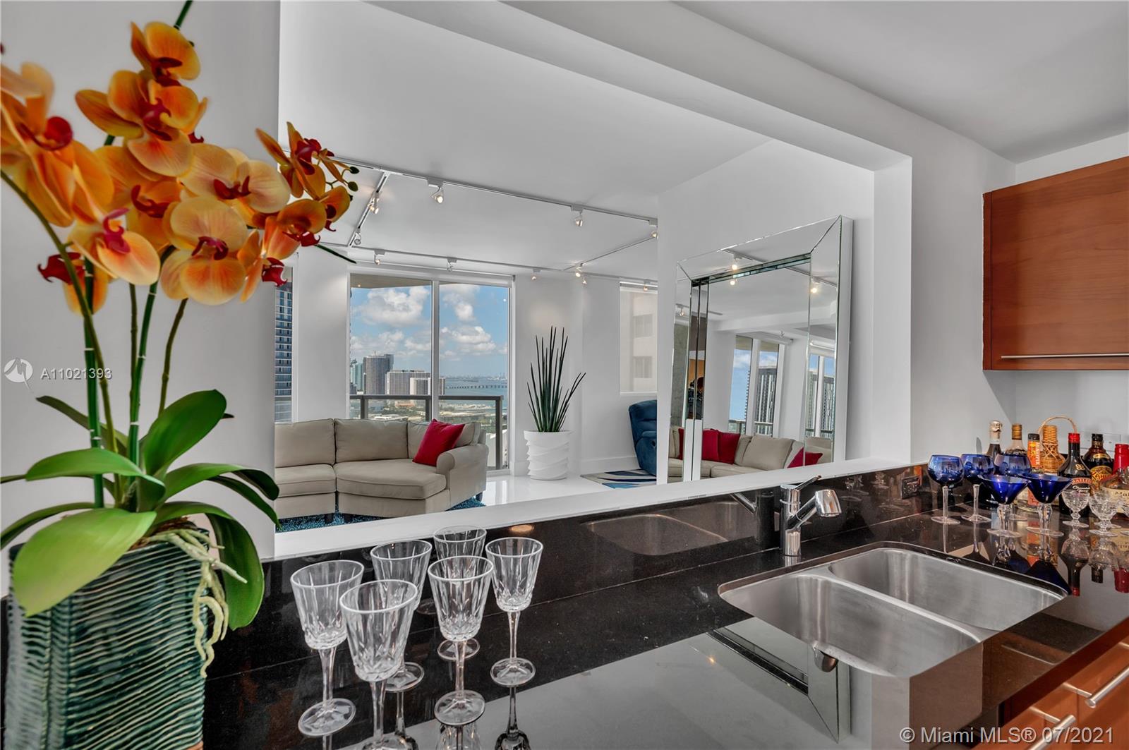 Unique, two combined units offer 180-degree panoramic water and city views! Sitting in the large living room area you can look to the East and view Biscayne Bay and the Atlantic Ocean. Turning to the West you can view Marlins Park and MIA. This custom floor plan is perfect for large families, home businesses, and entertaining. Featured is a large walk-in bar with a sink, microwave, and wine cooler with lots of room for glassware and bottles. Two expansive master suites, one with an oversized walk-in closet. All together there are 4 bedrooms and 4 baths. Vizcayne is directly across from the the Shops at Bayside and within walking distance to the American Airlines Arena and Adrienne Arscht Center for the performing arts! Visit this stunning unit today!