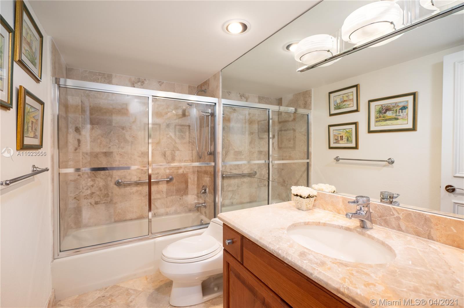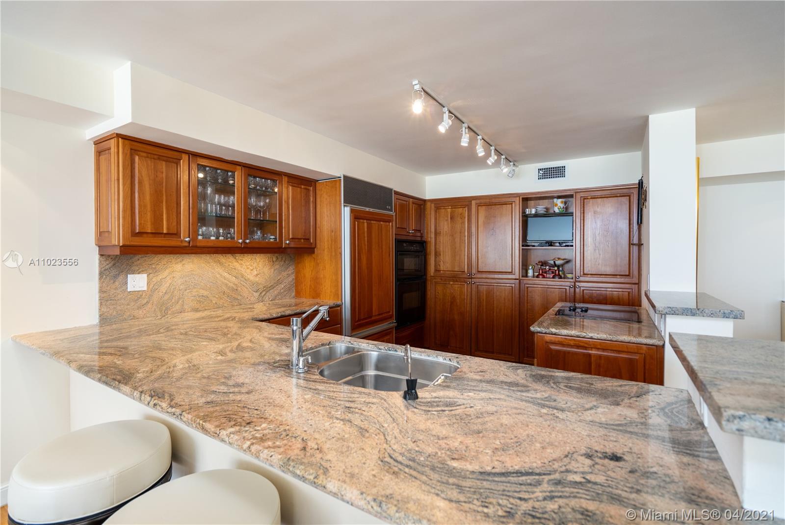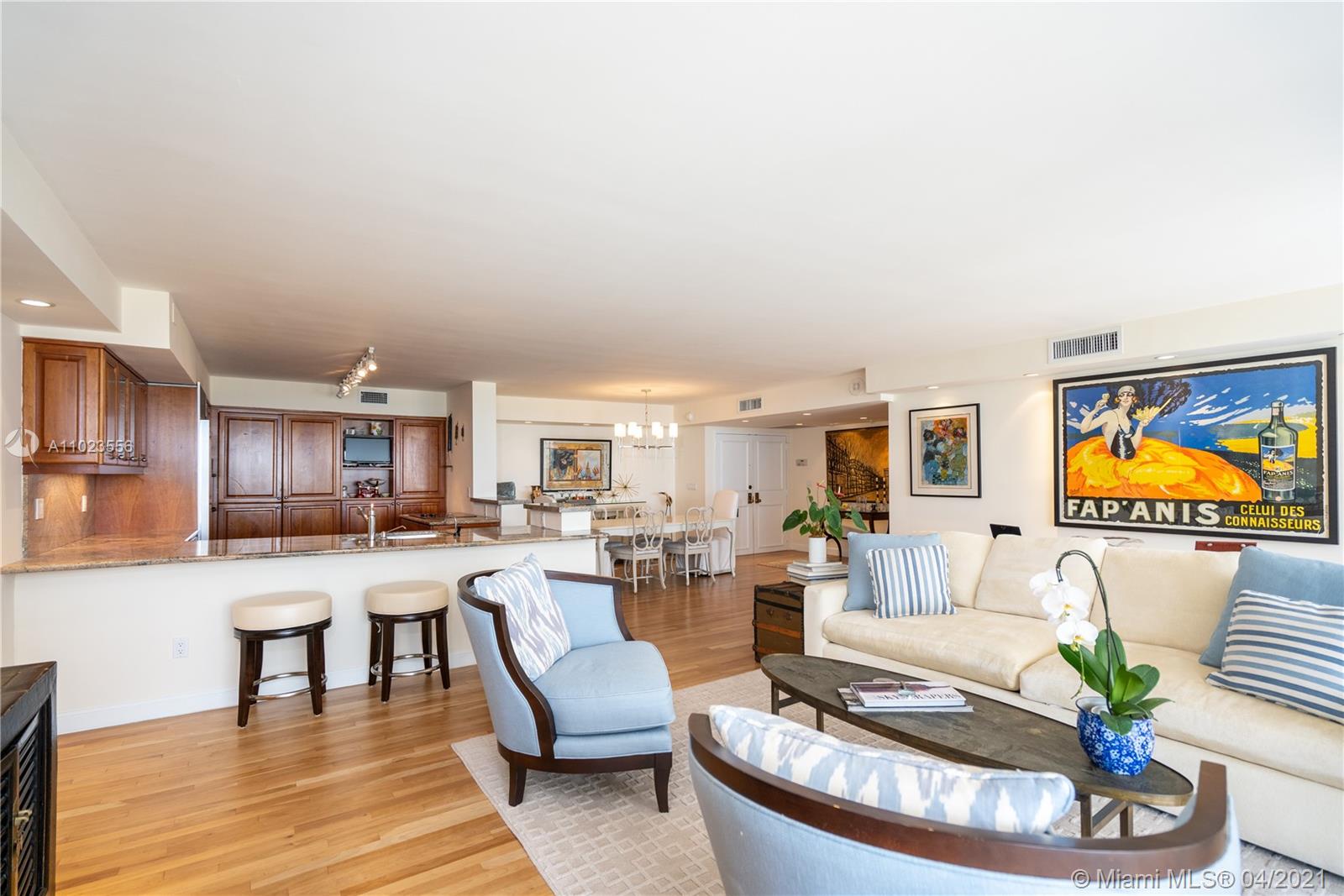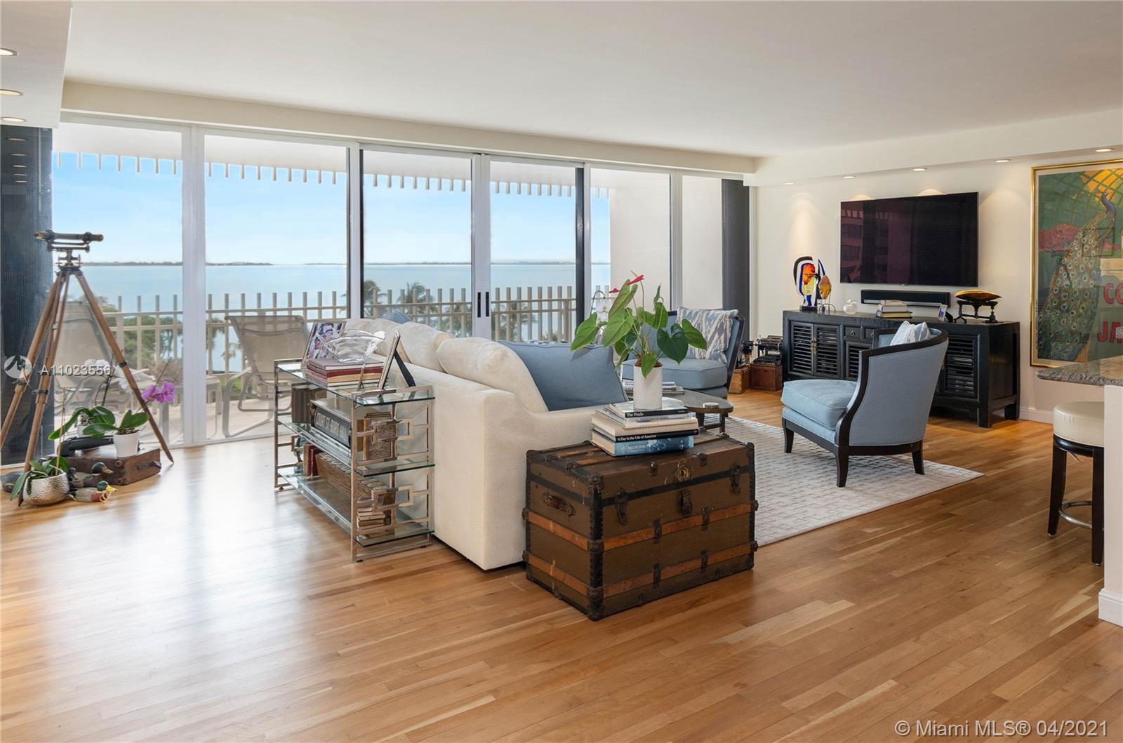 This bright and beautifully updated 2 bedroom and 2 bathroom unit has an open concept with lots of natural light flowing. Enjoy your morning coffee from your private balcony offering unobstructed views of Biscayne Bay, Key Biscayne and the Brickell Skyline. Open gourmet kitchen with elegant cabinets, granite counter tops, and island. Other features include recessed lighting, wood flooring, remodeled bathrooms, and the primary bathroom has double sink vanities, a large glassed shower with marble flooring, a spacious primary suite with a large walk-in closet and laundry room with full sized washer and dryer. Live on a guarded 20-acre island with tropical views and full services resort style amenities. Excluded item: the dining room chandelier.