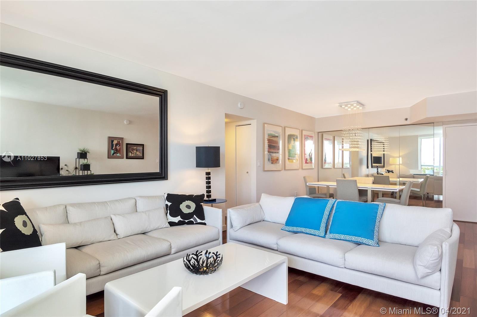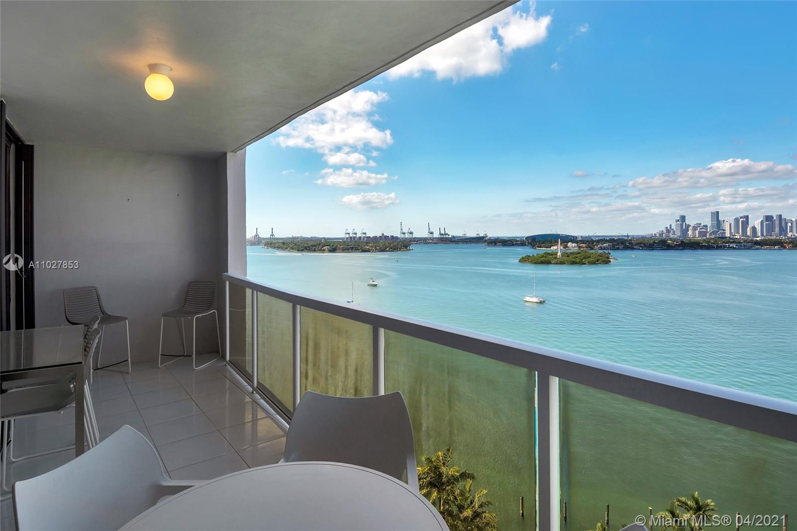 This view is absolute perfection! Finally, a fully furnished, move-in ready 2 bedroom at 9 Island, available immediately with stunning direct bay views from every window! This 2 bed / 2 bath 1,440 SF split bedroom unit has many upgrades including updated kitchen with stainless appliances, full size washer/dryer, wood floors and hurricane shutters. Master bath has dual sinks, glass shower and gorgeous marble floors. Access the oversized balcony from the living room, kitchen and guest bedroom. Unit comes with one garage space and extra storage unit. All artwork excluded except bicycle photographs and Andy Warhol print of Jackie Kennedy.