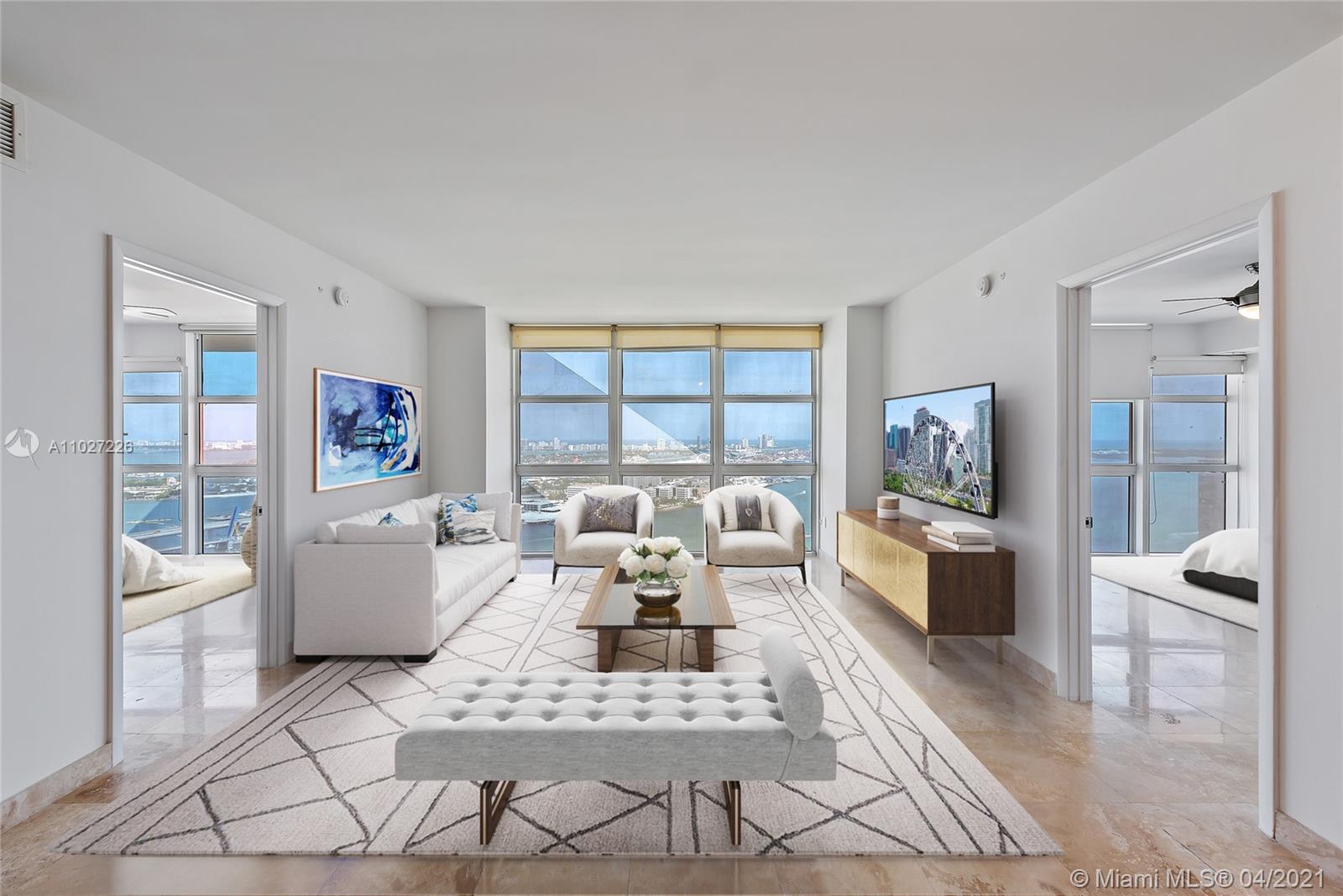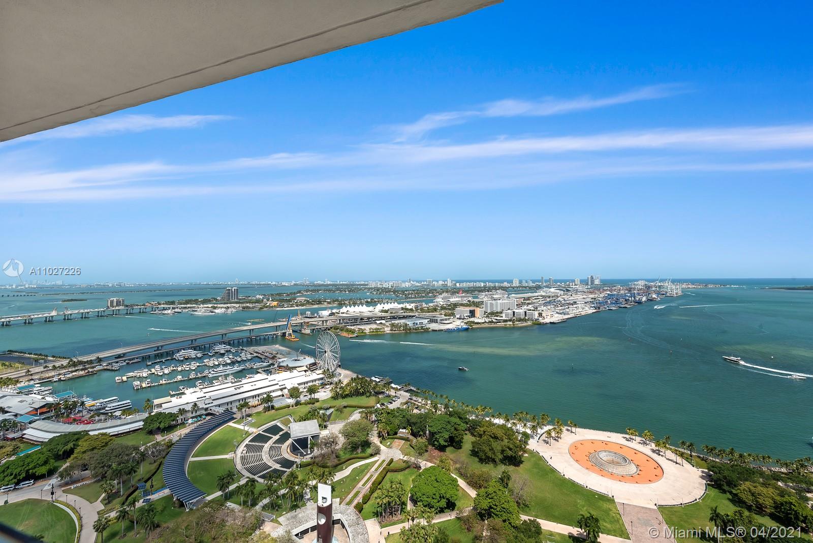 A metropolitan oasis at 50 Biscayne! East-facing residence 4106 features 3 bedrooms, 2 baths, travertine floors throughout, and a kitchen with all Teak cabinetry. The living room and bedrooms provide unobstructed, magical views of Biscayne Bay and Bayfront Park. In lieu of a balcony, exterior window art inspired by Roberto Burle Marx lets residents see the bay through the lens of his work. Bedroom windows open to allow the ocean breeze into the home. 50 Biscayne residents enjoy a 2-story clubroom, infinity-edge pool deck w/ cabanas and lush landscaping, and a 2-story health + fitness center containing a spa & meditation rooms. Located in Miami's lifestyle epicenter, walking to the arts + culture nearby such as Bayside Marketplace, Perez Art Museum, and AAA has never been easier.