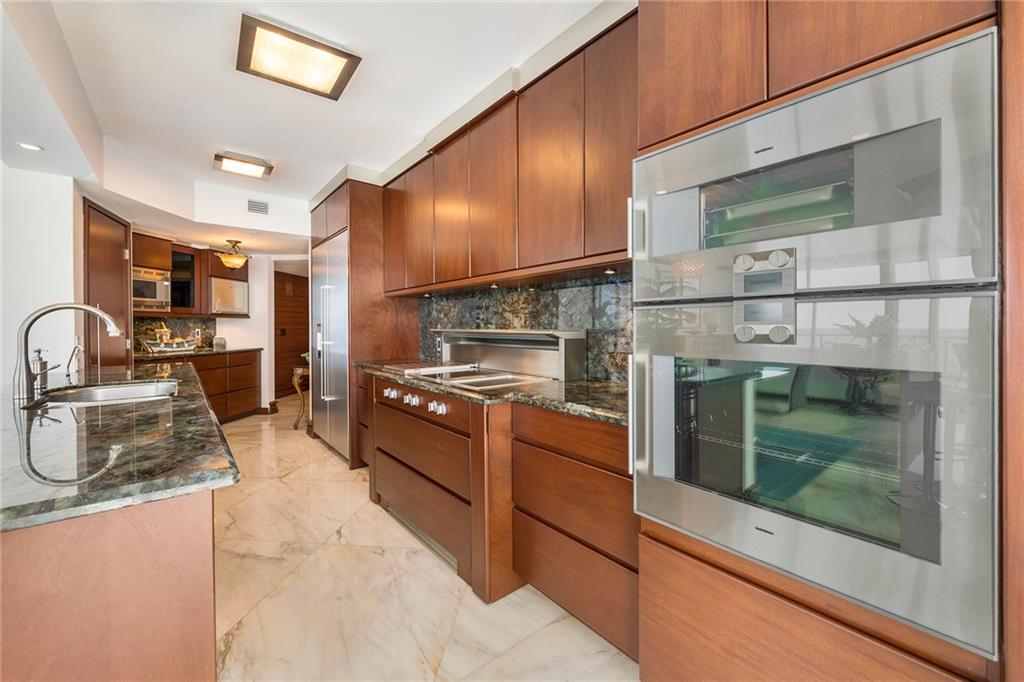 Welcome to Renaissance on the Ocean. This beautiful and spacious oceanfront residence features sunlit spaces and 36 inch Turkish marble flooring throughout its 3 bedrooms and 2.5 baths. Updated kitchen with granite countertops, Gaggenau appliances, wine cooler, and walk in pantry. Solid mahogany baseboards, moldings and kitchen cabinets. Incredible master suite with crystal and onyx finishes as well as an oversized infinity spa tub and walk-in shower with sitting area. Executive office with build-ins that can easily be converted to a third bedroom or gym. Wraparound balcony with stunning ocean views; enjoy morning sunrises! Two covered, garage parking spots. Amazing amenities including gated security, valet, tennis, private beach entrance, two pools, hot tub, fitness center and party room.