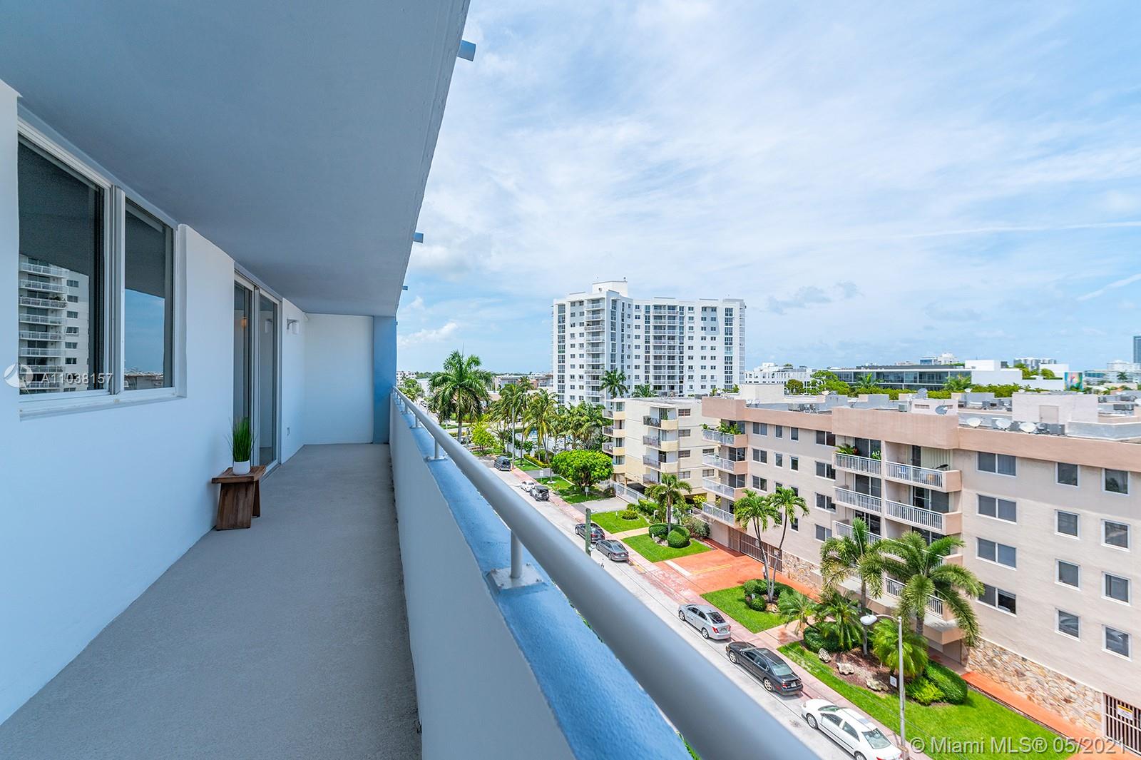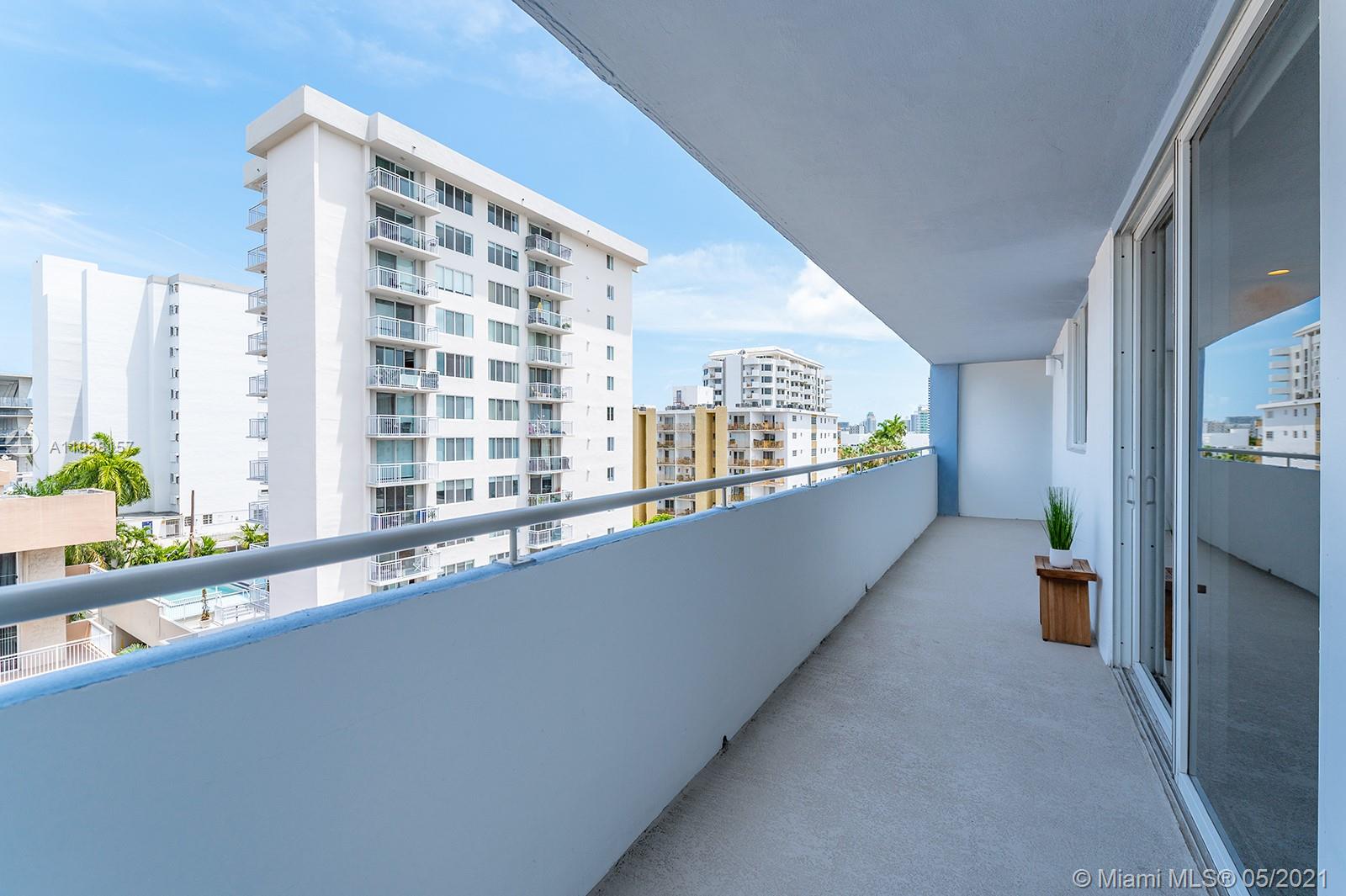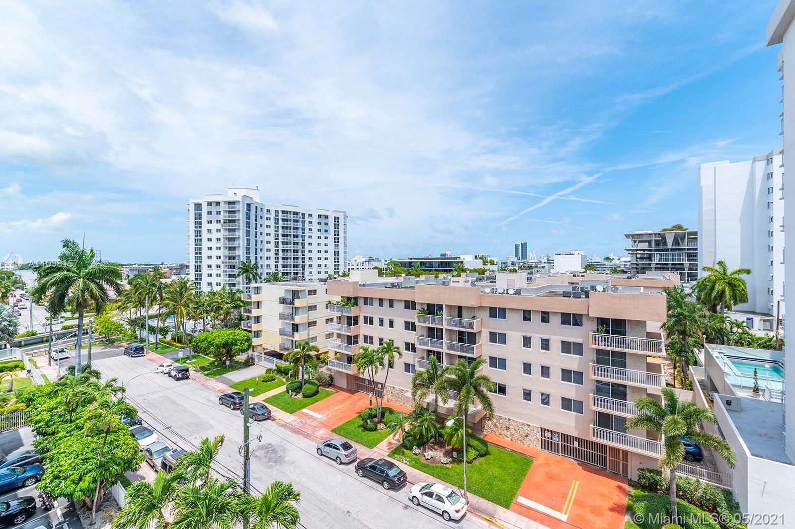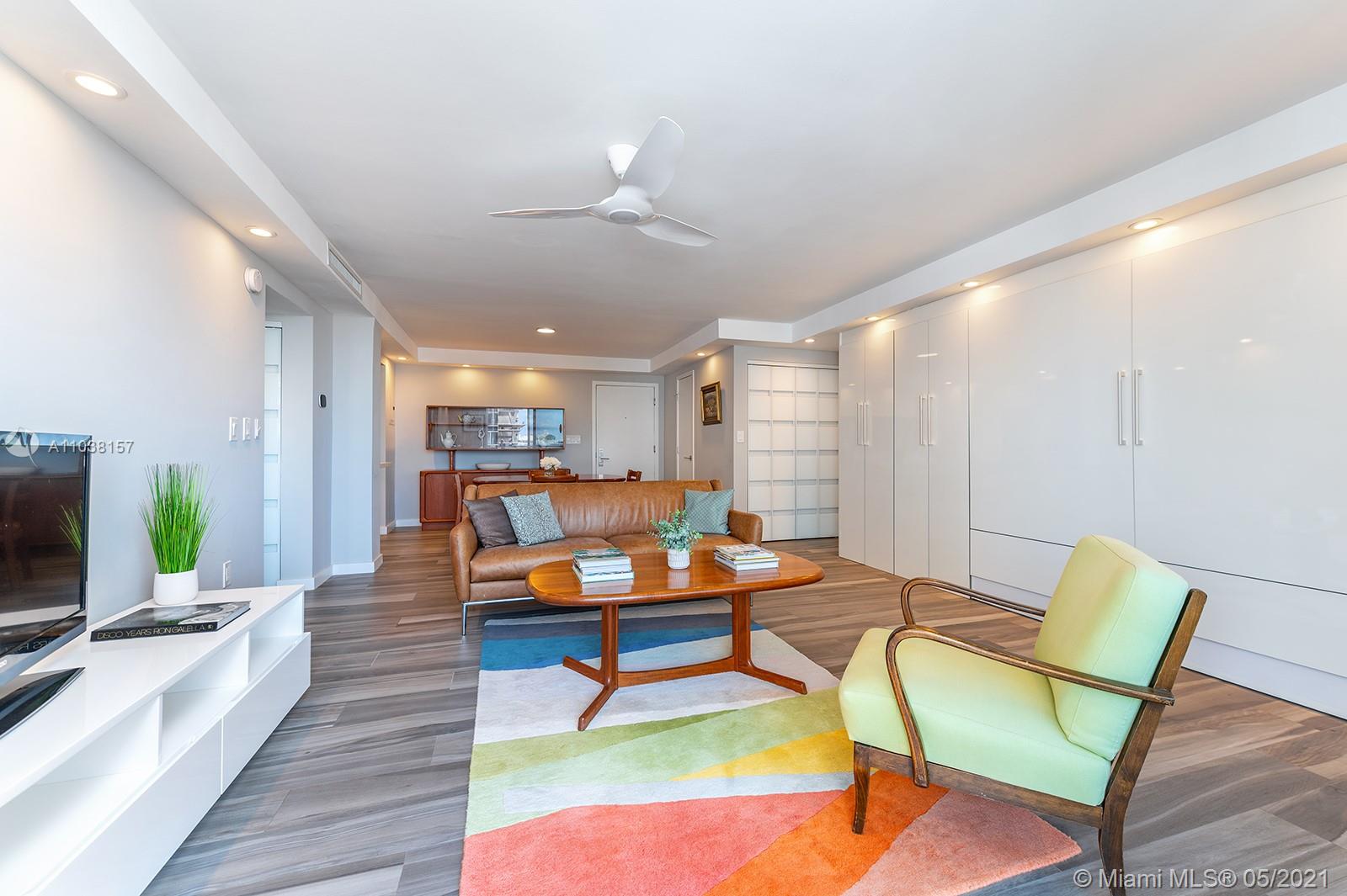 Everything you've been looking for: Space, light, completely renovated, steps to Lincoln Road! Oversized 868 sq ft 1BR/1.5BA residence has been carefully and completely renovated: Porcelain floors, modern open kitchen with custom cabinetry, quartz counters, top-of-line Miele and Fisher & Paykel appliances. Spacious walk-in shower in master bath, plus extra half-bath. Huge rooms, massive walk-in closet, built-in storage cabinets includes ultra-modern wall bed for overnight guests, custom finishes, washer/dryer in unit, new energy efficient A/C, tankless water heater, complete impact windows and doors, custom blinds. Oversized balcony with lovely views overlooking Lincoln Road West neighborhood. Pool, covered parking, low maintenance includes reserves, quiet street off Lincoln Road.