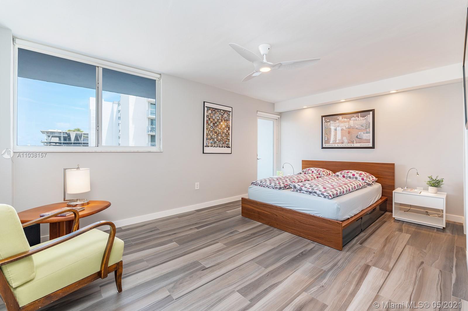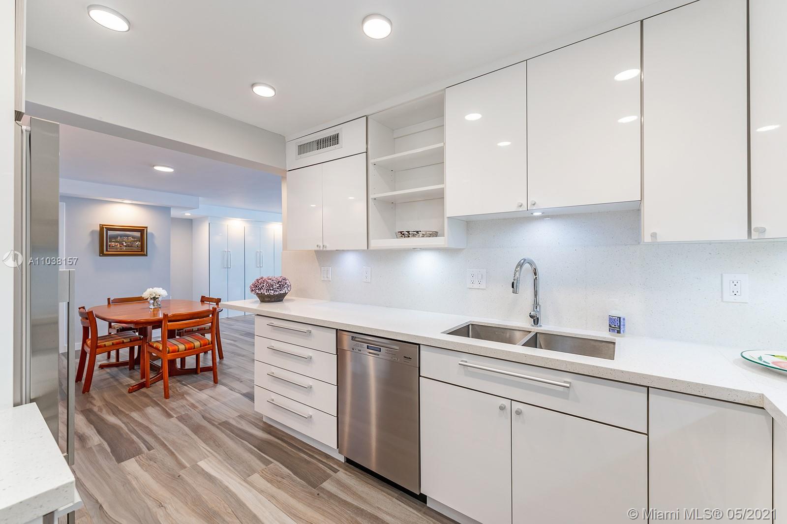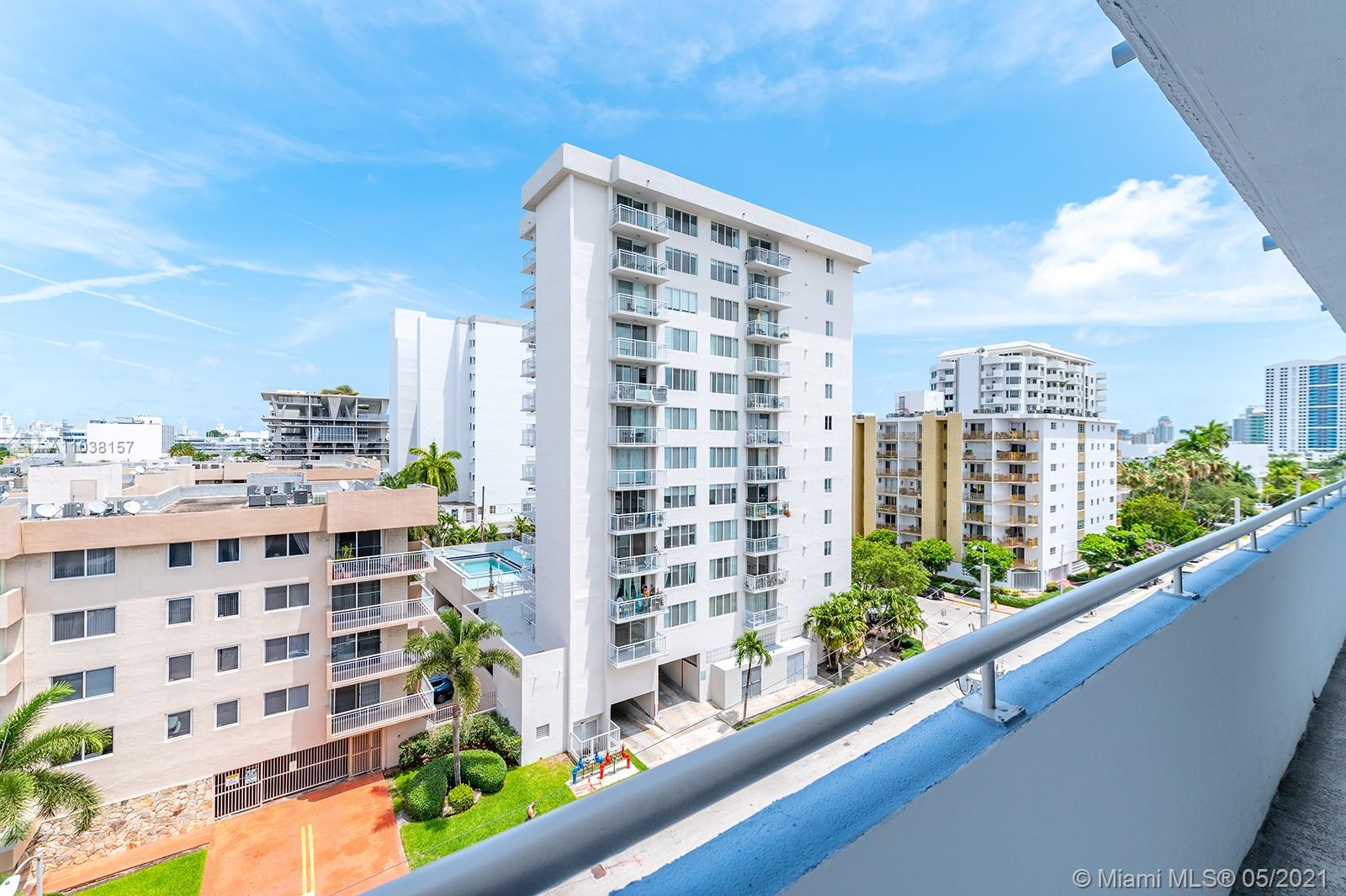 Everything you've been looking for: Space, light, completely renovated, steps to Lincoln Road! Oversized 868 sq ft 1BR/1.5BA residence has been carefully and completely renovated: Porcelain floors, modern open kitchen with custom cabinetry, quartz counters, top-of-line Miele and Fisher & Paykel appliances. Spacious walk-in shower in master bath, plus extra half-bath. Huge rooms, massive walk-in closet, built-in storage cabinets includes ultra-modern wall bed for overnight guests, custom finishes, washer/dryer in unit, new energy efficient A/C, tankless water heater, complete impact windows and doors, custom blinds. Oversized balcony with lovely views overlooking Lincoln Road West neighborhood. Pool, covered parking, low maintenance includes reserves, quiet street off Lincoln Road.