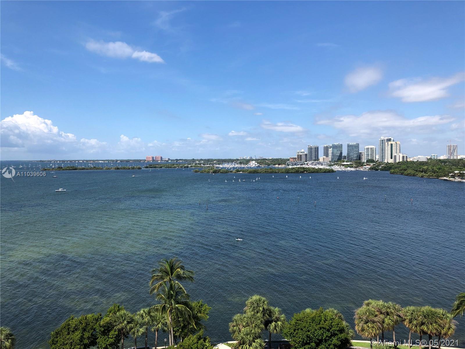 Spectacular rarely on the market, 2 bedroom 2 bath Split plan, with unobstructed 180º southern views of the Biscayne, Dinner Key Marina, Coconut Grove and Coral Gables. This rarely on the market apartment, comes with French doors in the bedrooms with a large walk-in closet in the master bedroom. Both bathrooms have been recently remodeled and the master bath features a separate bath and shower. The master bedroom features a large walk-in closet with built-in cabinetry. The kitchen is open to the living area with brown cabinets, black granite countertop, wall mounted oven and Sub Zero Refrigerator. This Island paradise features a full marina, Lit clay tennis courts, a malecón walkway to view the bay a small beach with bar b q area and storage for kayaks and paddle boards.