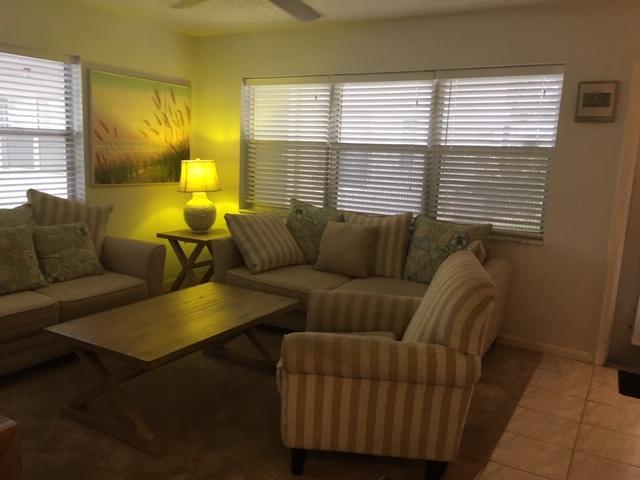 Here is your downstairs, bottom corner unit. Won't last long. New roof May 2021. This 1 Bedroom 1,1/2 bath is ready for move in. It has a walk in shower. Furniture is included. This is a 55+ active community with many amenities. Bonus stackable washer and dryer in master bathroom. Also, one pet allowed. Patio is enclosed for extra living space with windows and large storage closet.