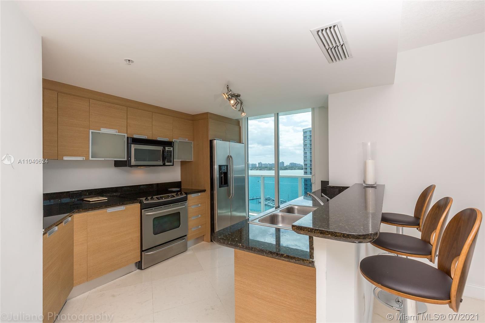 MAGNIFICENT 360-DEGREE VIEWS FROM THIS CORNER WATERFRONT CONDO IN NORTH BAY VILLAGE. BIGGEST WRAPAROUND BALCONY IN THE BUILDING. CEILING TO FLOOR GLASS WINDOWS IN ALL AREAS. TOP OF THE LINE APPLIANCES. DOUBLE SINKS IN MASTER BATH. WASHER AND DRYER IN THE UNIT. THE BUILDING IS FULL OF AMENITIES: GYM, BBQ AREA, POOL, HOT TUB, BOARDWALK, ATTENDED LOBBY, COVERED GARAGE. PET-FRIENDLY BUILDING.