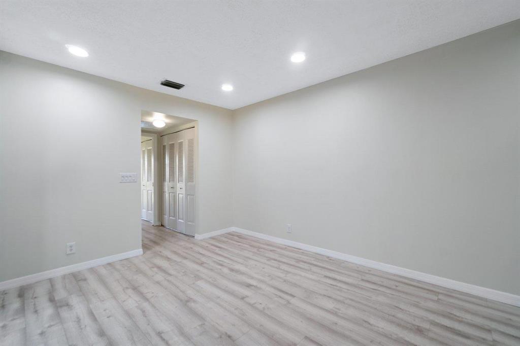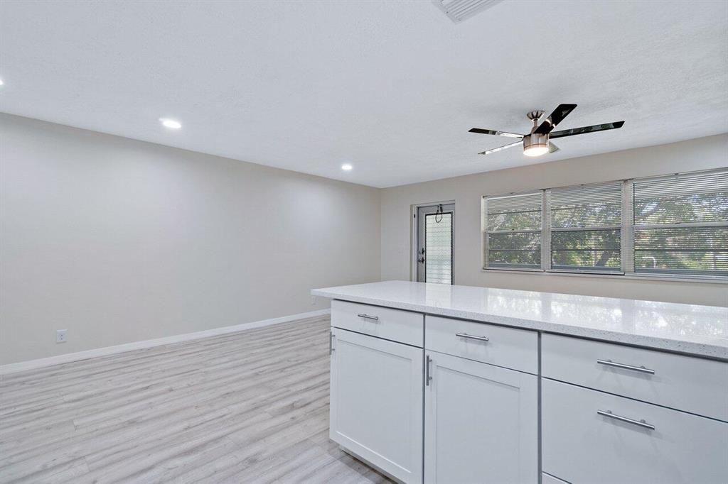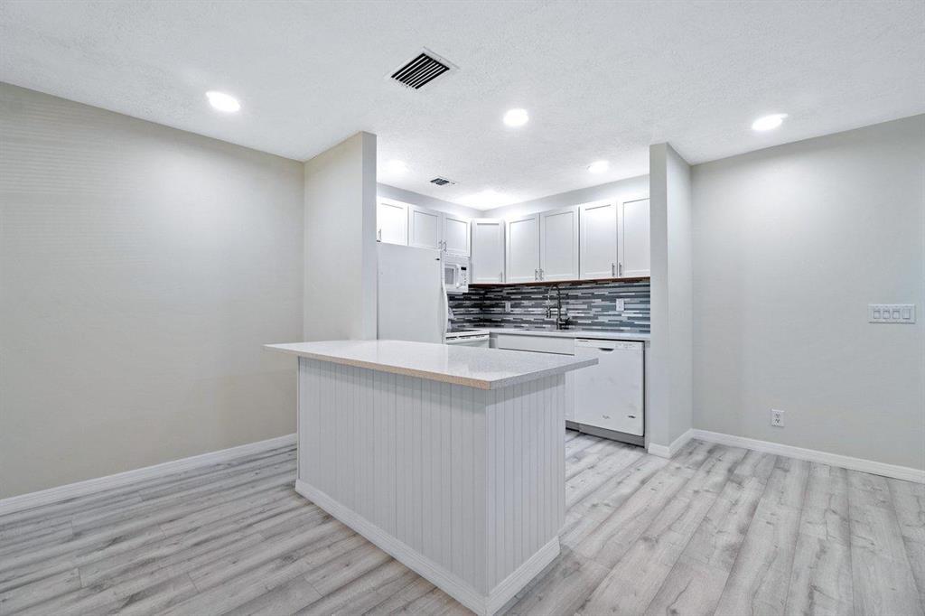 This is a gorgeous, newly renovated, spacious 1 bedroom, 1 1/2 bathroom condo tucked away in the beautiful guard-gated community of Century Village. Its bright and airy open floor plan is adorned with new wood-laminate flooring, dimmable LED recessed lighting, and remote controlled LED ceiling fans. The kitchen includes new shaker-white cabinets with a complementary tiled backsplash, along with White Diamond Quartz countertops, extra storage in the island, a top-mounted microwave, and a built-in dishwasher. The electric panel has been updated, along with a newer water heater and central air conditioner. Residents will enjoy the modernized bathrooms with all new fixtures, including a stunning shower with a glass splash guard and rain head shower in the main bathroom. This property's 2nd fl