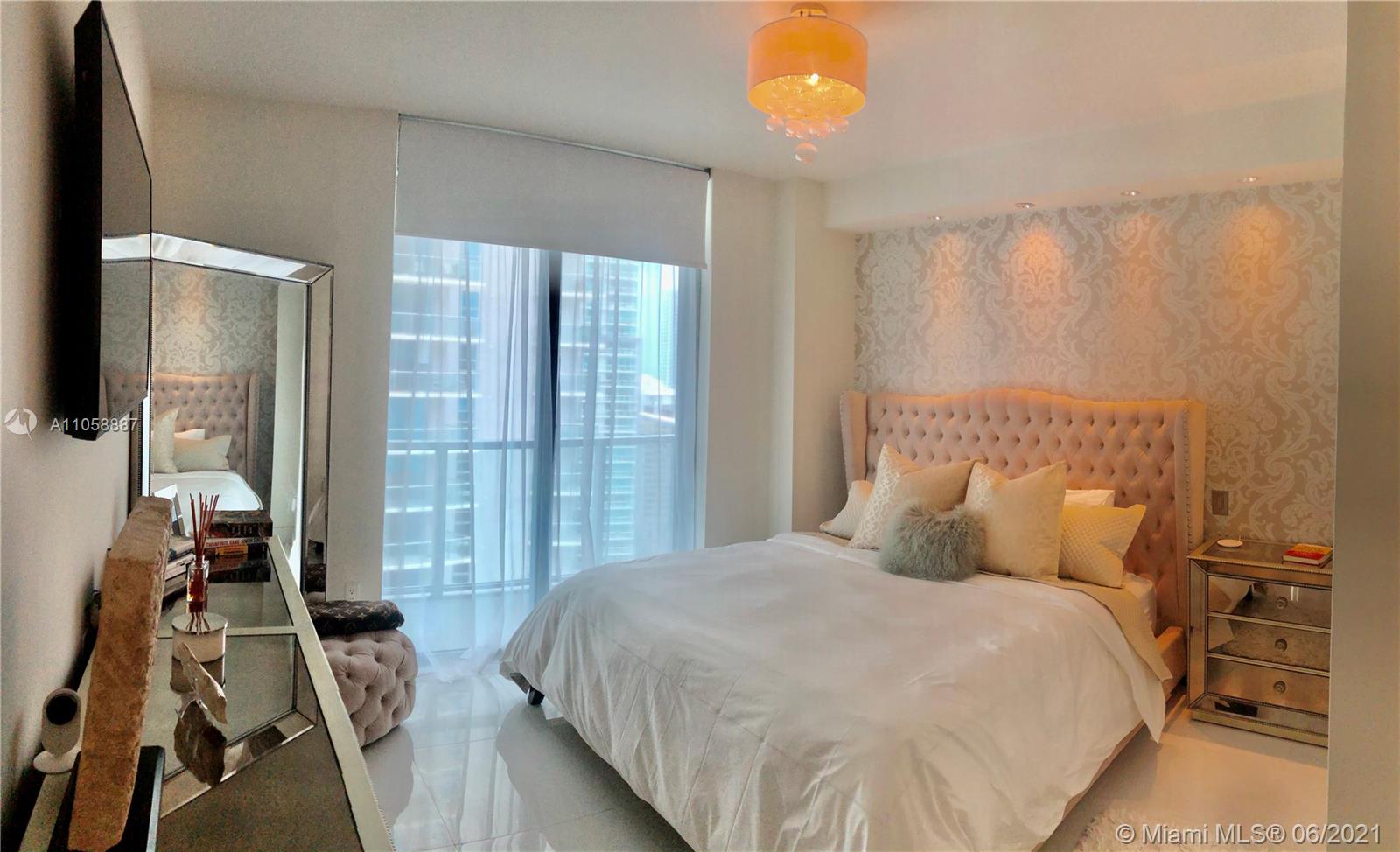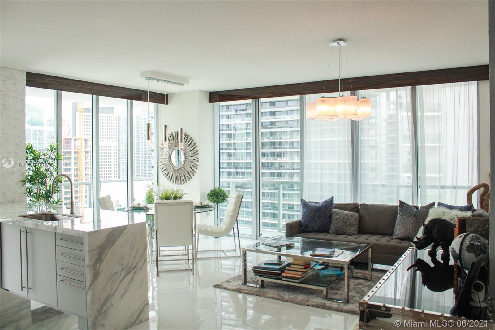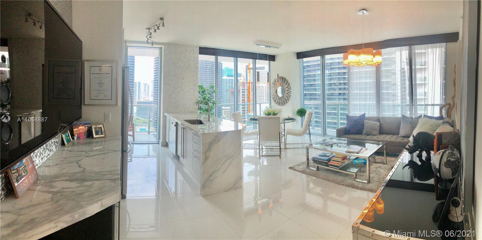 LUXURIOUSLY Upgraded 2/2 CORNER at Axis on Brickell with wraparound balcony, High-end, Elegant FINISHES; Marble kitchen and bathroom counters, UPGRADED Appliances, Window Treatment and Fixtures, Digital Pad lock and Nest included. Inbuilt Safe in the master bedroom. North East corner of the north tower, TILE floors throughout. High floor Open City and Sunset Views, 1 Parking Space included. European white cabinetry, floor to ceiling glass windows, and wide wraparound balconies. BEST LOCATION, in the heart of Brickell. Steps to Mary Brickell Village. Across from People Mover and Metro Rail. Luxury building designed by award winning Arquitectonica.