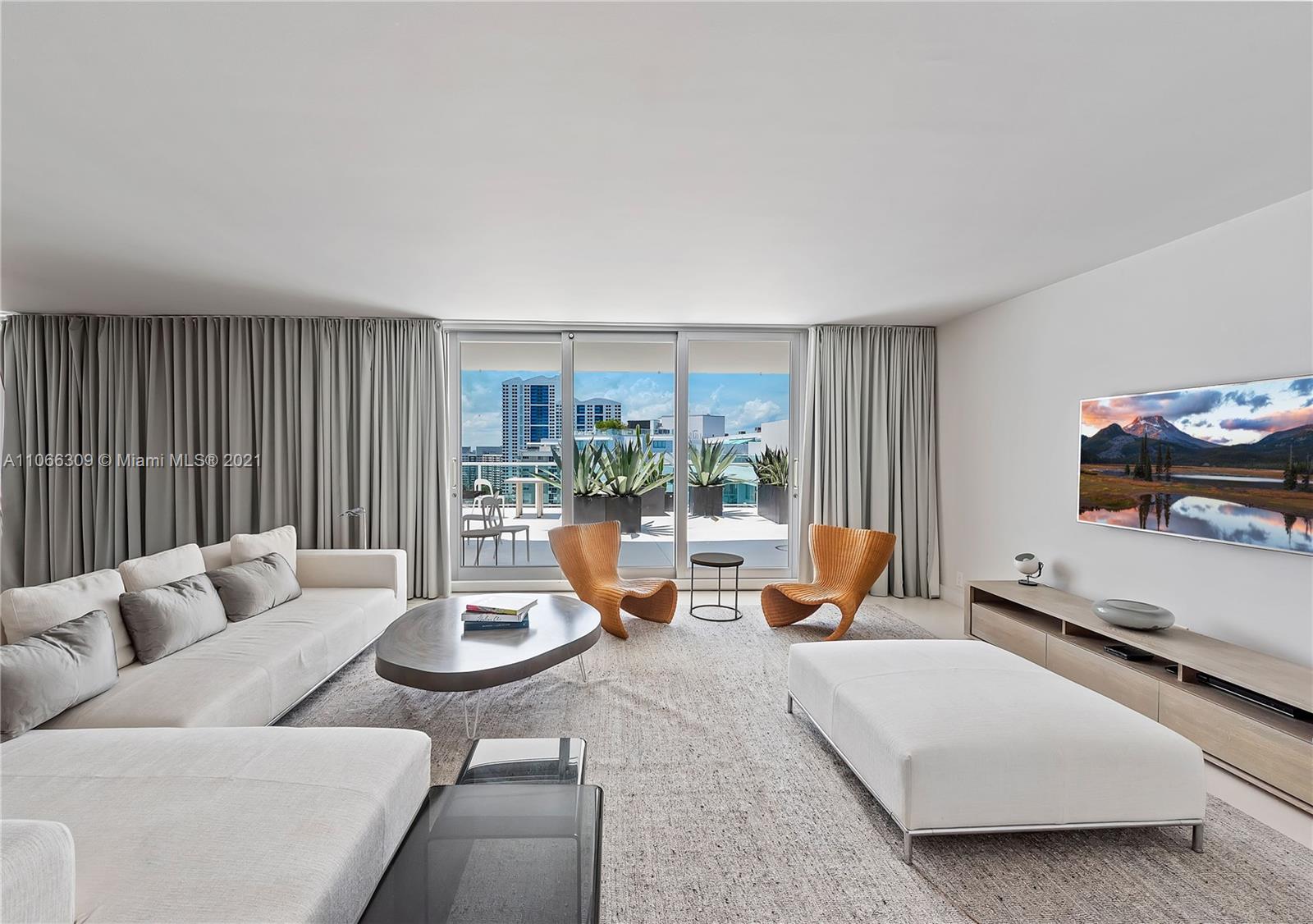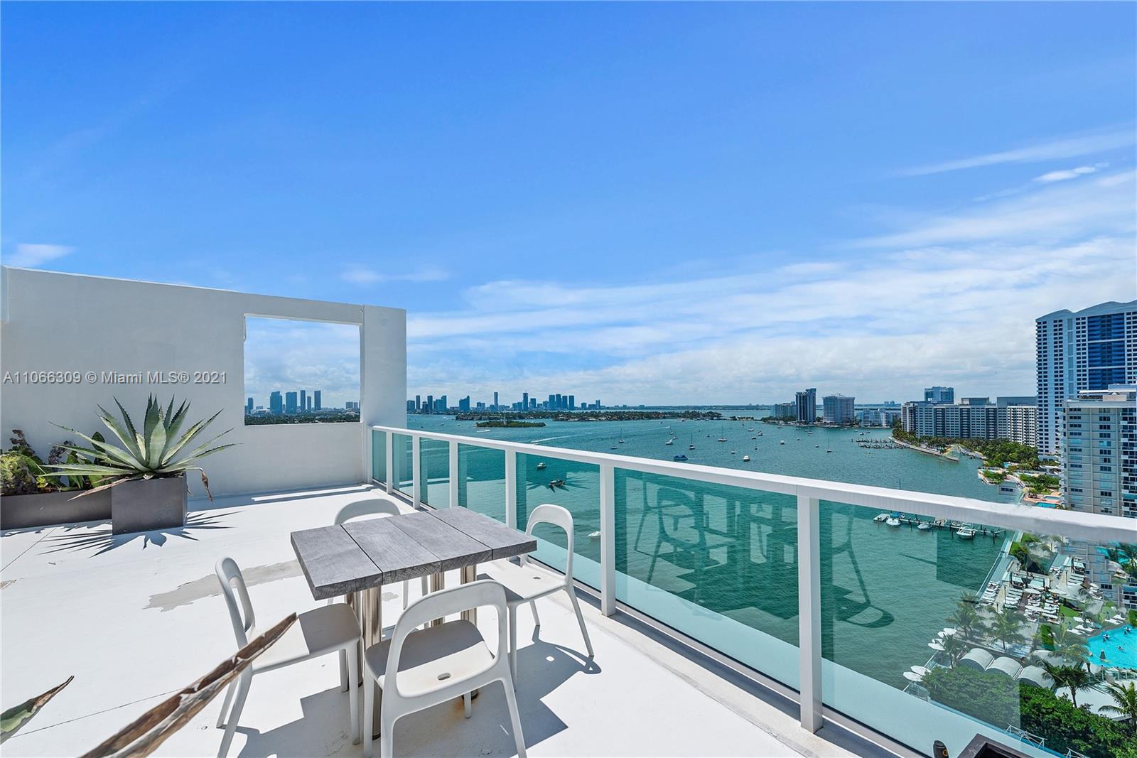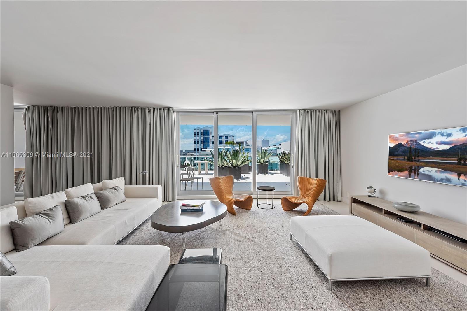 Fabulous Penthouse Tower Suite, TS9 is a unique waterfront residence with an 1100 sf private terrace. Enjoy panoramic NW, Biscayne Bay and Miami Skyline views. Additional outdoor space affords SW views. This spacious, 1,325 sf contemporary 1bd/1.5ba is sleeky designed. Wonderful for entertaining. Or, just relaxing outdoors. Mirador is in a great South Beach location and offers 5,000 sf gym, convenience store, and beautiful pool area.