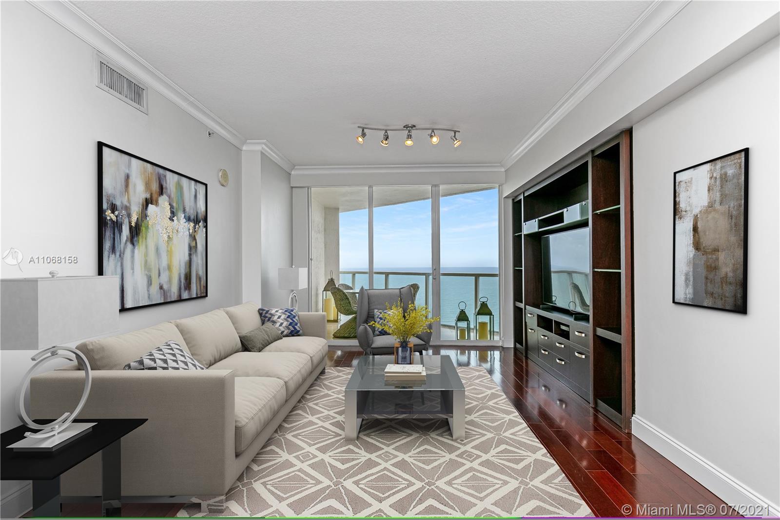 Amazing value for spacious unit with Ocean, Miami skyline & Intracoastal 39th-floor views. Highly desirable 01 line featuring 3 private balconies, split bedroom floor plan & den. Updated throughout with high-end doors and finishes. Real Wood Flooring. 2 assigned garage parking spaces and a large storage unit. Super low monthly maintenance fee includes full beach & pool service, fitness center, cable & game room. Walking distance to high-end restaurants & shopping. Easy to rent while you're away. Won't Last!
