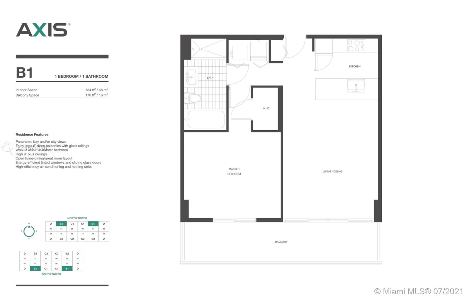 Best One Bedroom Unit at Axis on Brickell with TILE floors throughout and 2 Assigned Parking Space included. High floor with facing North and North West. Sunset Views. European cabinetry, stainless steel appliances, floor to ceiling glass windows, and wide wraparound balconies. BEST LOCATION, in the heart of Brickell. Steps to Mary Brickell Village. Across from People Mover and Metro Rail. Luxury building designed by award winning Arquitectonica.