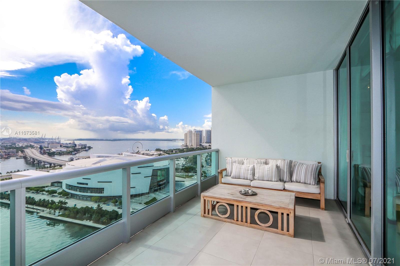 Showroom-quality furnished 1 Bed+Den/2 Bath condo at the luxurious 900 Biscayne Bay w/ porcelain tiled flooring throughout, 9'8" high ceilings w/ floor-to-ceiling glass windows, large balcony, upgraded washer & dryer, custom track lighting, custom mirrors, designer furniture, built-in closets, electronics, and breathtaking view of Biscayne Bay and cruise ships. Building amenities include: fitness center; theater; spa with men's & women's sauna, steam room, and whirlpool; full-service concierge; 24-hour valet parking; club room; children's playroom; and conference room.