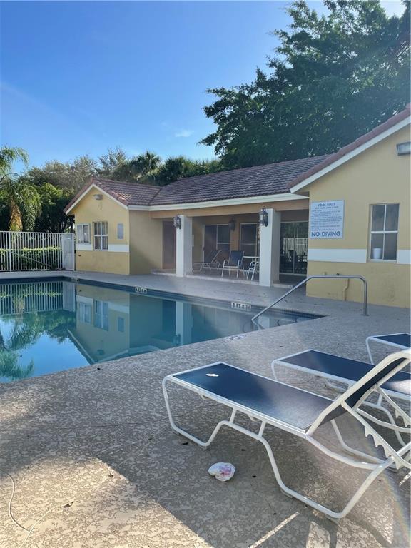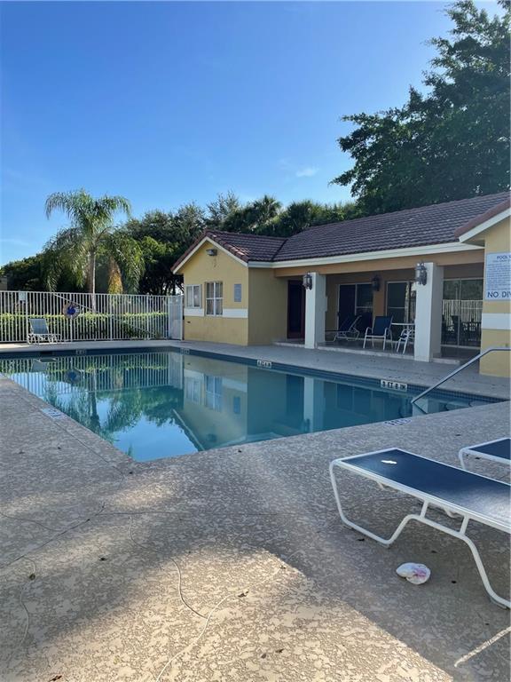 Welcome to this beautiful corner villa 2 bedrooms-1 bathroom. Great opportunity to make it a home or rental investment! Inside you will find high vaulted ceilings with updated light fixtures in the living room providing lots of natural lighting options. Tile throughout living room and barn door for privacy. One bedroom has laminate floor and second bedroom has vinyl. Full size washer and dryer inside the unit. Unit is located in a quiet community with swimming pool and clubhouse. Across the street from AMC movie theater, restaurants, medical office, daycare and city parks. Easy access to major roads, highways and the Sawgrass Mills Mall. All ages. Pets are allowed. Must see!
