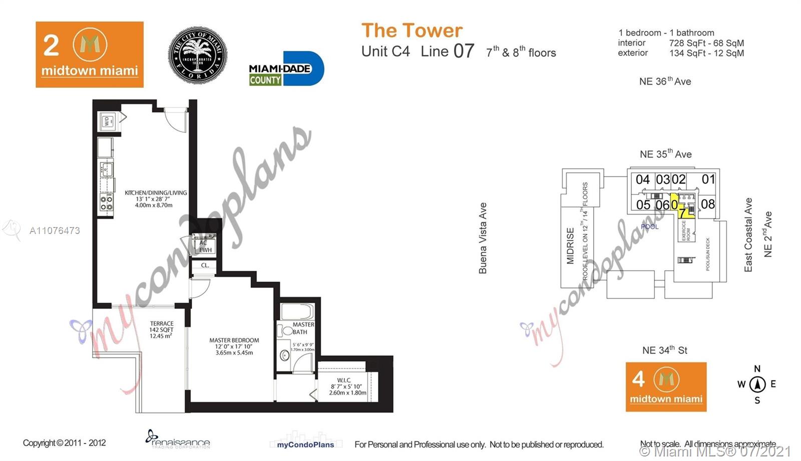 Midtown 2 - 1/1 Unique Inside Corner unit facing the Pool with Marble floors, Open Kitchen, W/D and huge Walk in closet - Great location! Close to Everything - Pet Friendly - Great Amens.