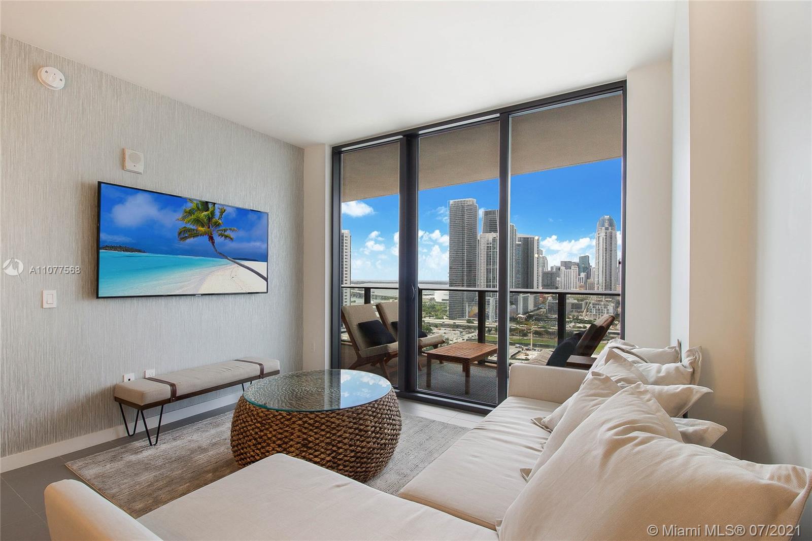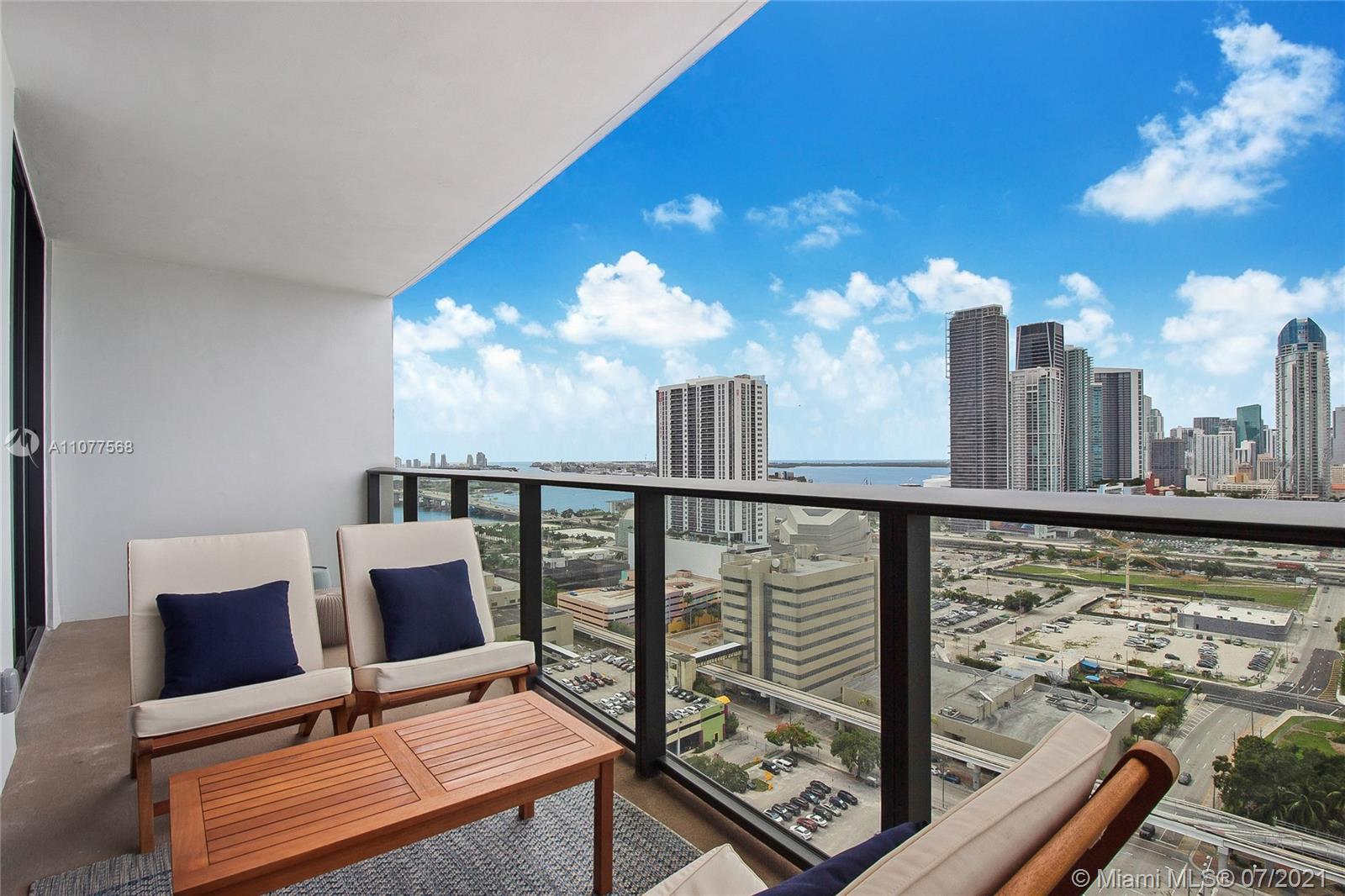 Turnkey unit located in the Arts & Entertainment District, this 2 bed/ 2 bath condo has endless panoramic bay and city views. Tastefully decorated and fully furnished. Includes basic cable and Internet. 2 parking spaces. (One self park, One Valet) Amenities include: 3 pools, jacuzzi, spa, gym yoga and meditation areas, high speed internet throughout the entire building, glass racquetball court, movie screening theater, modern game room, outdoor lounge and BBQ area. 24/7 security & concierge. MetroMover station one block across the street. Minutes aways from major restaurants, bars and shopping. 15 Mins drive to Miami International Airport. Short Term rentals allowed. Condo eligible for 3% downpayment!