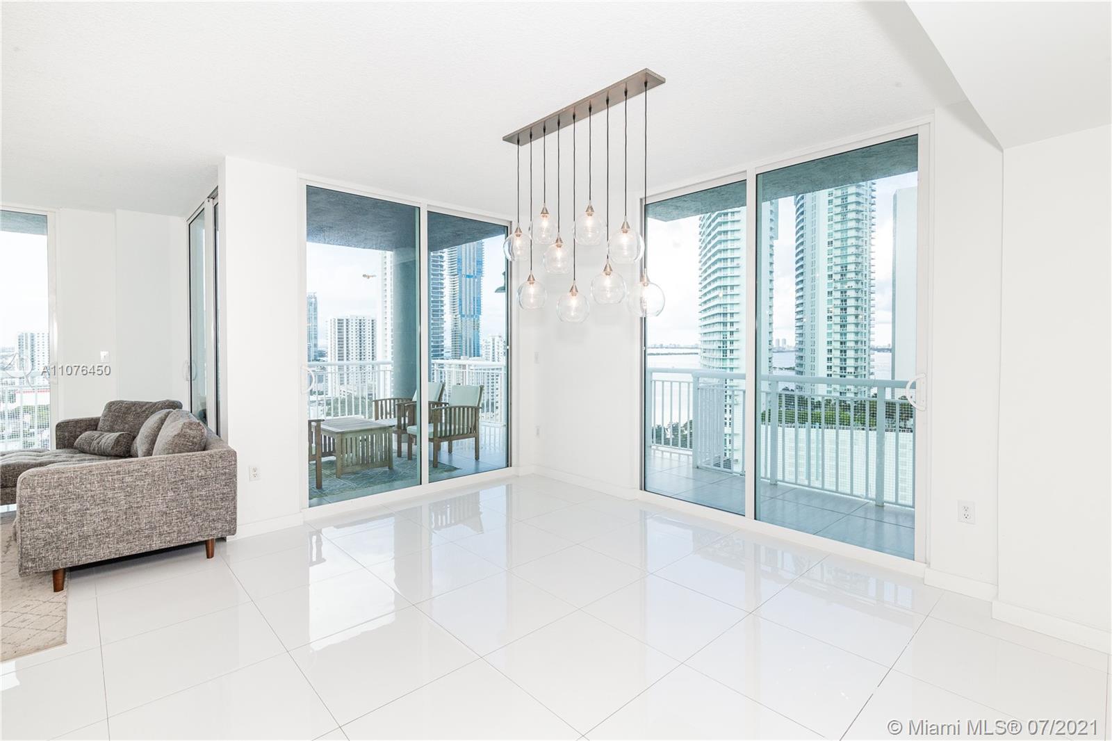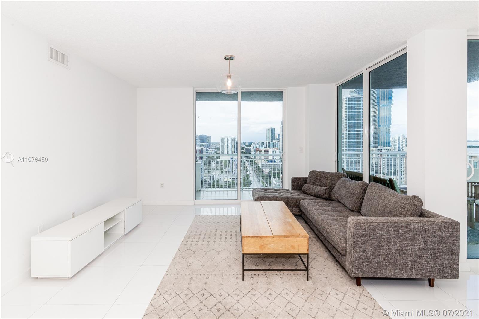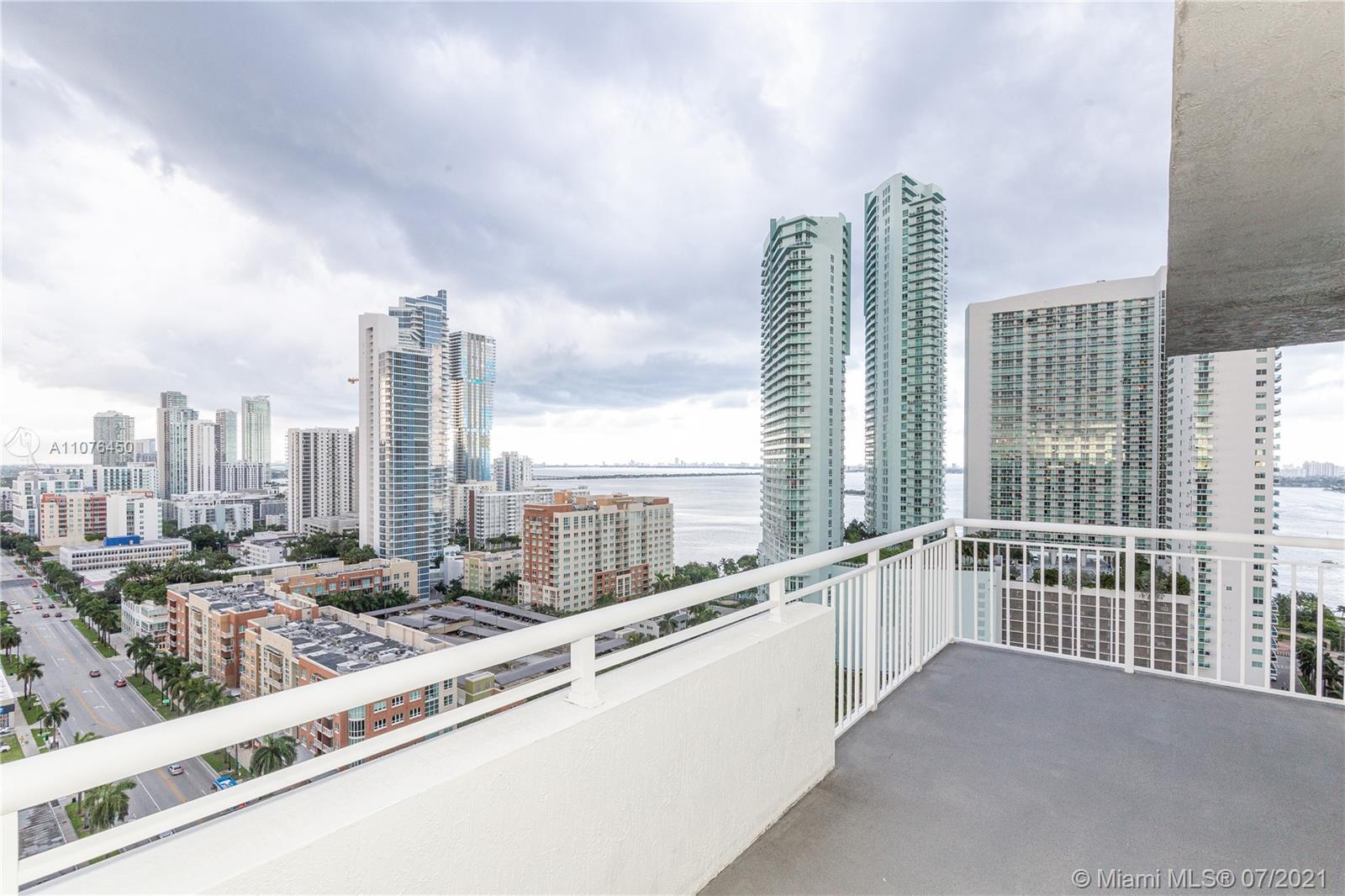 Bay and city views.2-Story Penthouse,3 huge terraces, white ceramic tile, updated kitchen w/high-end appliances and island, updated baths, 4/3(3up/1down) 9 sets of sliding glass doors, huge laundry room for 2nd refrigerator/bikes, storage galore, close to the 8-acre waterfront park. Amenities include a doorman, pool, jacuzzi, secure garage parking. Centrally located between Miami Beach, Wynwood, Design District, and Brickell. 2 parking spaces. This is a dream property and great value.
