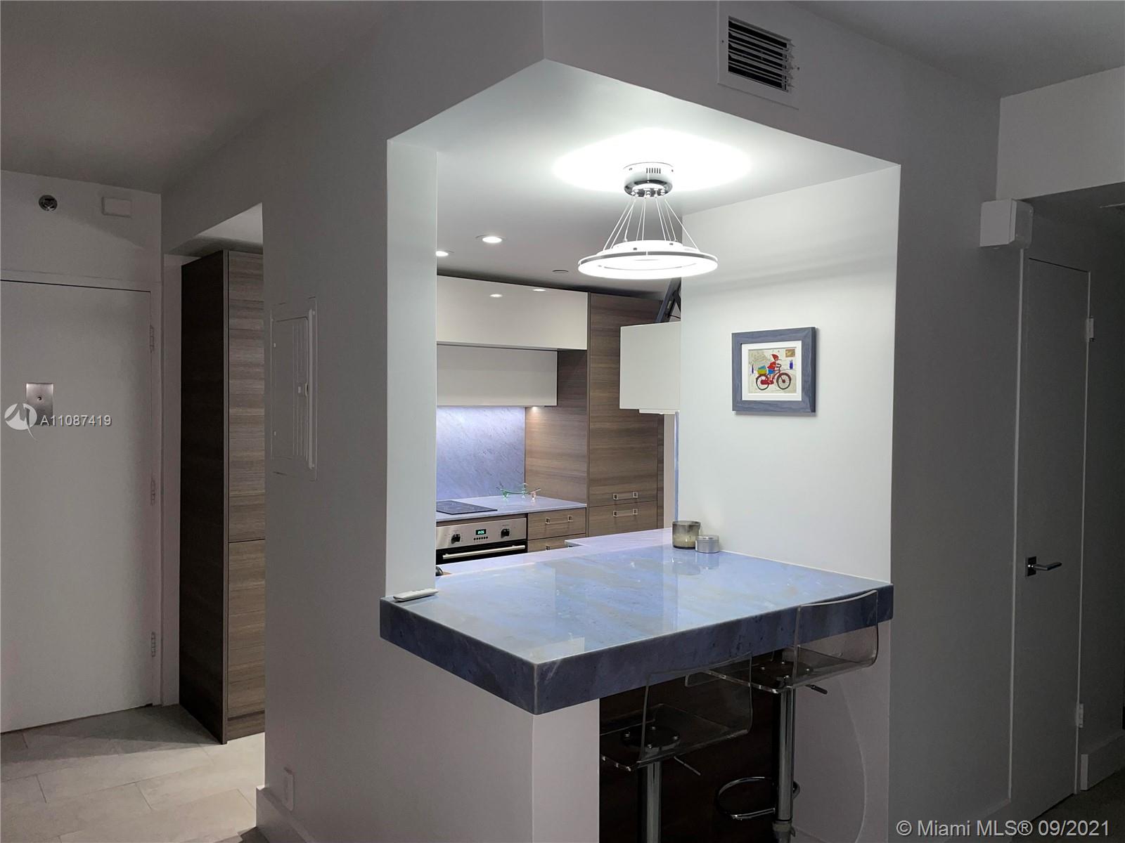 Located in the heart of South Beach, here is your opportunity to own a fully renovated/studs up and spacious 1 bedroom and 1 bath w/stunning skyline/sunset, Biscayne Bay & Iconic Miami Downtown views. Unit is move-in ready with porcelain flooring throughout, new AC & Ducts, LED Lighting throughout, Custom European cabinetry kitchen w/ Liebherr refrigerator, induction cooktop, full-height pantry soft close doors & plenty of windows for a light and bright space with natural sunlight. Custom Euro closets. Full remodeled enlarged bathroom. Custom walls & bar unit. Garaged Assigned Parking Spot near the elevator. Mirador is a full-service building with valet parking, heated pool, sauna, jacuzzi, convenience store, 24h security, spa, & a state-of-the-art fitness.