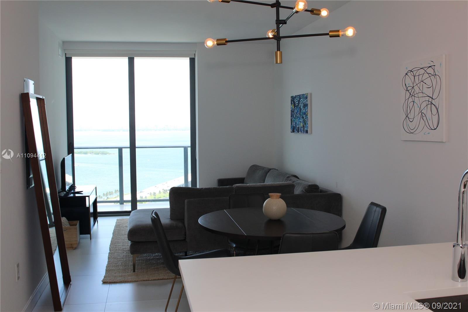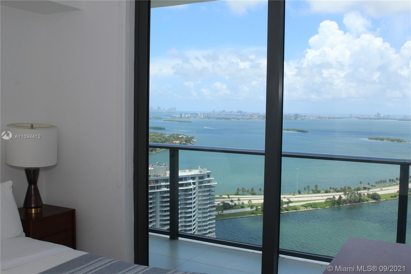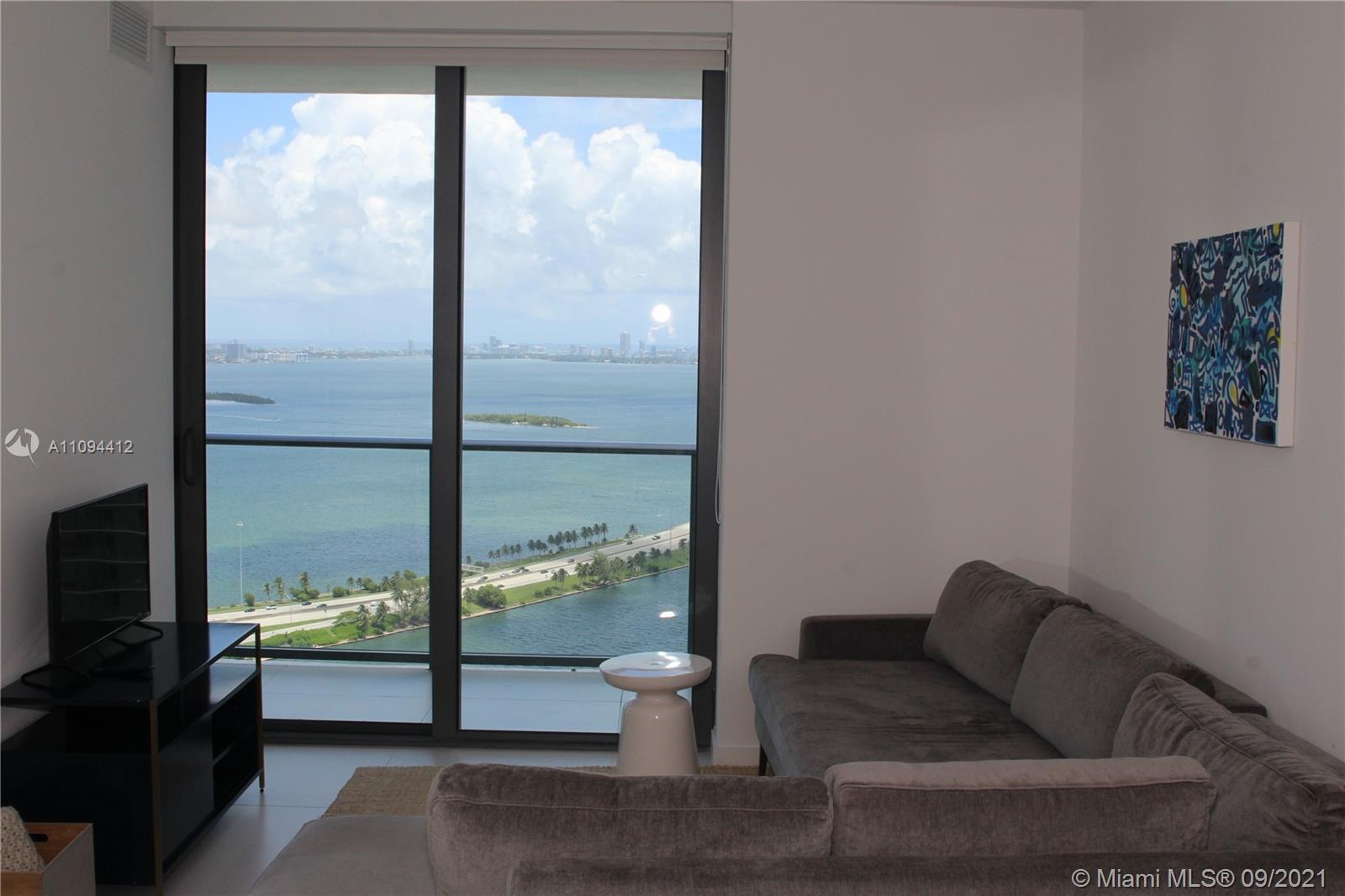 Priced to sell, unit with direct views to the Bay and the Ocean. Beautiful finishes, Italian porcelain tile throughout, Italkraft kitchen cabinets, BOSCH appliances, excellent layout, King size bed in the bedroom, ample terrace. Building features incredible designer finishes by renown Karim Rashid including: tennis court, pool, cabanas, BBQ grills, lounge beds, spa, sauna, treatment rooms, state-of-the-art fitness center, multimedia room, billiards, kids room, club room and STUNNING 46th floor pool deck and hot spa with amazing views. Unit rented until December 2021 at $2250 per month. Tenant could move out with 45 day notice.