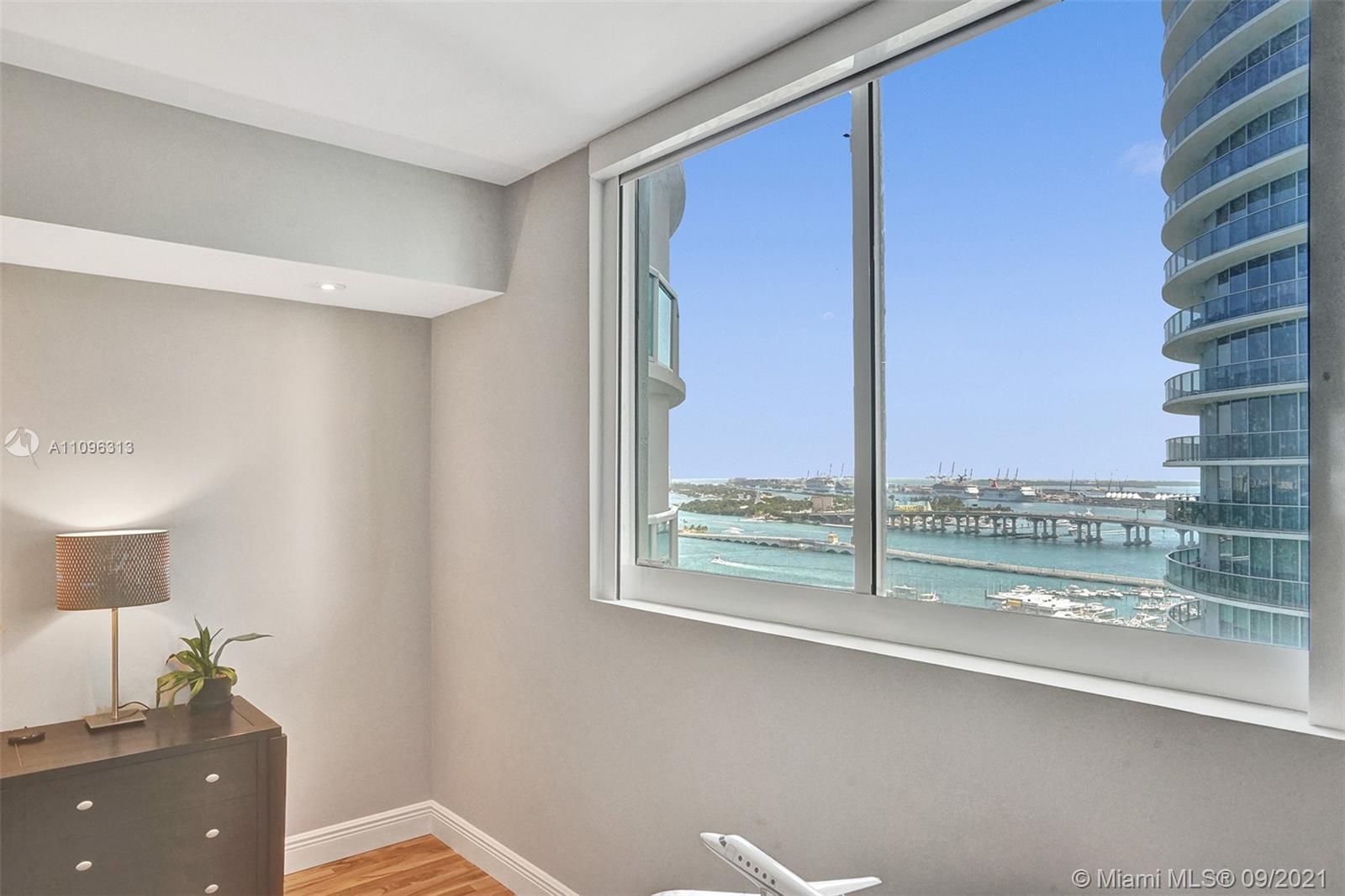 Feel like you are on vacation everyday! Relax on your private balcony with views of Biscayne Bay & the cruise ships in the port of Miami. Great location with access to shopping, restaurants. Spacious unit with large master bedroom updated with remote black out blinds, recessed lighting and a custom walk in closet with lots of storage. Several upgrades include, new closet doors on laundry and a/c closets. New shower door in Master bath with separate tub & double sinks. Featuring granite counter tops, stainless steel appliances and wood cabinetry in open kitchen to dining area. Building is across from Margaret Pace Park. Pool, game room, 2 story lobby, fabulous gym, valet, steam room, sauna, concierge. Seller offering a (1% incentive towards closing costs).