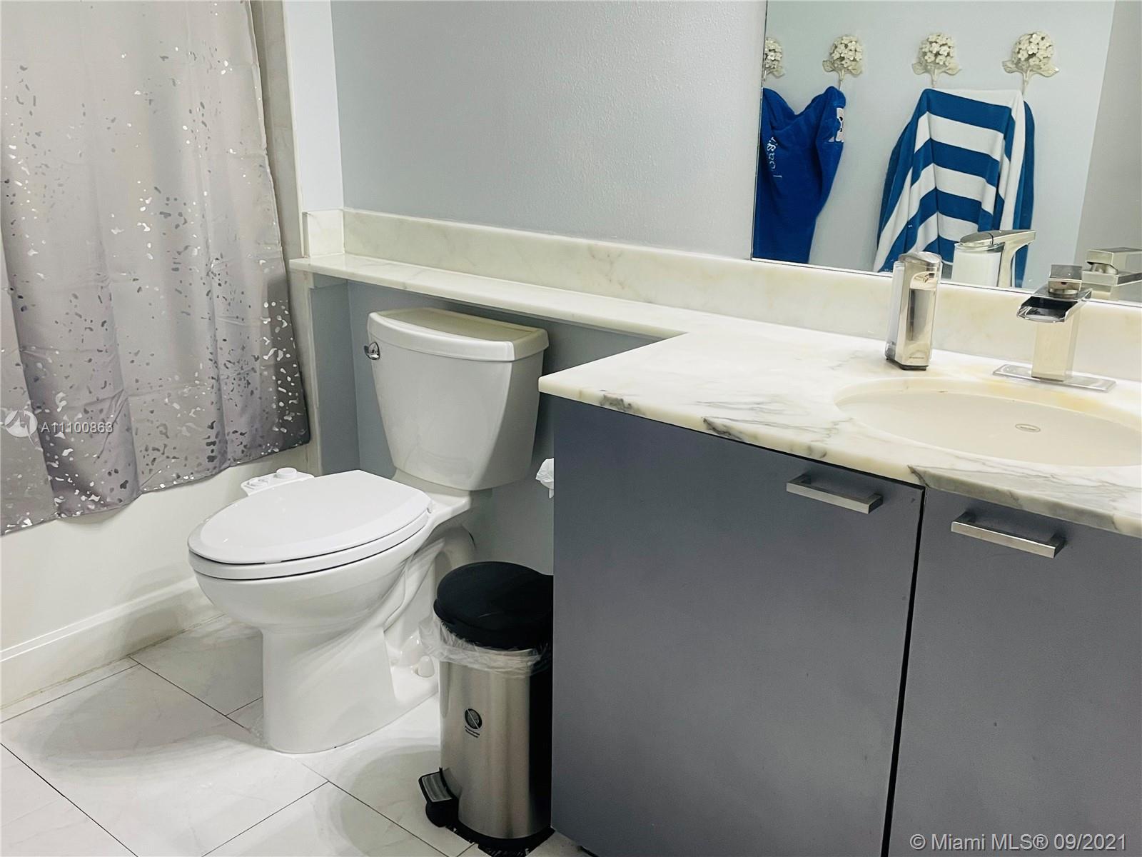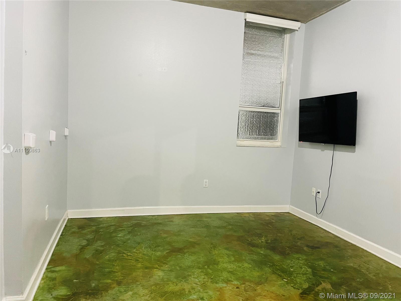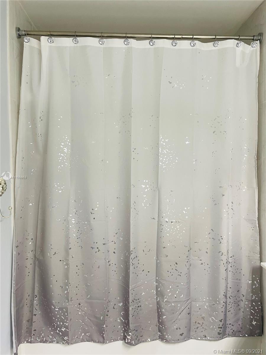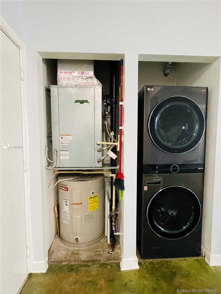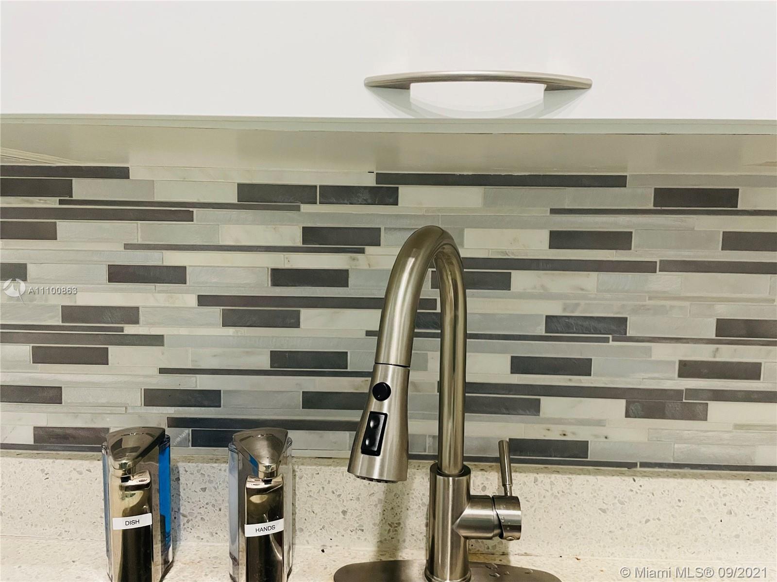 Beautifully updated and well-kept modern unit on the 8th floor. This one bedroom and one bathroom unit offers: concrete and tile floors, freshly painted walls; new air conditioner, smart Ecobee thermostat with Alexa; new smart LG washer and dryer; a clean white, silver: grey backsplash, trash cabinet; new kitchen and bathroom faucets; newly installed toilet; new dimmable bathroom lighting. The bedroom was recently enclosed with a full partition wall and door for privacy and total darkness to sleep, including a motorized shade. The bedroom closet has ELFA organizers and recently installed doors. The bedroom and living room include smart Roku TVs and Philips Hue lighting. Hurricane impact door and window. Bonus: balcony doggy door. The balcony is covered in beautiful, faux green grass.