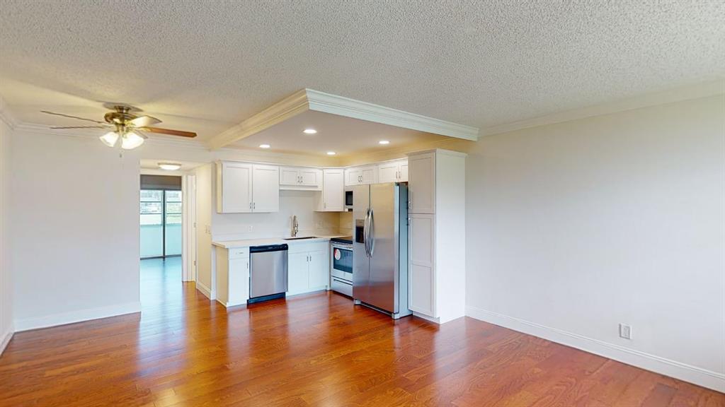 Complete renovation just completed! Ready for your personal touch. Waterproof wood laminate flooring throughout living areas and kitchen. Bathroom and lanai have a luxurious marble porcelain tile. Open kitchen concept with Shaker style wood cabinets, matching stainless steel appliances, and gorgeous white quartz countertops. Recessed LED lighting provides bright light and energy efficiency. Beautiful Crown molding and 5-inch baseboards carry throughout all rooms. All interior doors were replaced with six panel lightweight doors. Bedroom has a built-in custom closet. New sliding glass doors lead to an enclosed lanai with additional storage. Bathroom features a walk-in shower with barn door track rollers, bead board walls, new vanity and toilet. Newly installed A/C and water heater