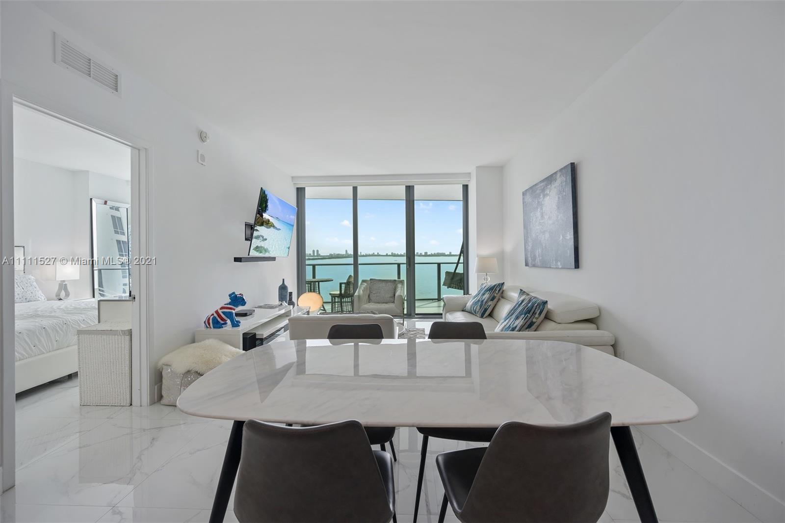 Spectacular unit with amazing views of Biscayne Bay, private elevator foyer, luxurious porcelain tile Statuario Alphino size 32 x 32 throughout the unit, electric window treatments with remote control in master bedroom and living room area. Live in the best location in Edgewater with full access to world class amenities such as tennis courts, bayview pool and gym, social lounge, spa and much more! Apartment shows like a model unit, very easy to show
