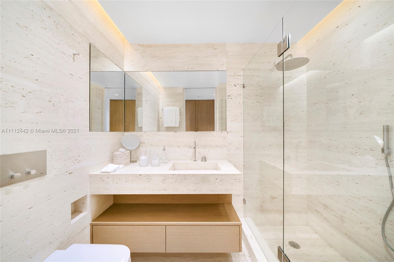 This expertly renovated sleek and modern 2nd floor Oceanside unit offers 3,580 SF and a large wrapping terrace with direct beach and ocean views. Exquisite Italian Travertino Navona marble and tan oak floors adorn this unit with open extended living room & dining area, custom millwork, and beautifully designed minimalist chef’s kitchen boasts a Navona marble island with seating, custom cabinetry, and top-of-the-line Gaggenau appliances. The spacious principal suite features a den/office space, private balcony and amazing principal bath with voluminous walk-in closet, a soaking tub, and large walk-in shower. The other 2 bedrooms are each uniquely designed, and well-proportioned with en-suite bathrooms. All hurricane impact resistant windows and doors. 5-Star Fisher Island amenities.