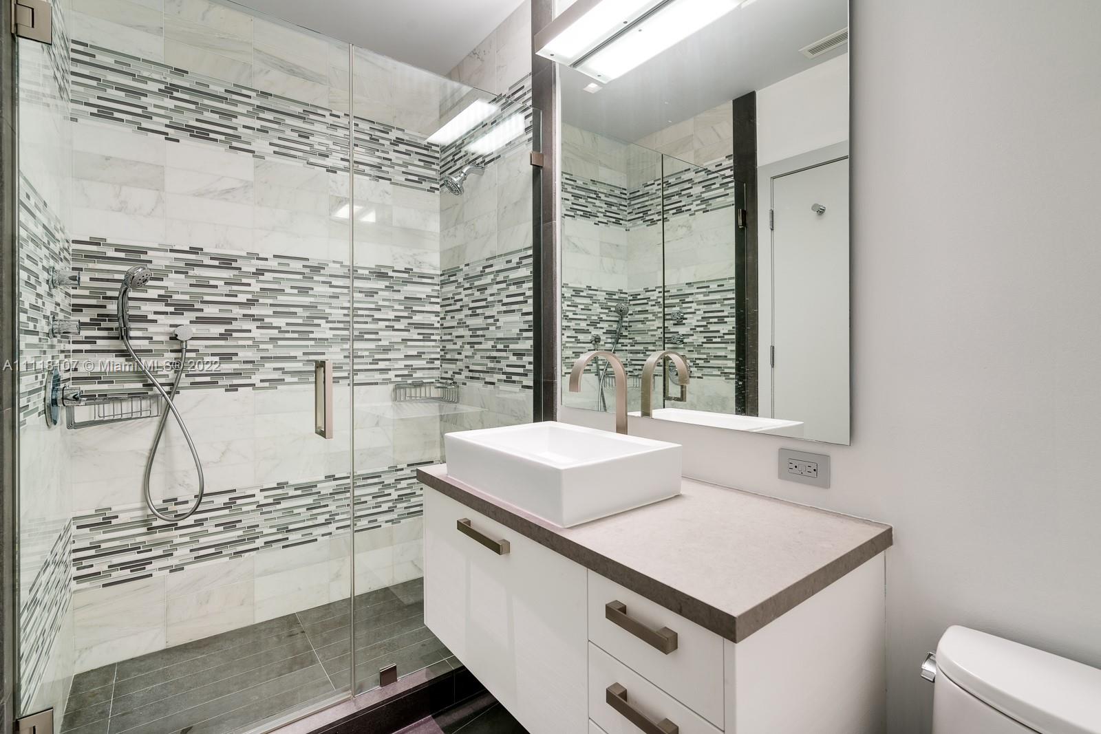 Completely renovated and over-sized 2 bed w/volume ceilings, showcasing dream-worthy views. Rarely available 04 line, freshly painted, featuring brand new Viking fridge/freezer, Viking/Miele appliances w/wine cooler, custom closets, designer bath fixtures, recessed designer lighting. Open kitchen w/breakfast bar + direct access to the terrace. Completely unobstructed views of the Bay and Ocean. Enjoy front row seats to holiday firework displays from your balcony. Tequesta 3 is a guard-gated building offering a pool, multi-level fitness center, tennis courts, basketball/squash court, sauna, children's room, bbq area, direct access to mile-long jogging loop. Low HOA fees! 1 assgnd parking space. Storage unit can be included. Option to purchase w/4002: ALL plans, APPROVED permits for 5 BED