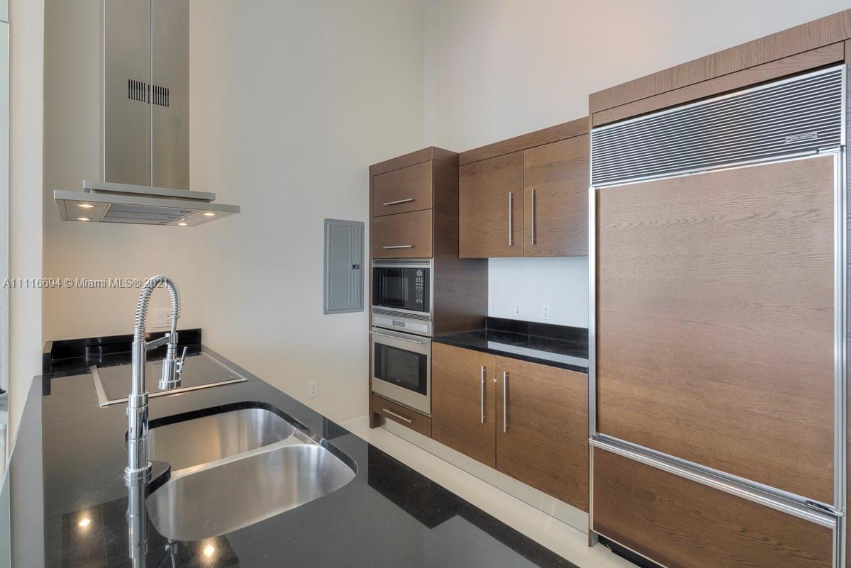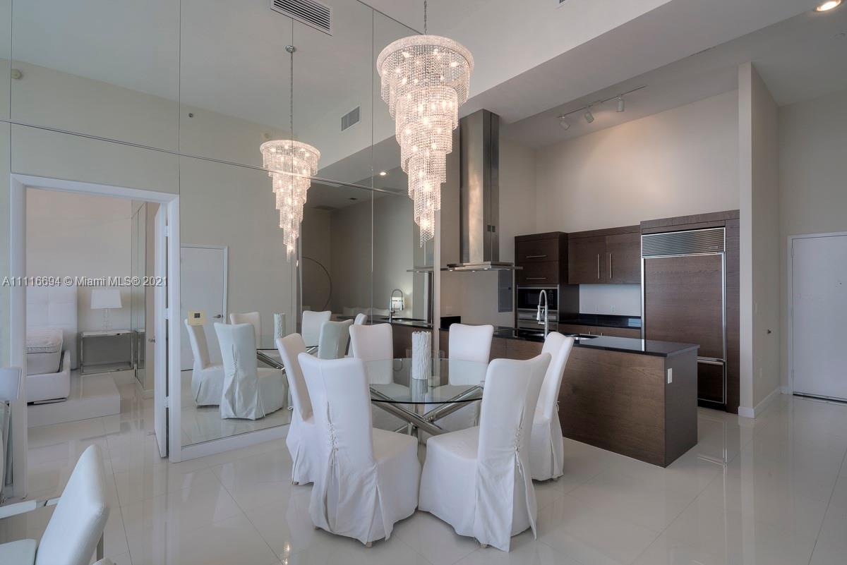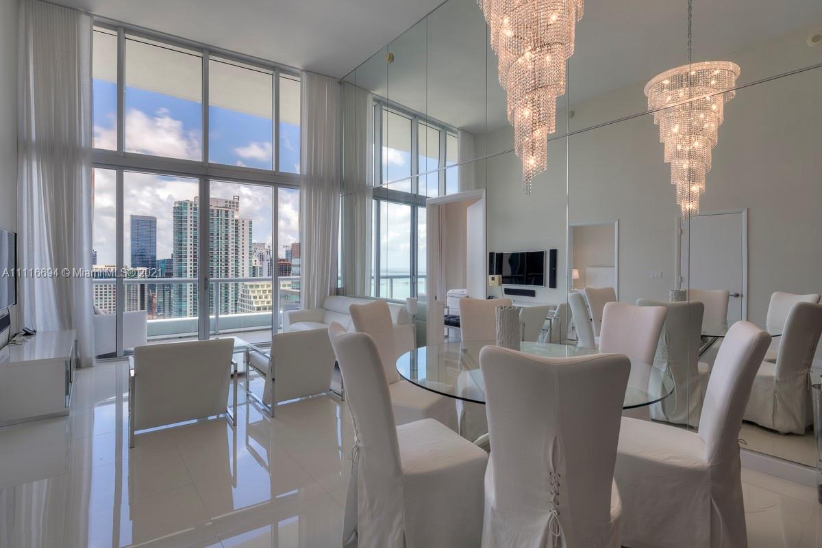 An impressive 2 Bed + Den/2 Bath condo residence w/ 1,518 interior square feet, a 220-square-foot-balcony, 16-FOOT-HIGH CEILINGS, white porcelain tiled floors, motorized shades in both bedrooms, and three crystal chandeliers. Breathtaking views of Biscayne Bay and Brickell skyline from the 41st floor. Building amenities include a 300-foot long swimming pool, 50-person hot tub, state-of-the-art fitness center, full-service spa, on-site restaurants, theater, game room, full-service concierge, valet parking, and more. Includes 1 assigned parking space.