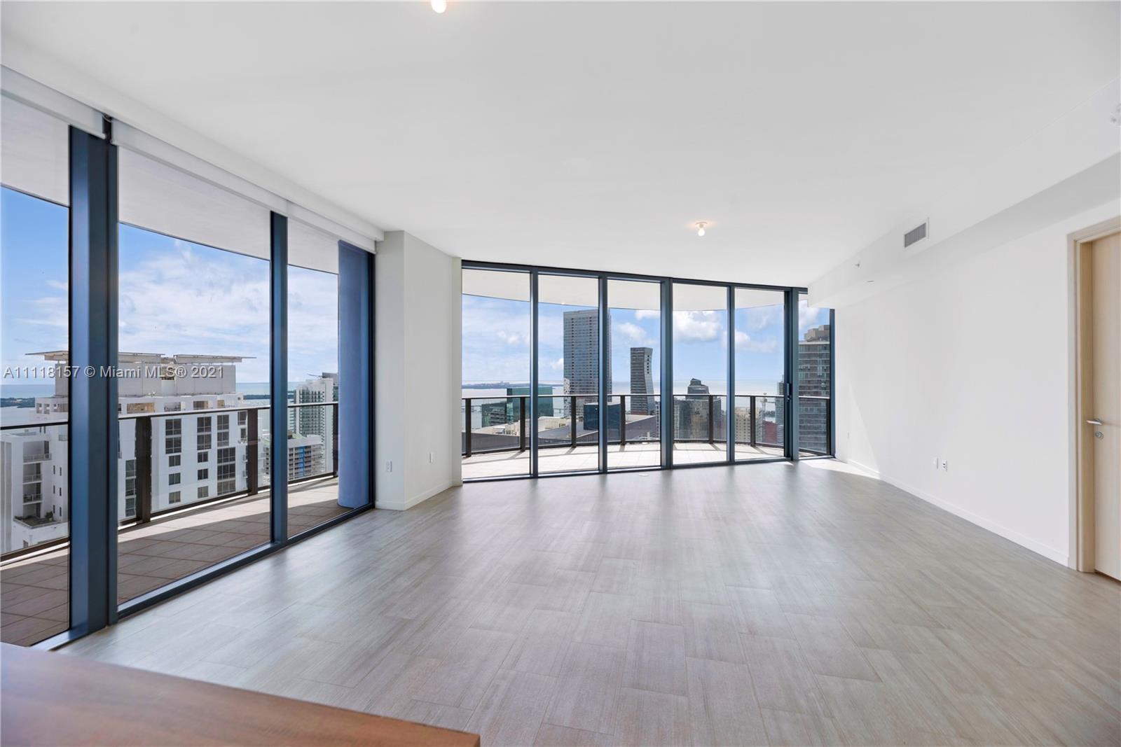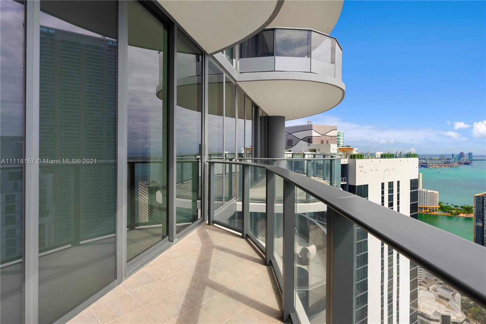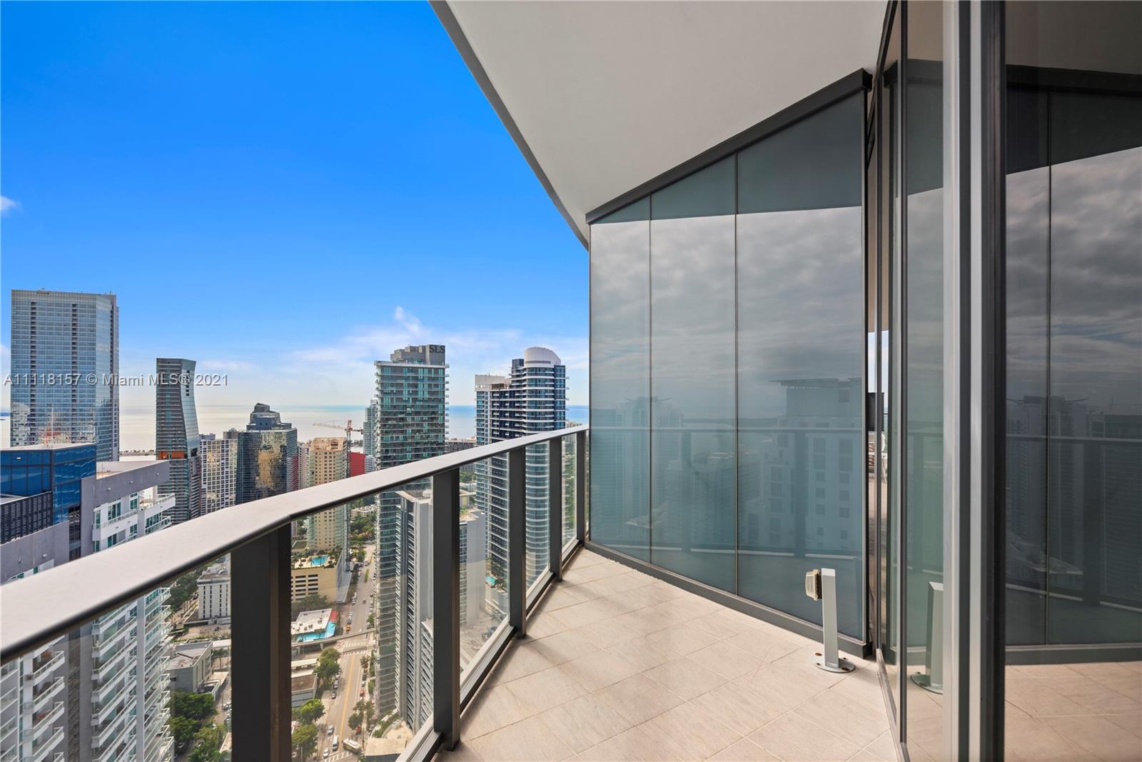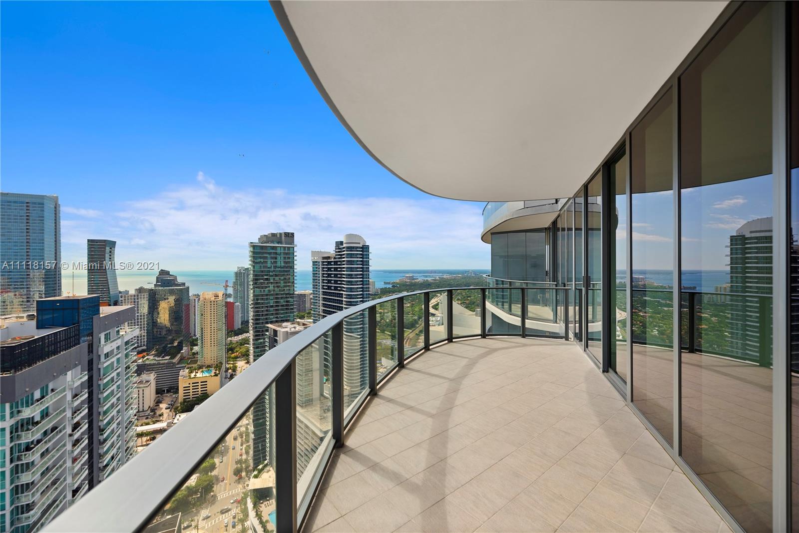 Brickell Flatiron Penthouse. Unobstructed panoramic views with SE Exposure [Best line] Corner unit with wrap around balconies throughout. 3 Beds- 3.5 Baths with 1,955 SQFT of living area, 10 ft. ceilings, floor to ceiling impact windows and sliding doors, Italian Snaidero Kitchens and Bathrooms, built-out closets, Miele appliances, and other luxury finishes. Full-service building with concierge service and resort style amenities includes the 64th Floor Sky Club, a spa, gym, theater, and lap pool, club room, lounge room, movie theater & Billiards. Two assigned parking space and valet service. Fantastic location in the heart of Brickell. Vacant turn-key unit easy to show.