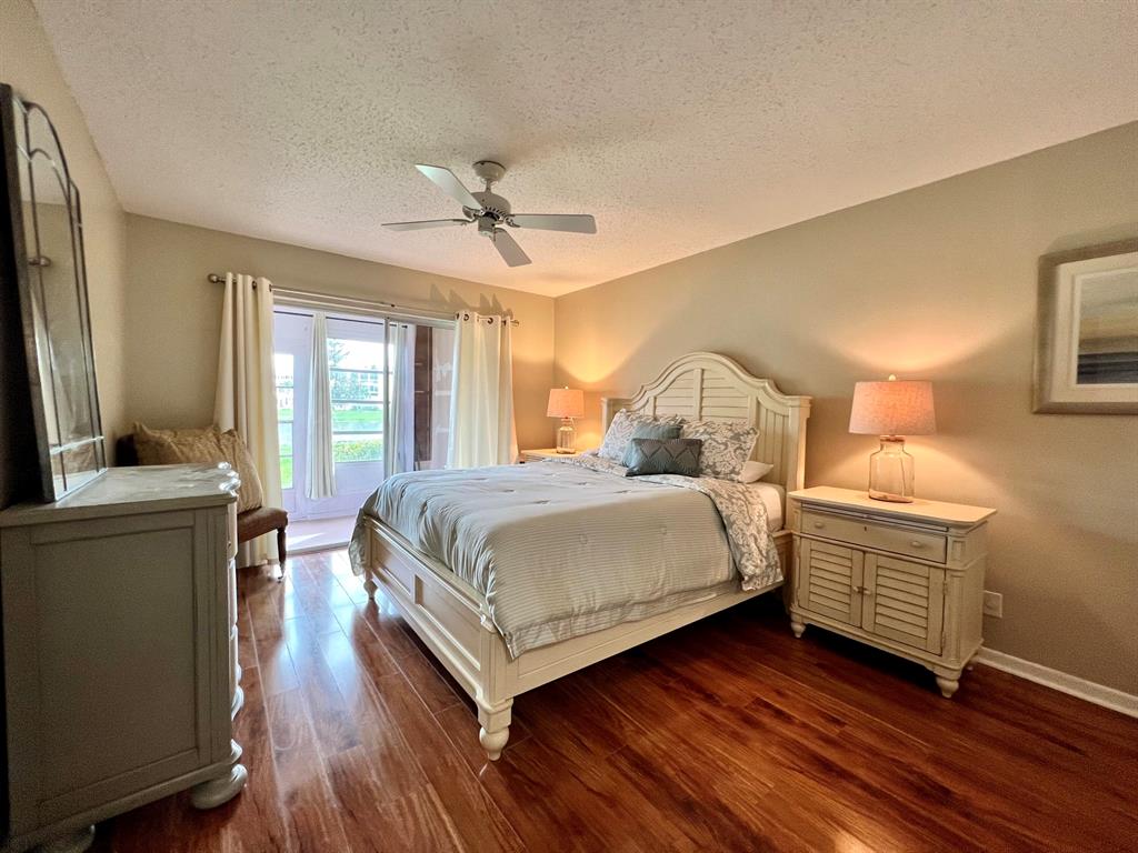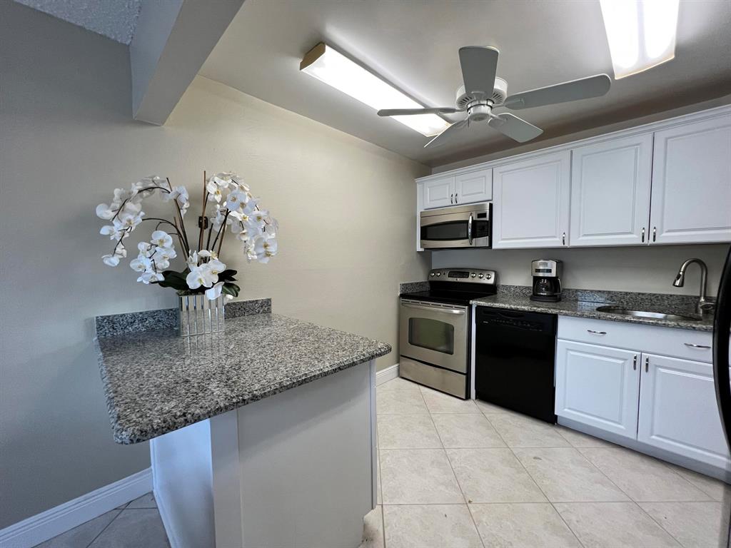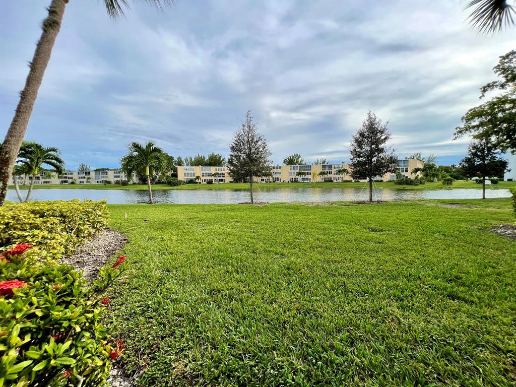 Beautiful waterfront FIRST FLOOR condo in the desirable Wellington section of 55+ Century Village! Lovely setting with views of the water and green space from the enclosed lanai. Updated kitchen with white cabinets and granite counters. Neutral tile floors, set on the diagonal, in the living area. Gleaming wood floors in the bedrooms. Sold furnished with tasteful quality furnishings. Steps from your front door to your parking spot. Sold AS IS. Century Village is a 55+ community with so much to offer...