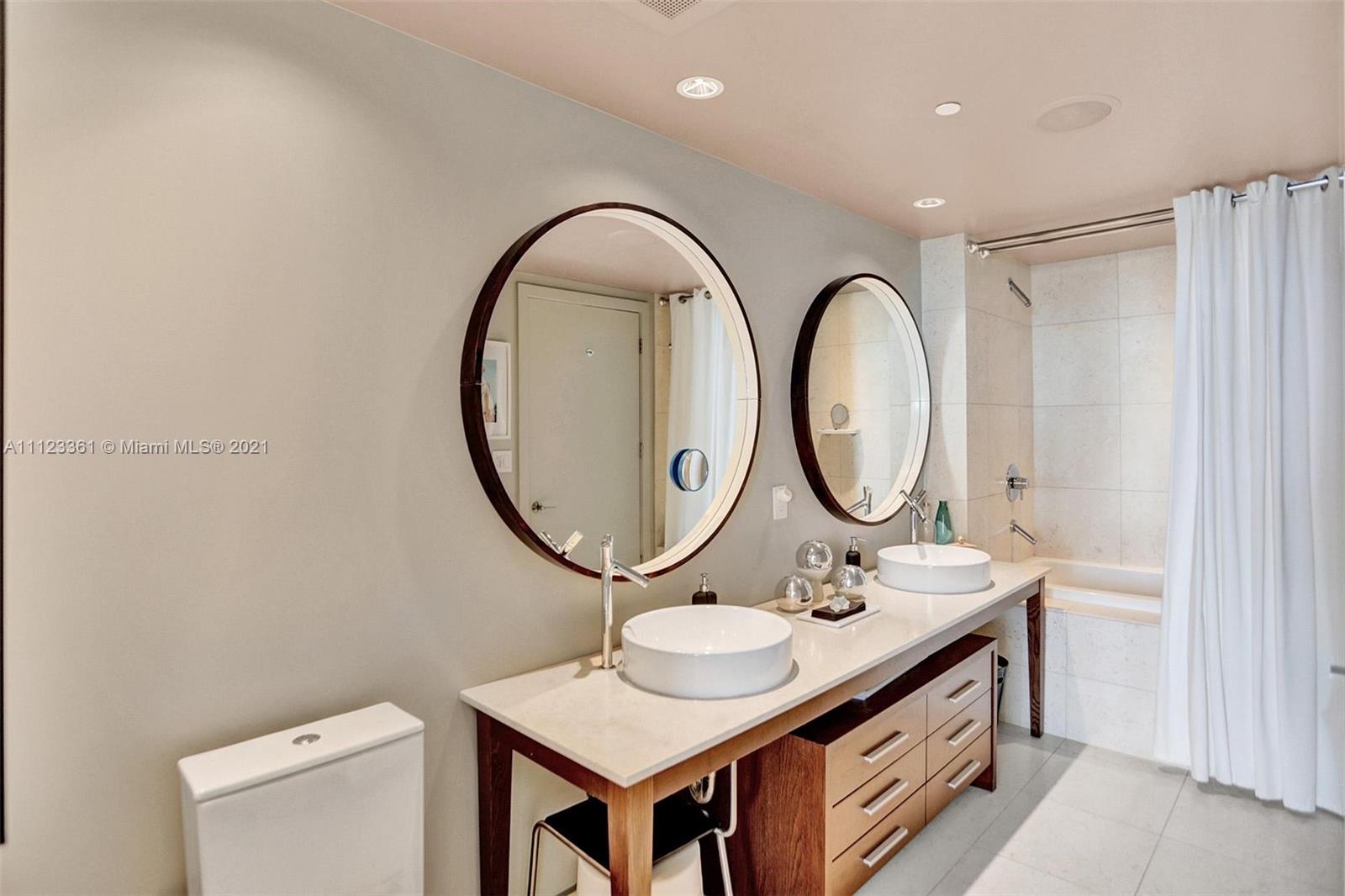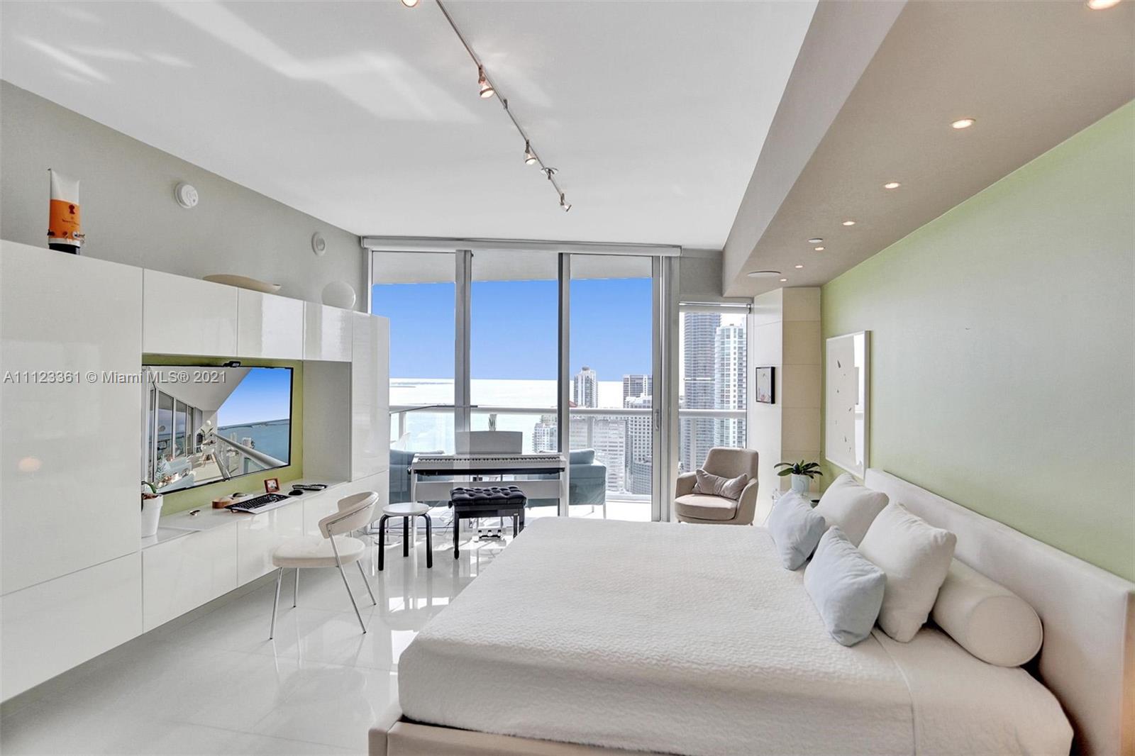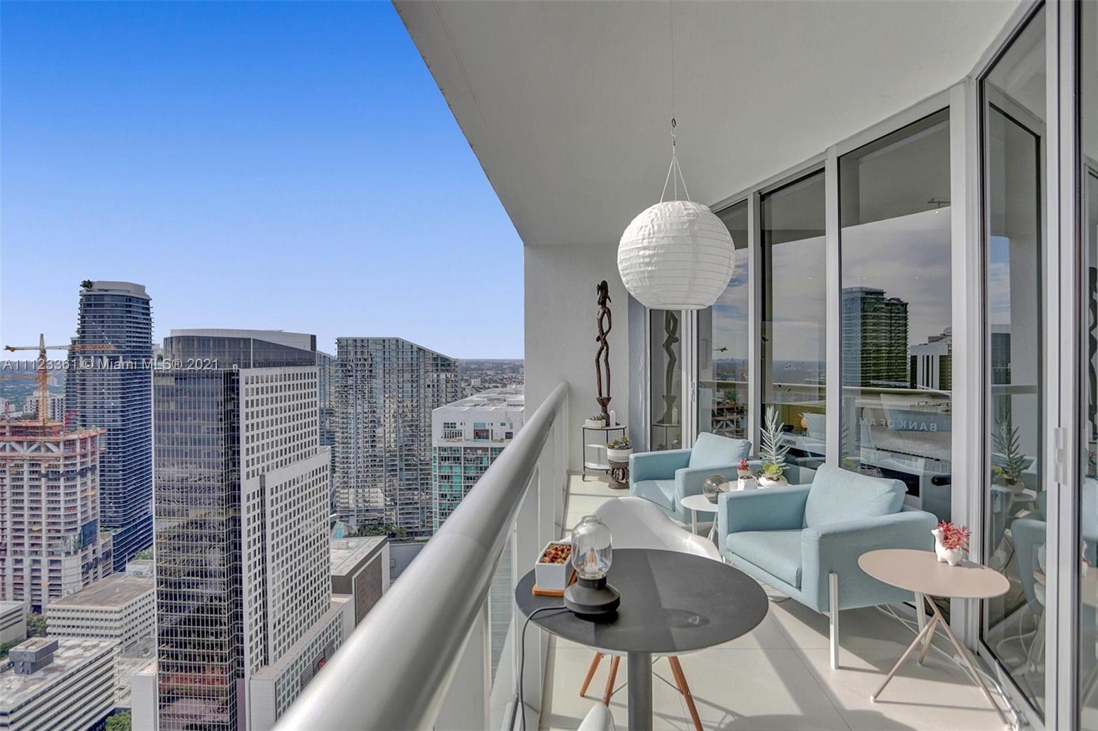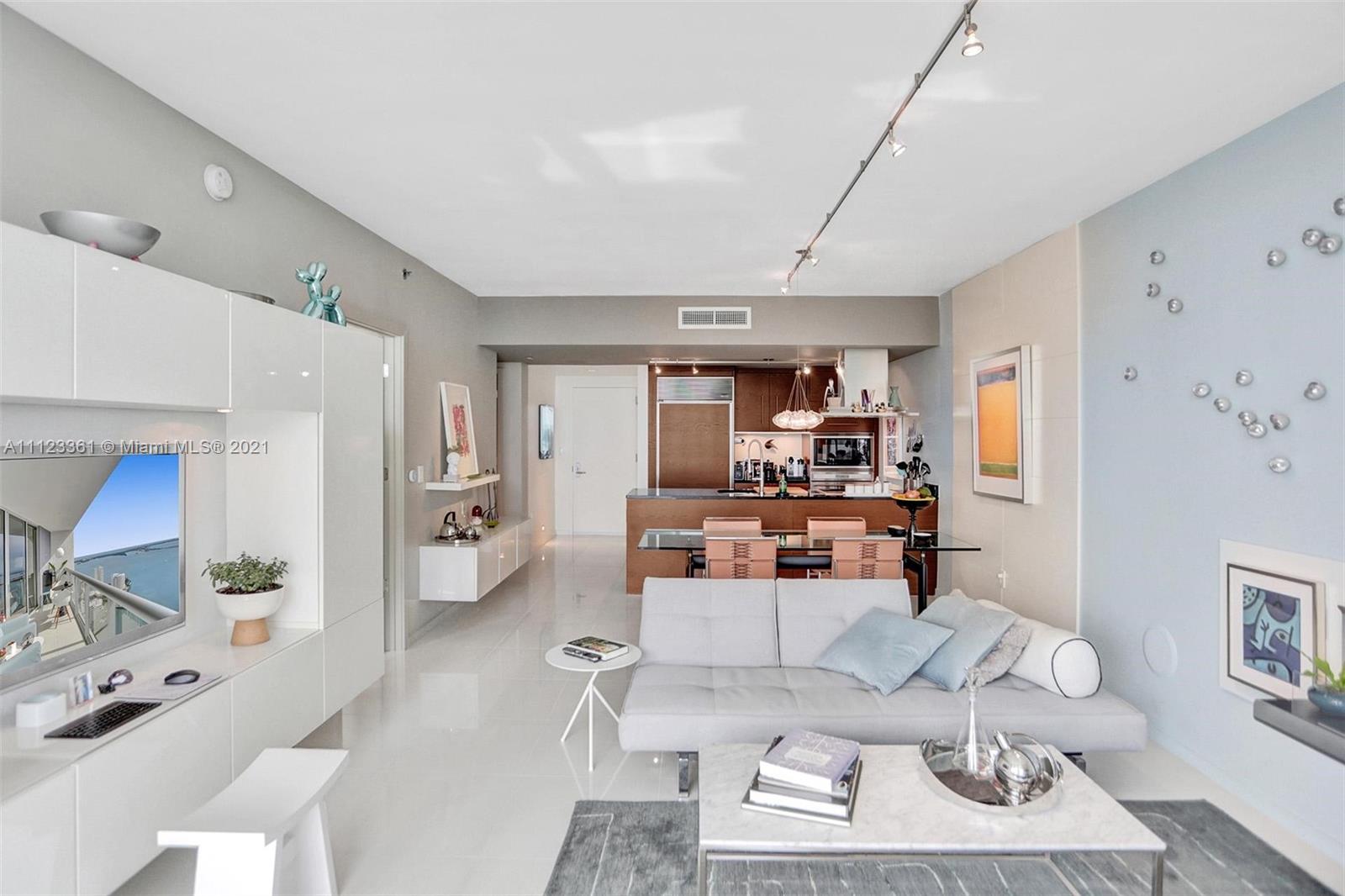 Beautifully designed and professionally decorated! There is no other unit like it! This residence offers incredible high floor bay and magical city views along with amazing finishes and tech automation! Features include beautiful 24X24 interior white glossy porcelain floors -flat finish on the balcony. Custom media built-ins with storage, open kitchen with high-end appliances, Lutron controlled light switches, track lighting and dining room light fixture by tech lighting, nest thermostat, built-in wall speakers, built-in ethanol fireplace, wireless outdoor Sonos speaker, led light strip on balcony. Bedroom has walk-in closet with custom built-ins, en-suite bathroom with double sinks and mirrors. 2 TV’s and 2 DVD’s also included. Live at one of the most desirable addresses in Miami.