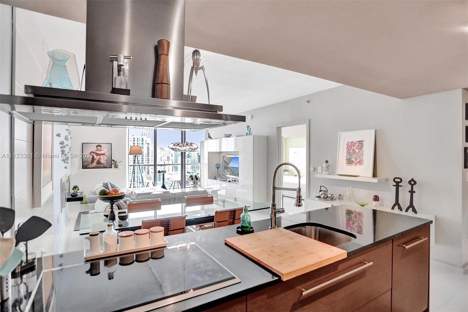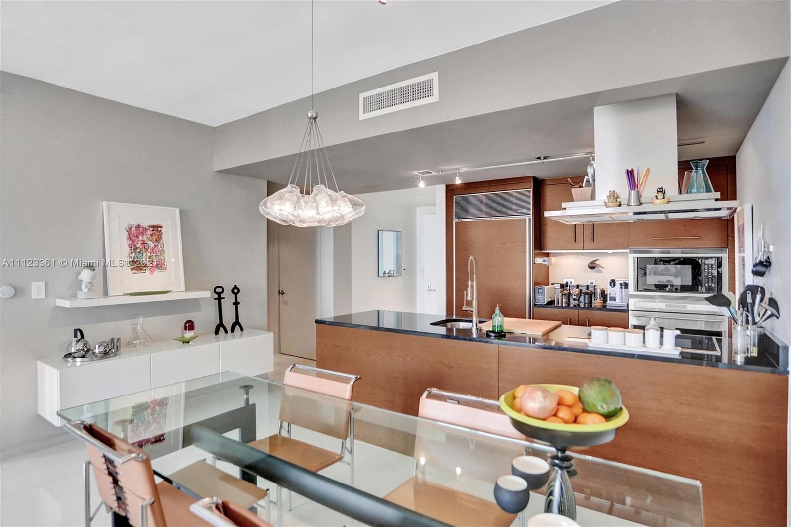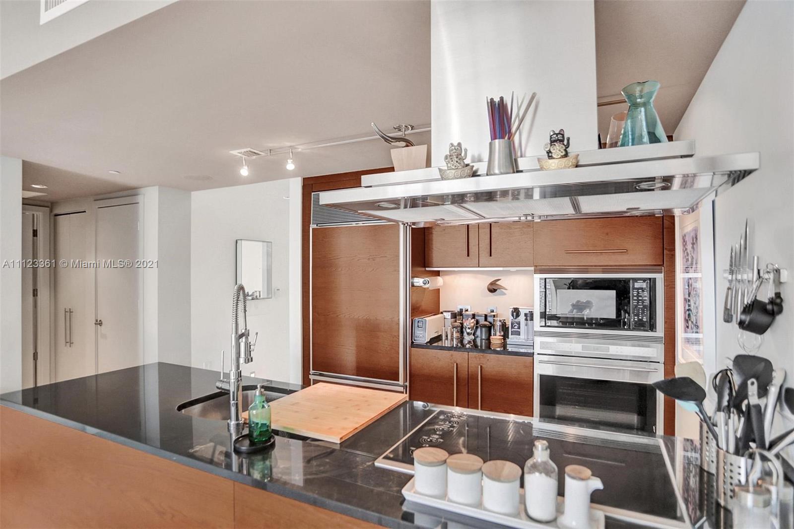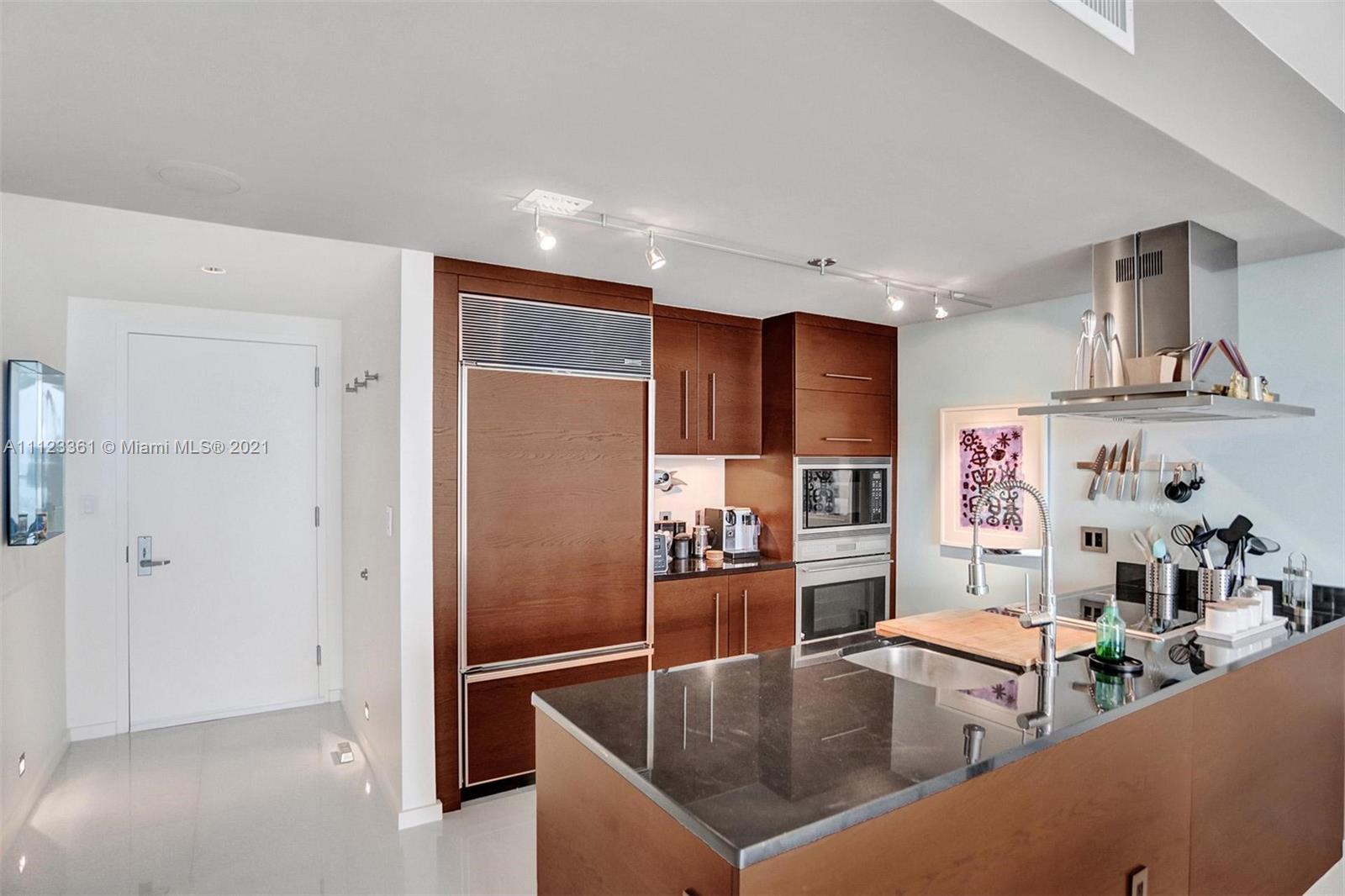 Beautifully designed and professionally decorated! There is no other unit like it! This residence offers incredible high floor bay and magical city views along with amazing finishes and tech automation! Features include beautiful 24X24 interior white glossy porcelain floors -flat finish on the balcony. Custom media built-ins with storage, open kitchen with high-end appliances, Lutron controlled light switches, track lighting and dining room light fixture by tech lighting, nest thermostat, built-in wall speakers, built-in ethanol fireplace, wireless outdoor Sonos speaker, led light strip on balcony. Bedroom has walk-in closet with custom built-ins, en-suite bathroom with double sinks and mirrors. 2 TV’s and 2 DVD’s also included. Live at one of the most desirable addresses in Miami.
