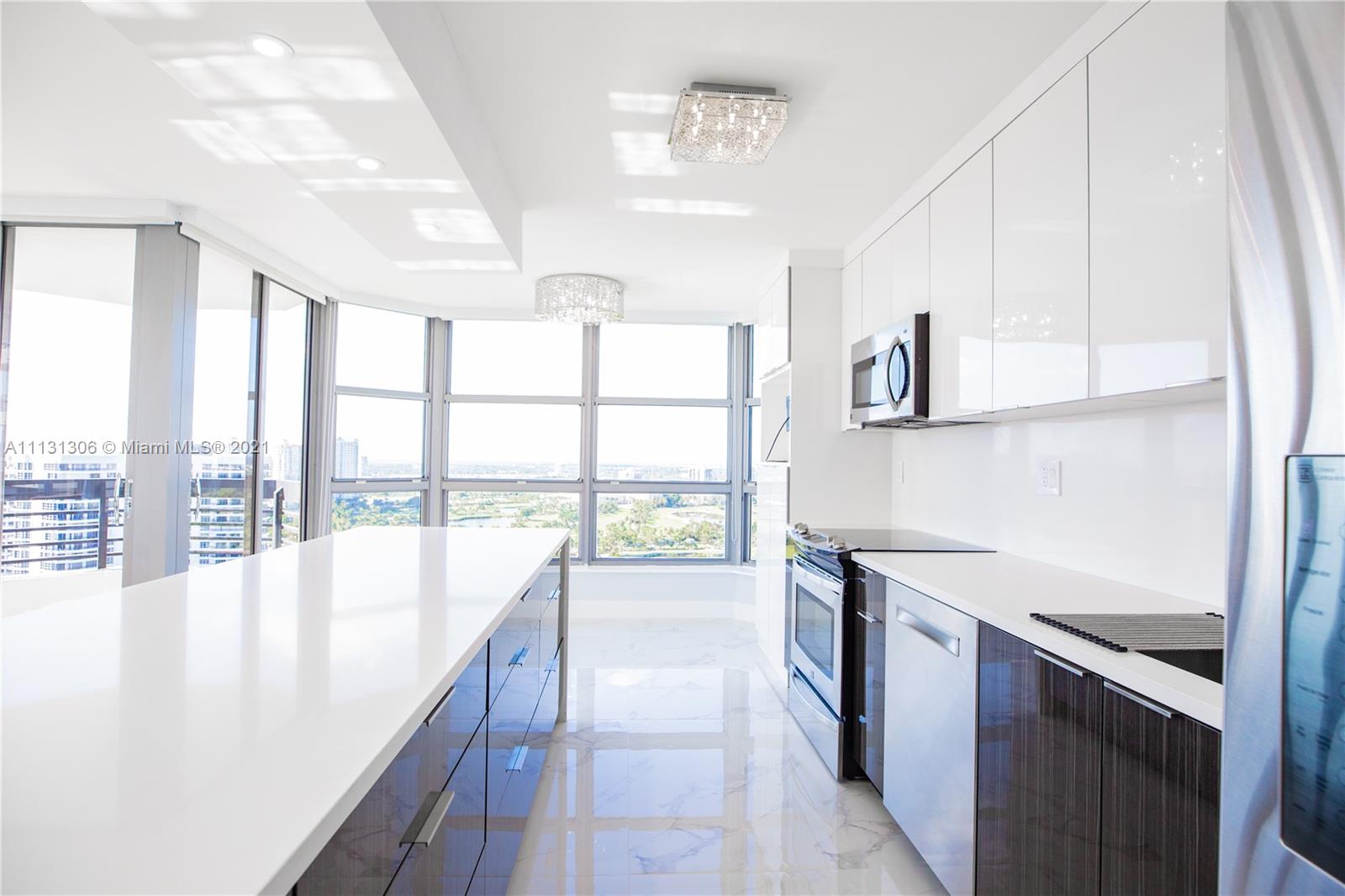 Amazing completely remodeled 2 beds plus den & 2 full bathrooms.Enjoy the most beautiful and spectacular panoramic views of Bay,Turnberry Golf course,skyline and from this spacious apartment in the prestigious Mystic Pointe.Natural lights flowing through this modern apartment located on the 35th floor.Apartment features an exquisite open kitchen with new stainless steel appliances.Unit features exquisite bathrooms, separate new washer and dryer in the unit. Entire home has tile throughout. Wrap-around balcony with breathtaking views. Full building amenities including: Fitness center, heated pool,library,7 clay tennis courts,2 pickle ball courts,1 basketball court and dog park,mini market, beauty salon and restaurant. Mystic Pointe is a desirable and all-inclusive 24 hours gated community.
