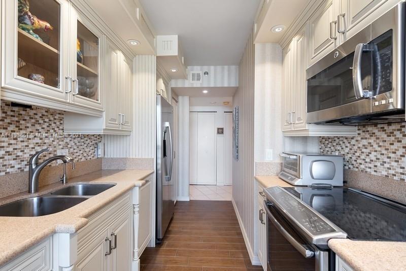 Enjoy panoramic, East views from this impeccable, 1230sf 2/2 currently set up as a 1 bedroom convertible in desirable Williams Island. The fine detail of the beautifully remodeled traditional style eat-in kitchen is sure to please. This condo is a closet lover’s dream with 8 custom closets in all, with 4 alone in the primary bedroom. The open den area can be converted to a bedroom, but currently has a built in wall unit with drawers & closets. Enjoy the wonderful community amenities..a 27,000sf spa with classes & indoor swimming pool, a 16 court tennis & pickle ball club, 3 restaurants, social events, an onsite marina & courtesy bus. Tranquility in the heart of the city! Cash offers only.