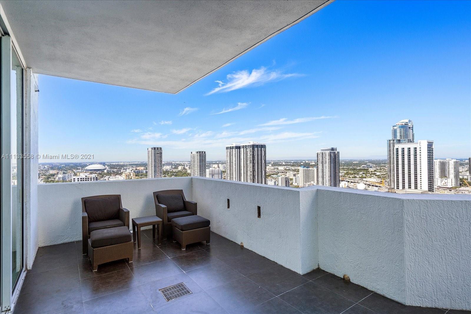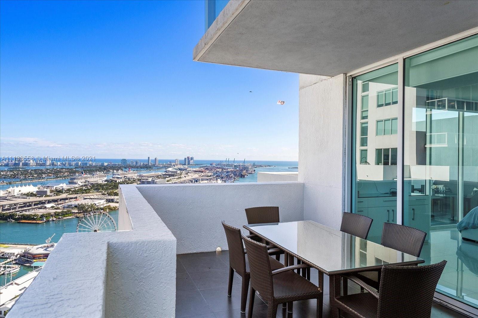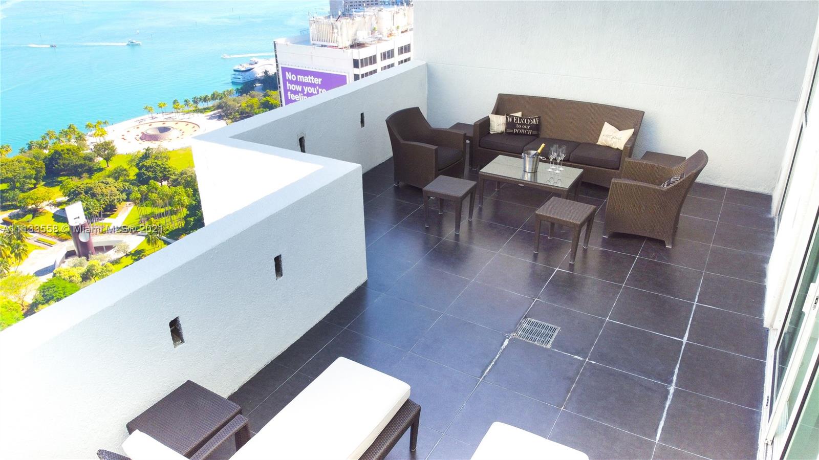 Attention buyers, rare opportunity! Lower penthouse corner unit 3 br/3 ba 1795 sqft with over 1500 sqft outdoor living space. Imagine drinking your morning coffee on this sprawling, wrap-around balcony with stunning Ocean views. The unit is located on the 40th floor with 180-degree views of sunrises east over Biscayne Bay and sunsets west over downtown Miami. Split floor plan with large private balcony in master bedroom suite. Kitchen with granite countertops, Miele appliance, additional under-counter Double Drawer Refrigerator, eat in kitchen, kitchen bar and mirrored doors. Best luxury condo downtown with over 3000 square-foot indoor/outdoor living space. Great building with 24 hr. Concierge, clubhouse, spa, gym, 4 pools, Jacuzzi, movie theater, billiard, ping pong an on-site bar.