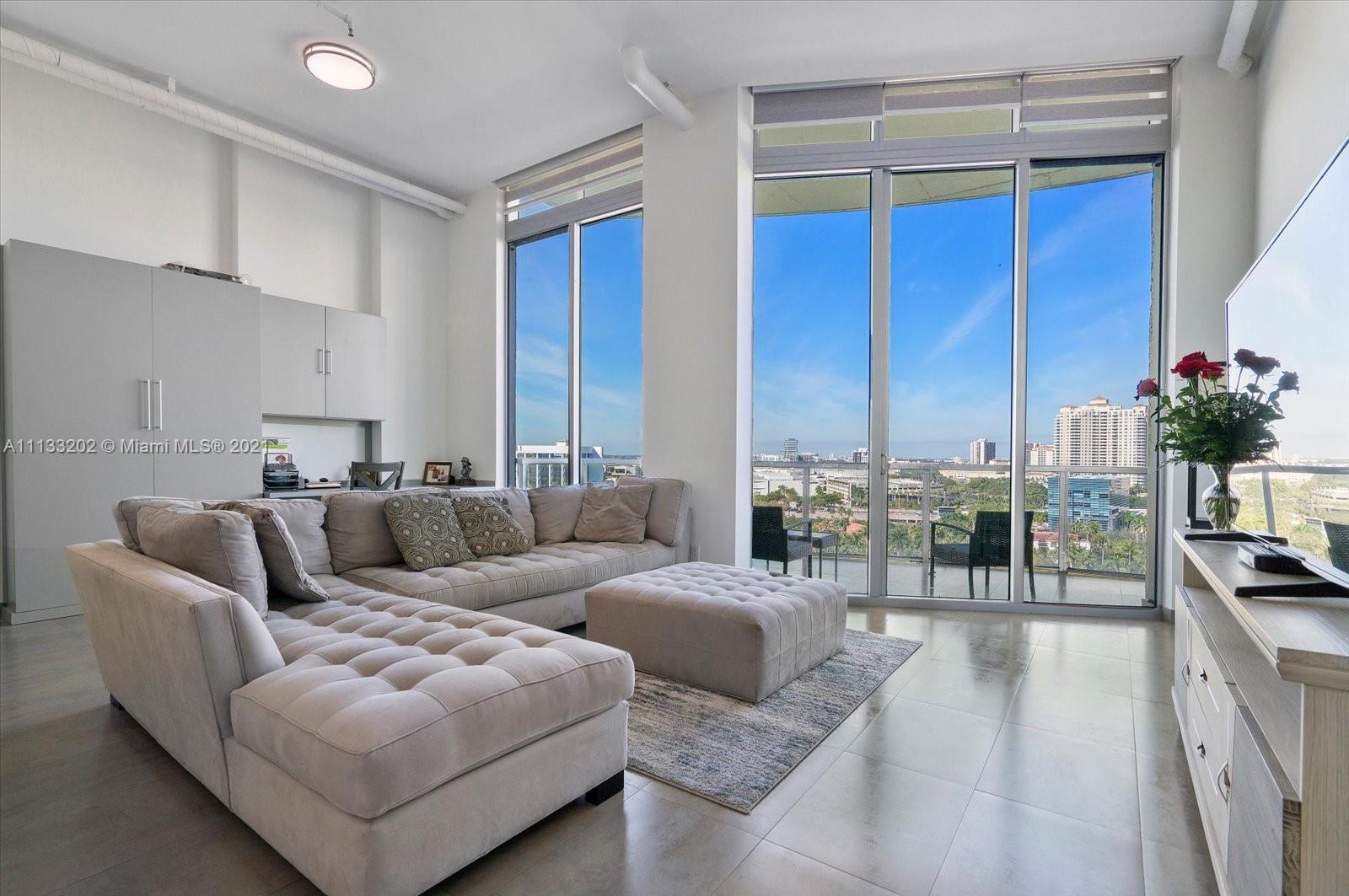 Beautiful penthouse with impressive views; Modern and tastefully updated loft with 14 foot high ceilings and private furnished 510 Sq ft. Roof Top Terrace, with unobstructed views. Kitchen redone with updated cabinets, new backsplash, and new installed wine cooler. Brand new custom-built 10 feet high bedroom closets with clothing racks and built-in dresser drawers. Brand new custom-designed office with 8 foot high built-in cabinets for additional clothing space, and custom cabinets installed over the office, for additional office storage space. Marble flooring throughout the unit-including the Patio area. New Lighting, Fans, and chandelier throughout the Loft. Updated Bathrooms; new LED Mirrors and new light fixtures. Unit completely newly painted and sold furnished.