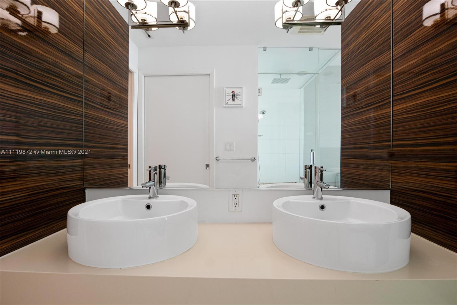 Wake up to direct Bay water views through floor-to-ceiling glass windows. This spacious 1,666 SF,2Beds+Den/2Bth home added SF with wet-bar converted from foyer + more entertainment spaces than other units, including oversized terr./exterior dining. 2 balcony terraces, each connect to a bedroom, both Bay sunrises & City skyline sunsets. Designer-appointed details: wood-lined walls & collector's entrance door, fabulous Bth sink & fixtures, wood floors throughout. Features include spacious wardrobe closets, laundry room, sub-zero appliances, & views from all rooms. Building amenities: 24 hr. concierge, fitness center w/spa & Bay views, Two pools w/cabanas, game room, kids room, barbecue area, private club room, Valet parking, Business center, Pilates studio & movie room.