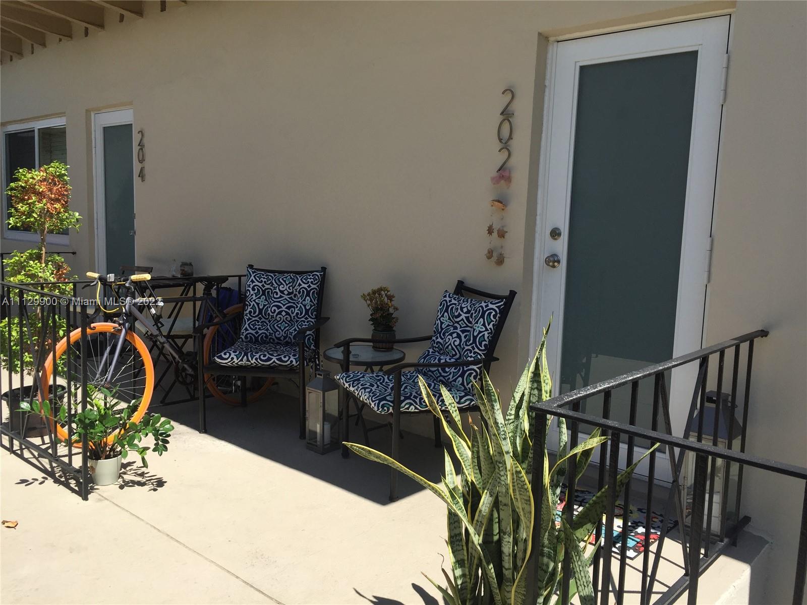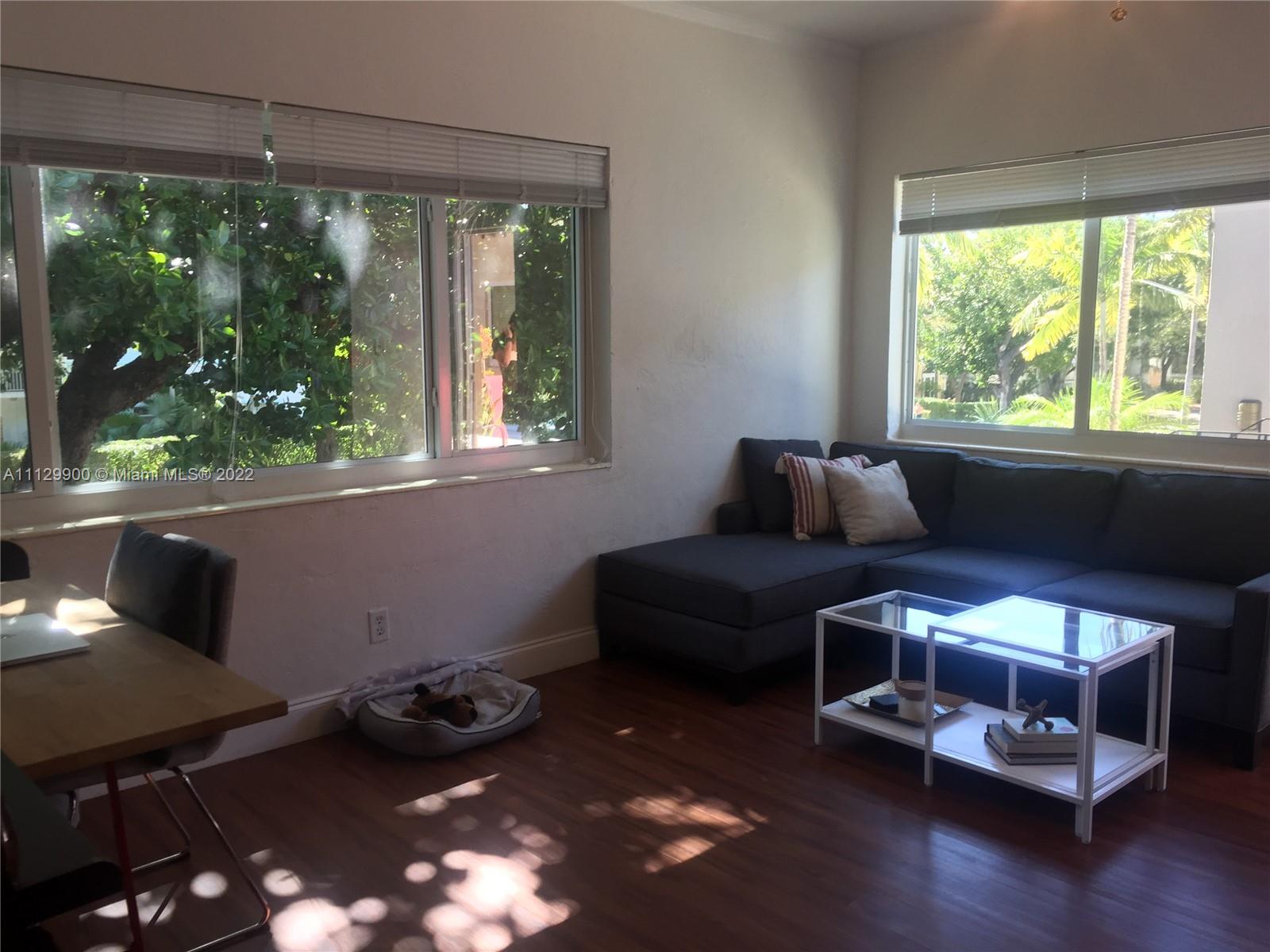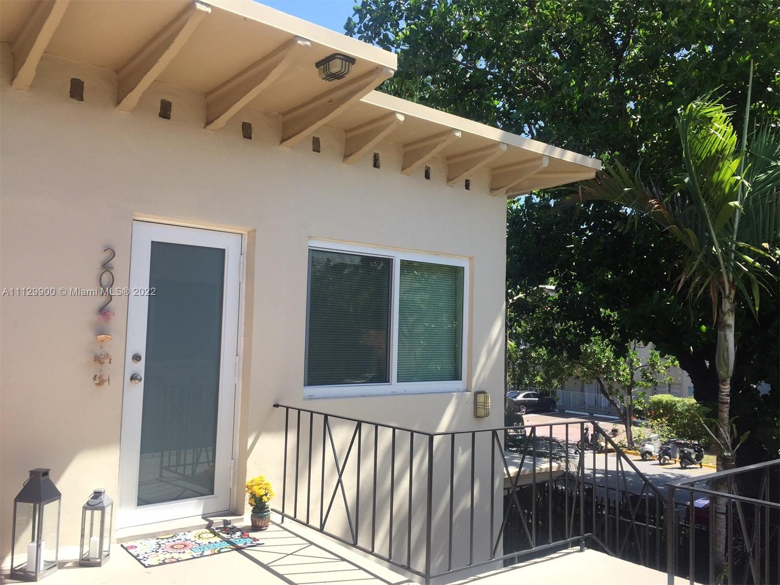 Best unit in the building! Corner 1/1 on top floor with beautiful views of the garden and leafy Meridian Avenue. Condo has large kitchen, washer and dryer, central ac, impact windows, laminate floors, and private outdoor patio. Excellently maintained building with low monthly HOA. Quiet, professional neighbors and dogs up to 40 lbs are allowed. 900 Meridian is a historic, art deco building that's an easy walk to the ocean, park, and shops.