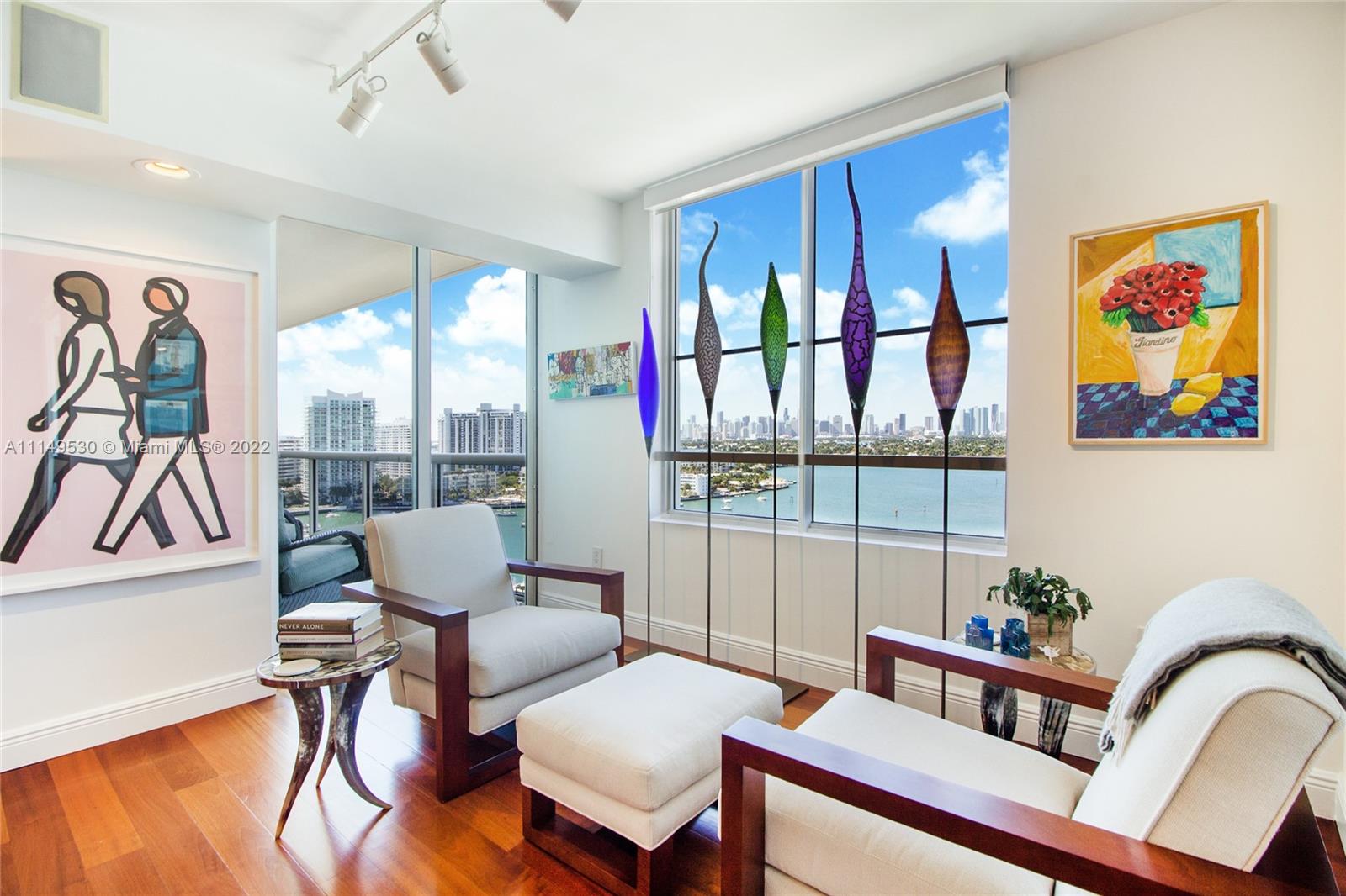 Spectacular custom combined two condos with panoramic views of Biscayne Bay, Sunset Islands and Miami’s skyline, rarely available in Sunset Harbour North condo tower. Remodeled Sunset Harbor North corner residence with 2,350sf split floor plan featuring three large bedrooms + Den with three balconies. Interior features include wood flooring, custom kitchen with quartz countertops, custom cabinetry & built-ins, w/sound system throughout. Full-service building with full amenities & two swimming pools. Located in one of the most desirable neighborhoods in Miami Beach, with a wide range of shopping and dining options at your doorstep. Condo comes with two deeded parking spaces