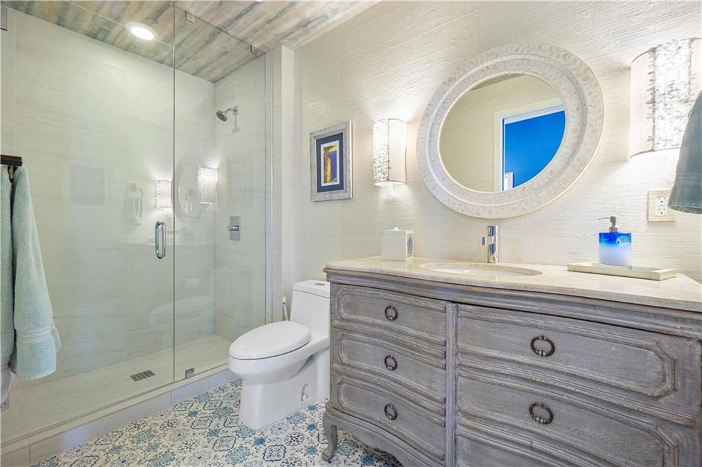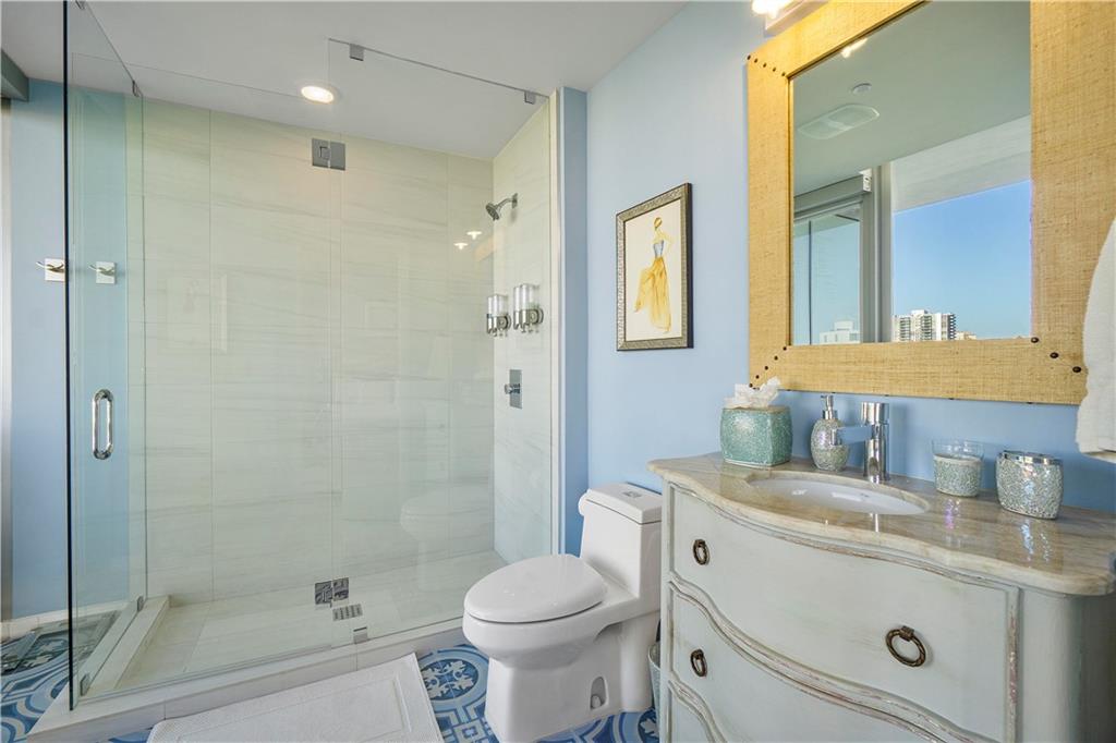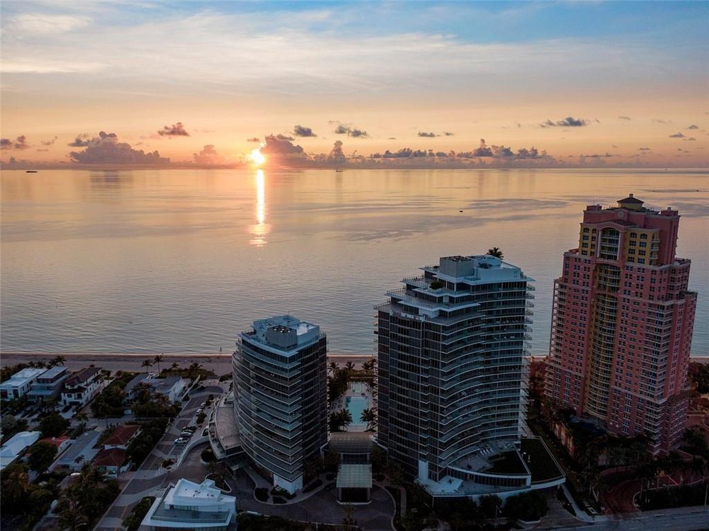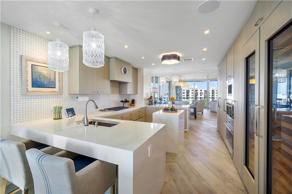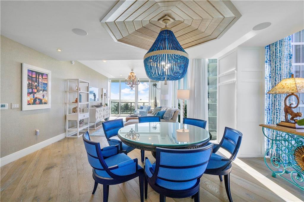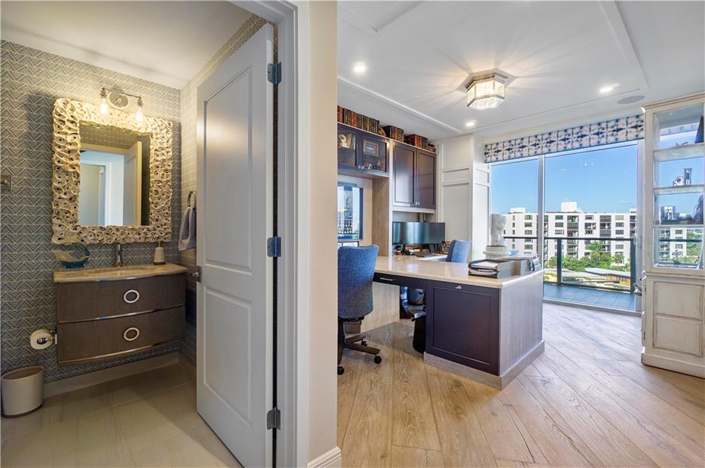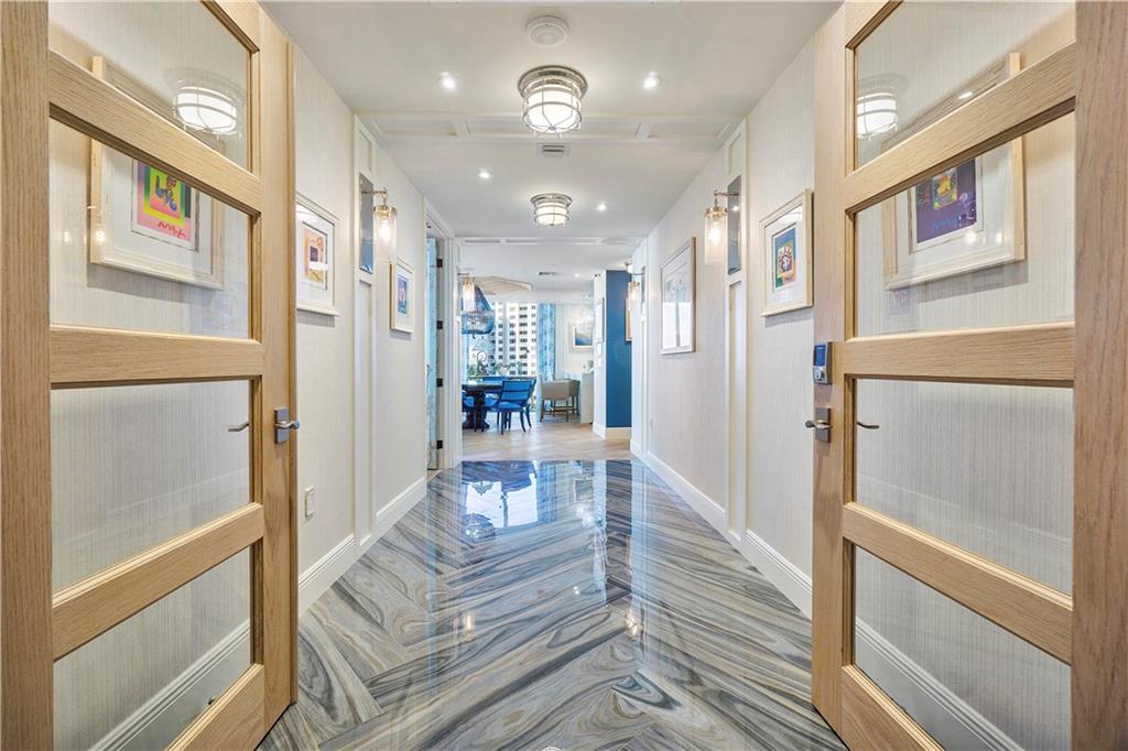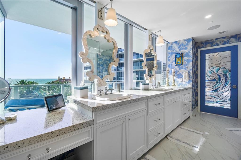 This exquisite corner flow-through floor plan stretches E to W providing direct sunrise ocean views & sunset city views w/an expansive terrace on each end. Enter through a private foyer & capture the stunning blue porcelain herringbone flooring w/a custom art gallery & gorgeous octagonal custom ceiling woodwork in the dining room showcasing the chandelier. This 4 bed (1 was used to expand the media room) & 5 bath residence includes a custom built-in office, a second master built-in walk-in closet w/quartz countertops, & a Den! The unit features a hand-painted tile powder room along w/custom millwork & natural oak flooring throughout. An upgraded Control 4 system is installed & includes complete control of lights, locking, blinds (day/blackout), & security cameras all w/Alexa!