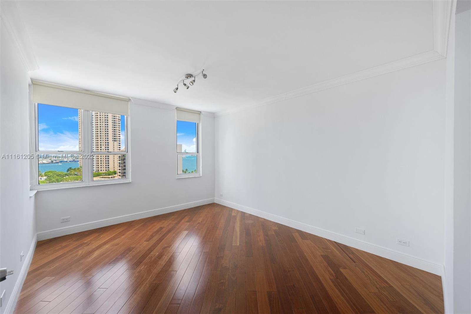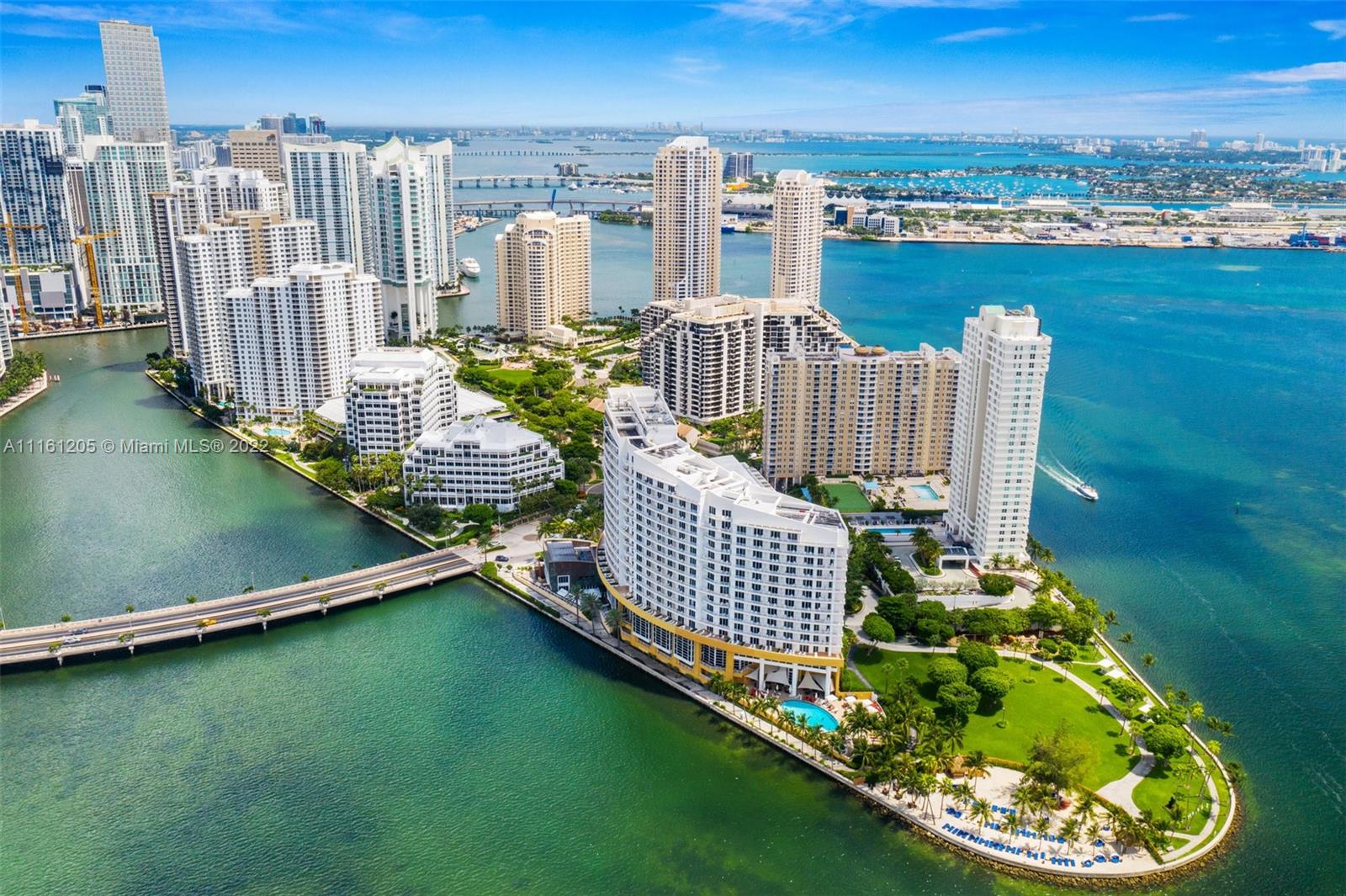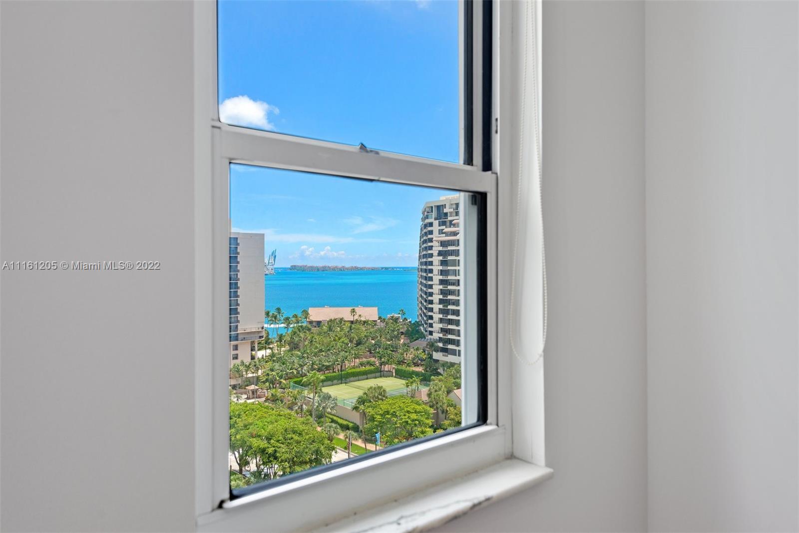 Corner unit located in Brickell Key Island. Bay views from every room. 2 bedrooms, 2 baths and 1/2 bath with hard wood floors and high impact windows and doors. All closets are finished. Sunny East exposure. Resort lifestyle with all amenities and jogging trail around the Island. Live in the heart of Brickell in a tranquil enviroment.