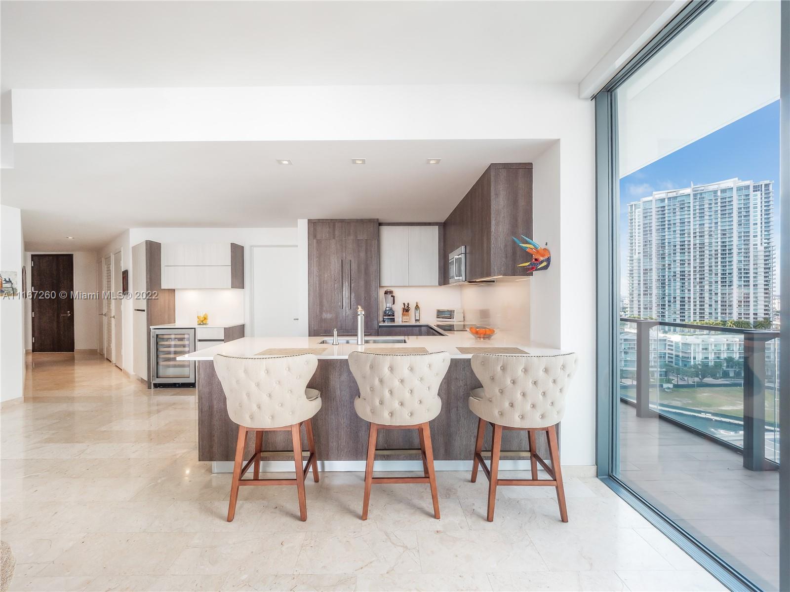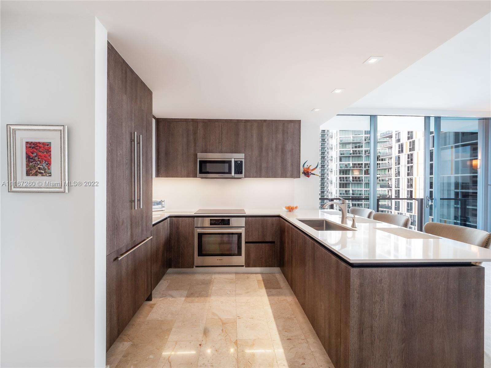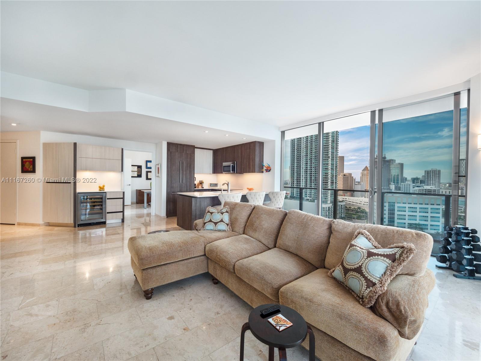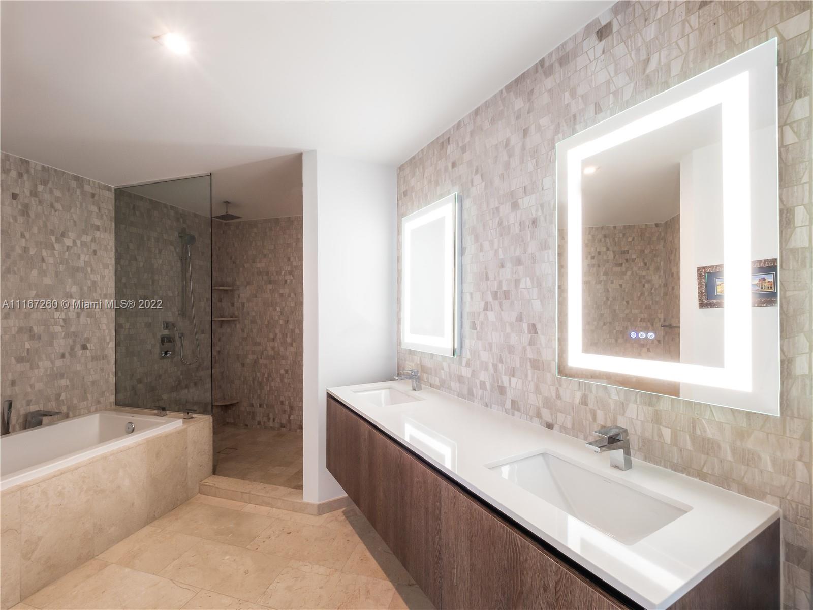 This unit is fully upgraded to give it a more practical and warmer feel. Bar / Wine Cooler station removed from the kitchen to its own stand-alone space using materials from developer with 4 extra cabinets for storage. Kitchen has upgraded cabinets. This Unit features 2 bedrooms with full walk-in closets and in suite bathrooms. The master bathroom features his/hers sinks, shower with custom shelving installed, brand new anti-fog mirrors, roll out shelves in the walk in closet, and remote controlled black out shades. The 2nd bedroom is currently used as an office with space enough for a queen-sized bed and extra linen closets in the bathroom - also equipped with remote controlled black out shades. The living room has automated / remote controlled shades and extra custom lighting throughout.